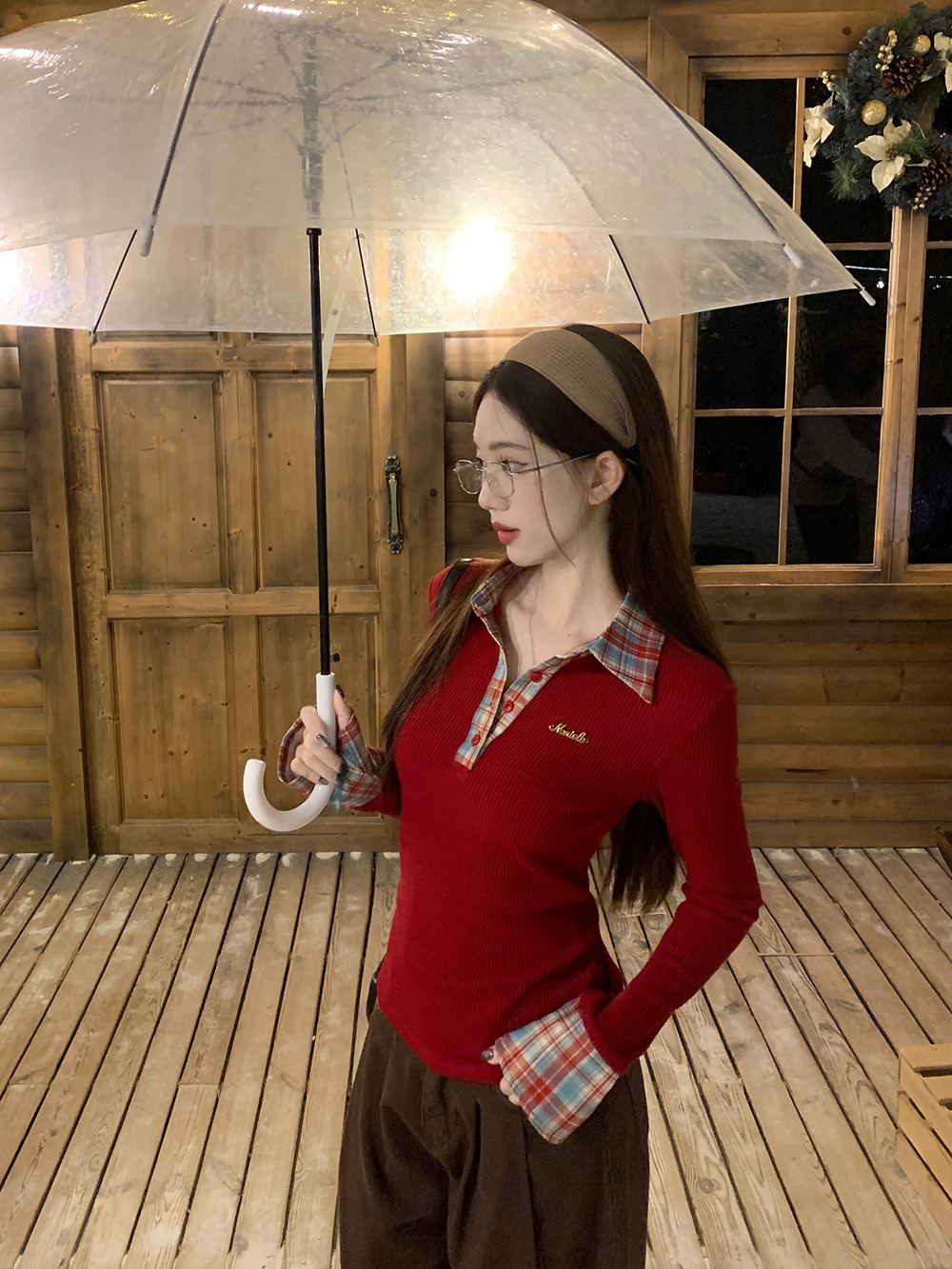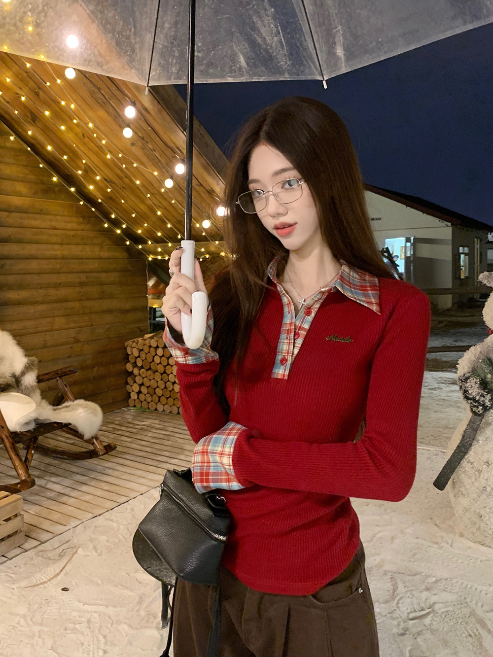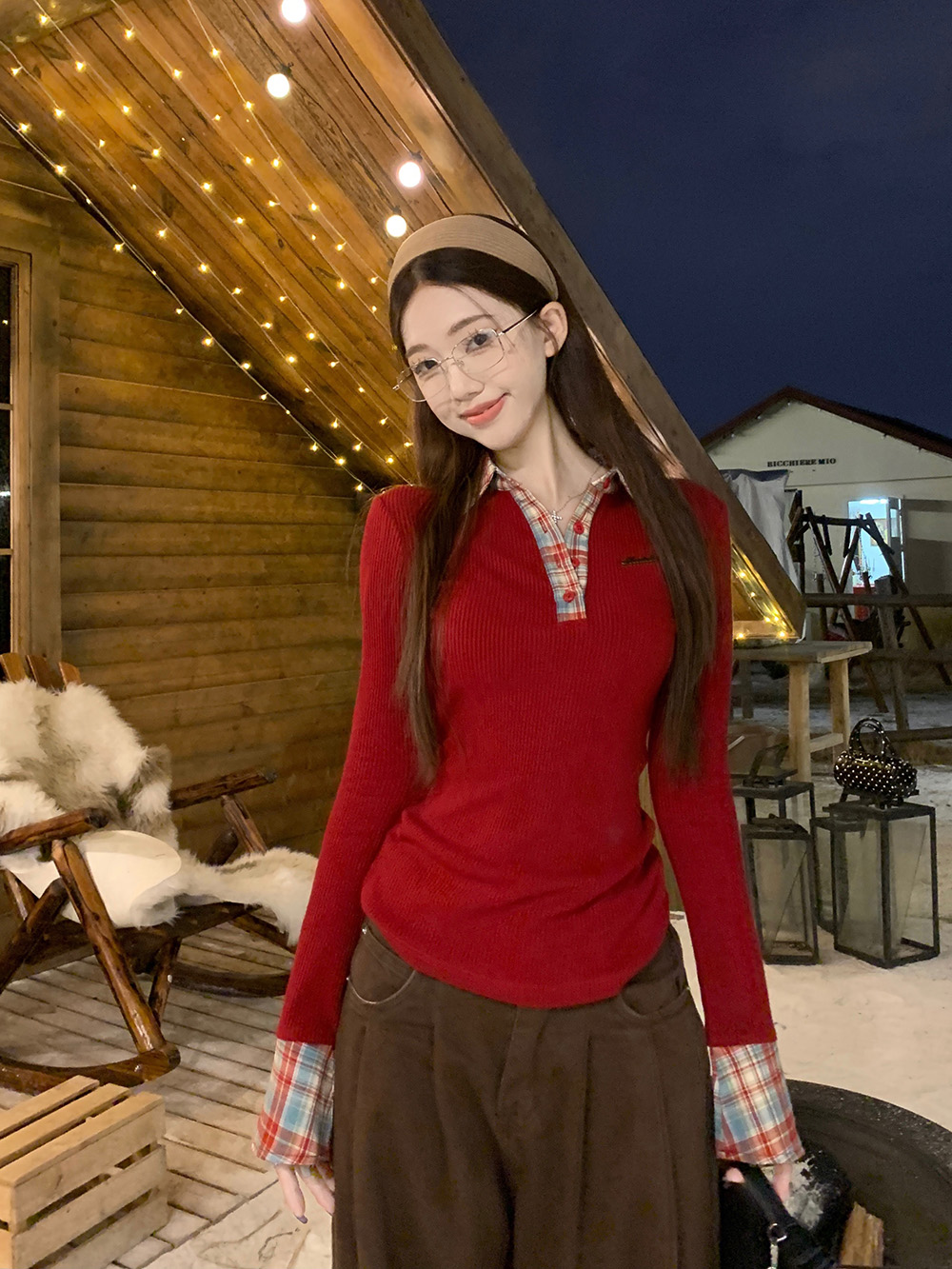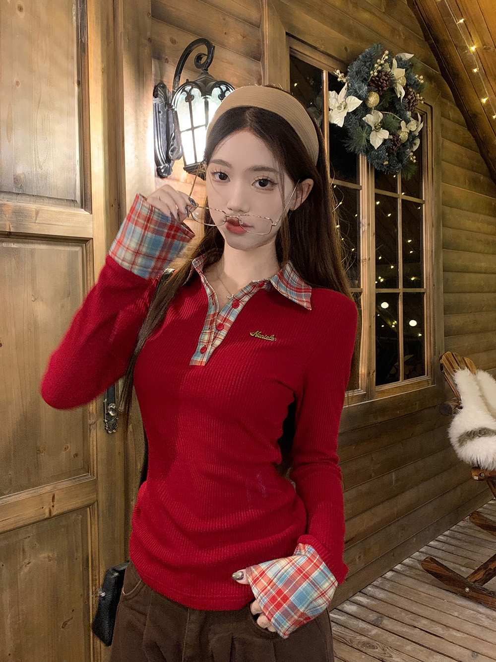 复古假两件格纹拼接长袖T恤秋冬修身内搭上衣