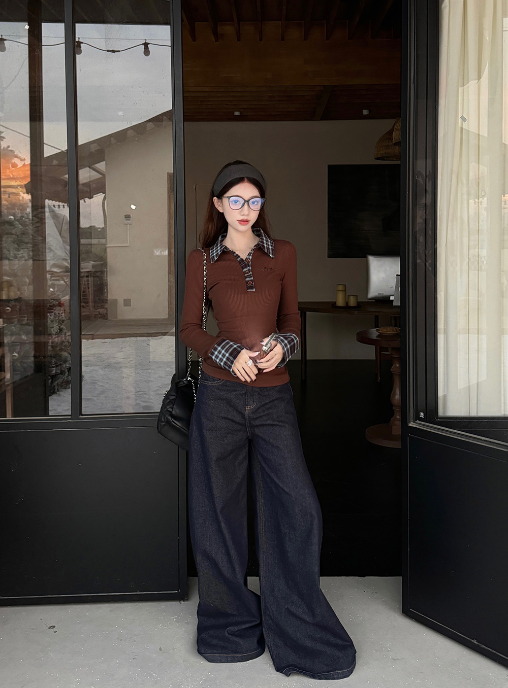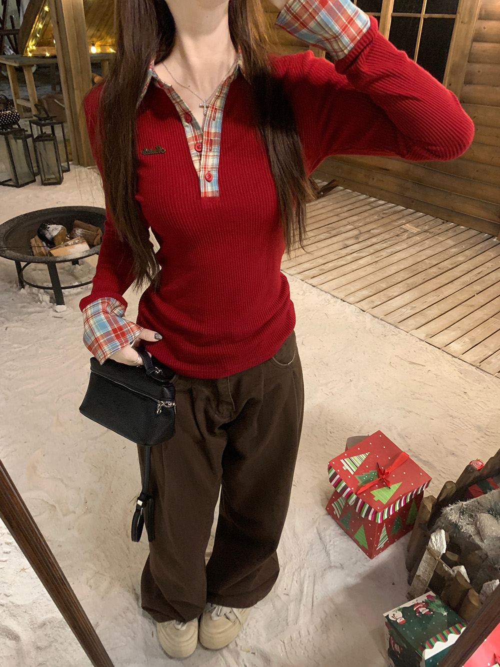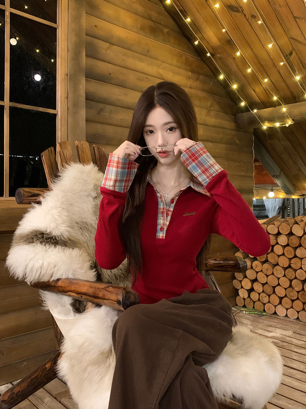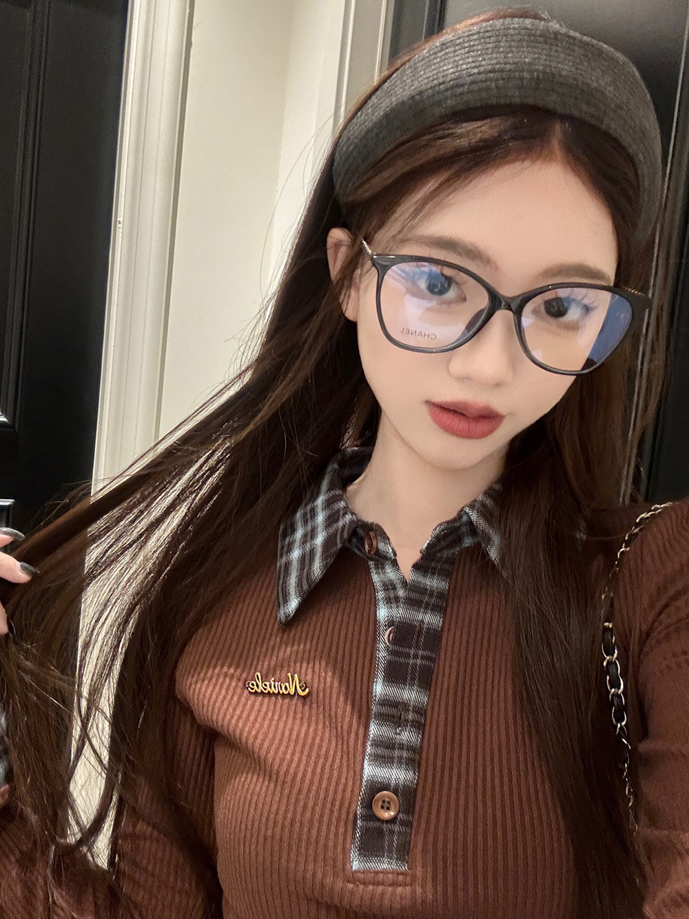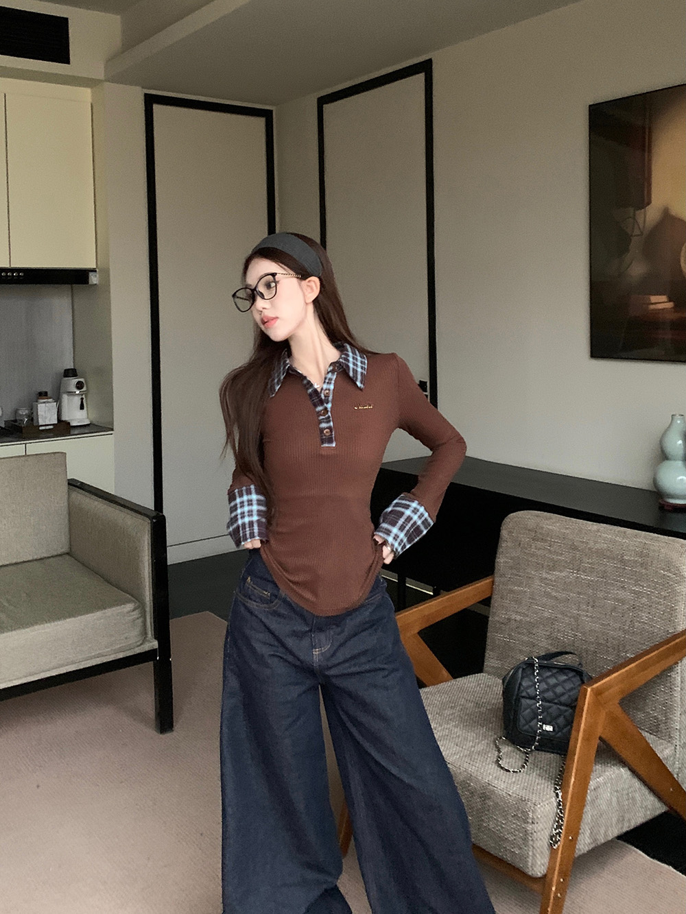复古假两件格纹拼接长袖T恤秋冬修身内搭上衣