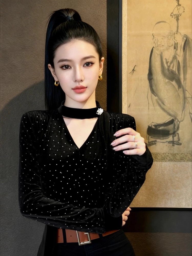 美式复古黑色镂空修身显瘦打底衫女内搭秋冬绝美正肩丝绒长袖上衣