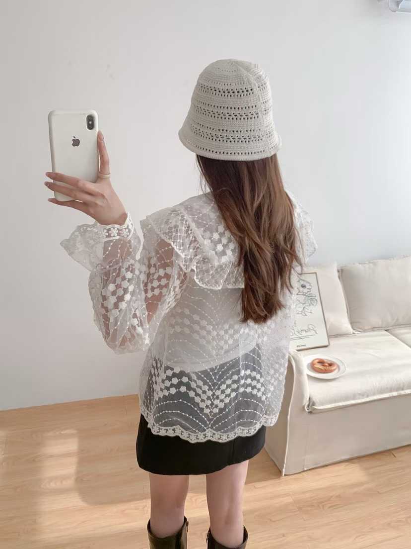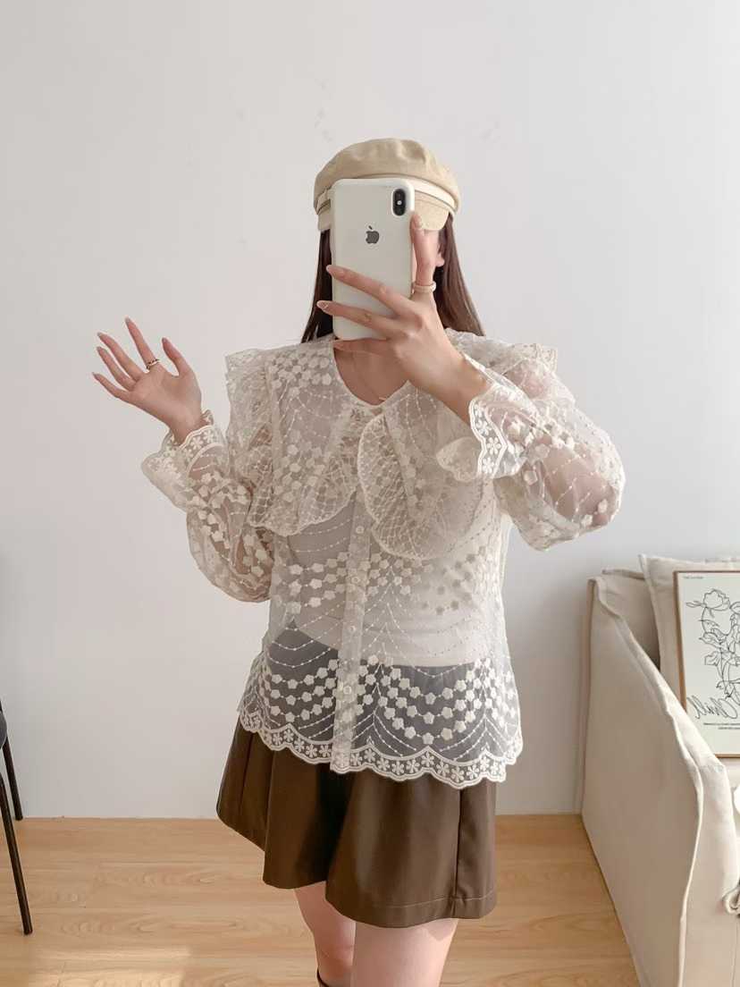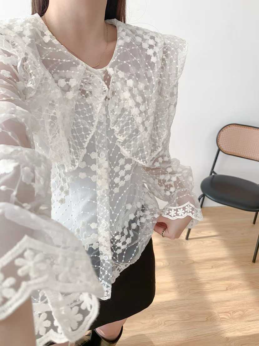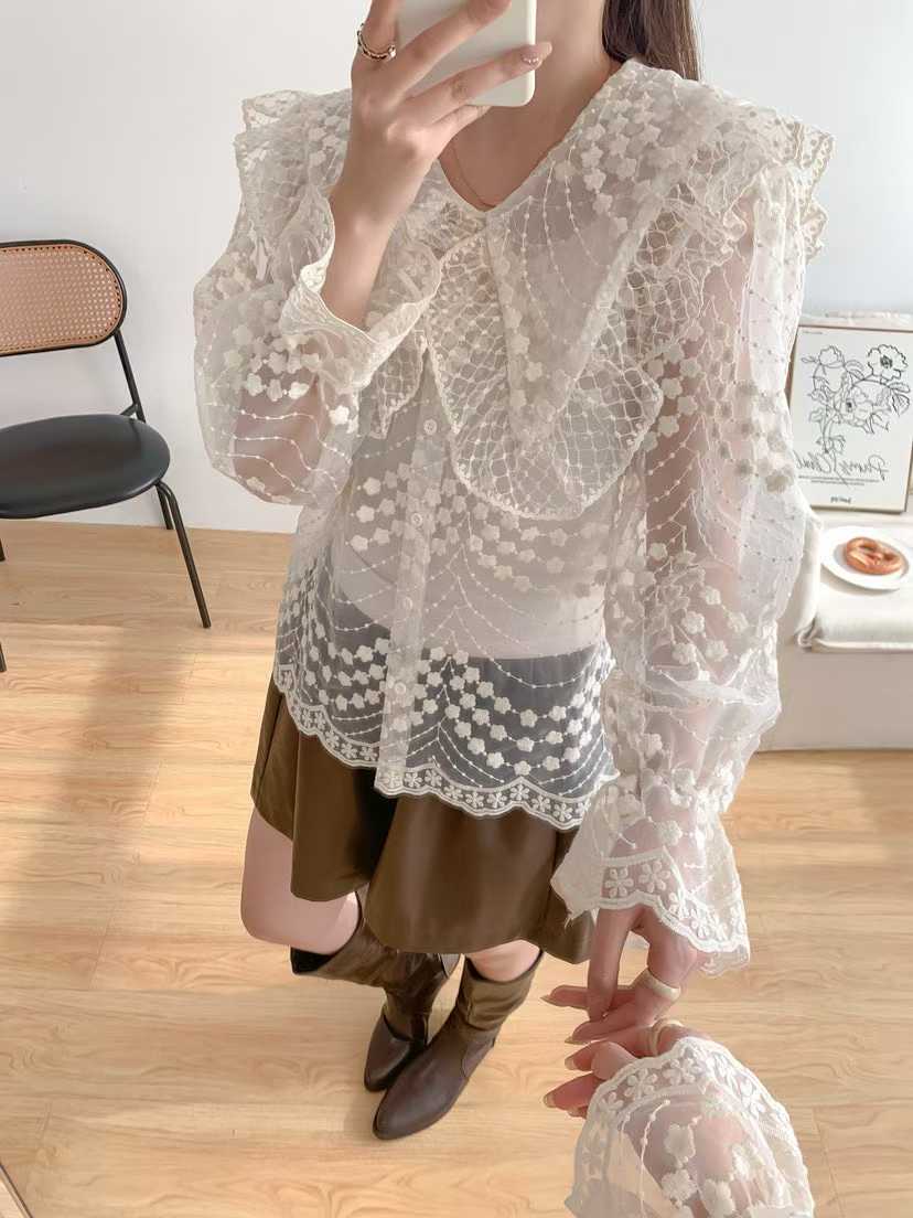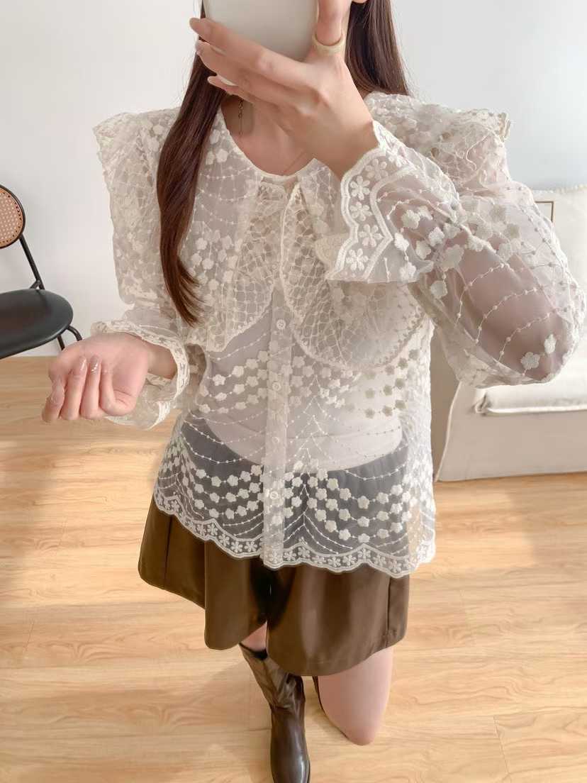 韩国新款洛丽塔娃娃领重工绣花喇叭袖透视蕾丝衫长袖衬衣女配带吊