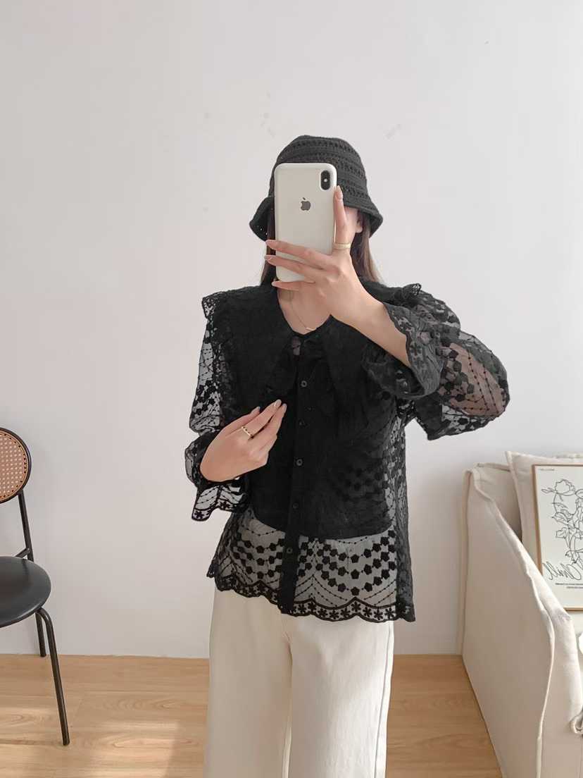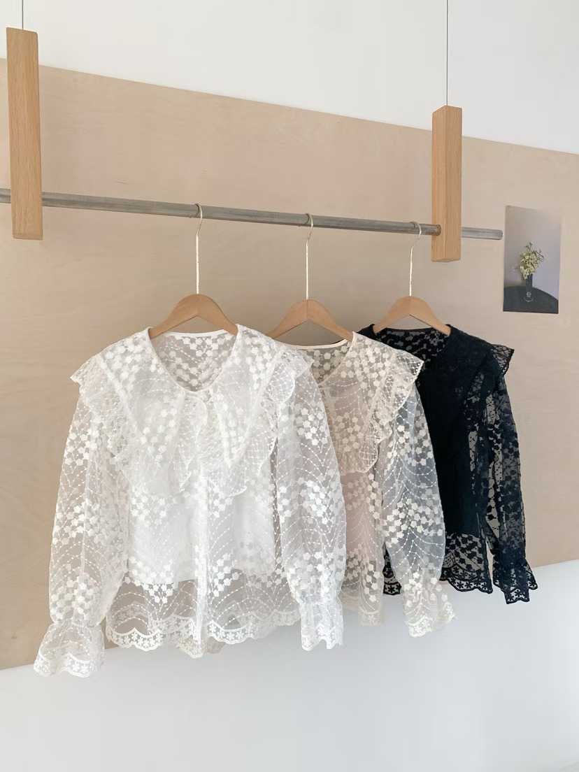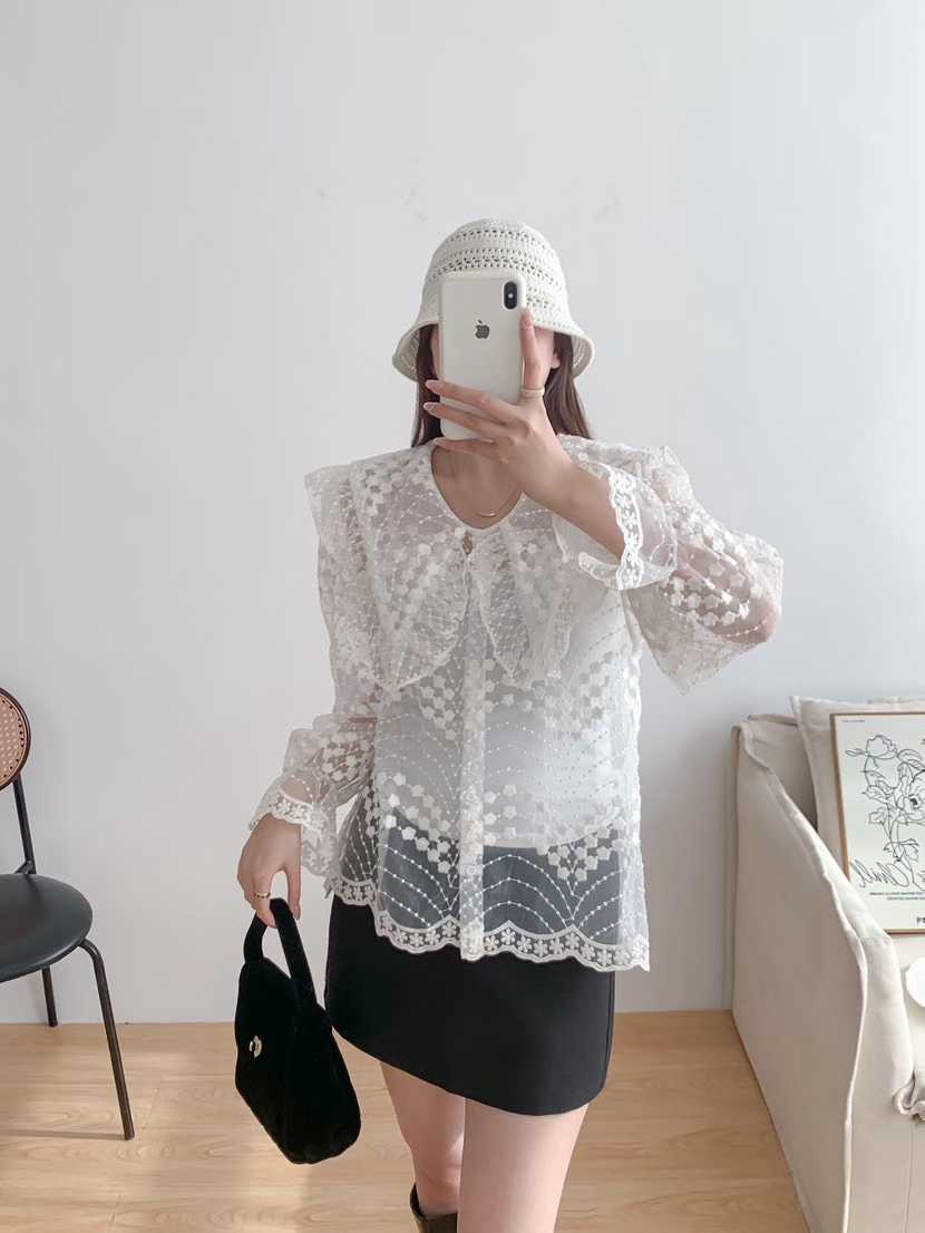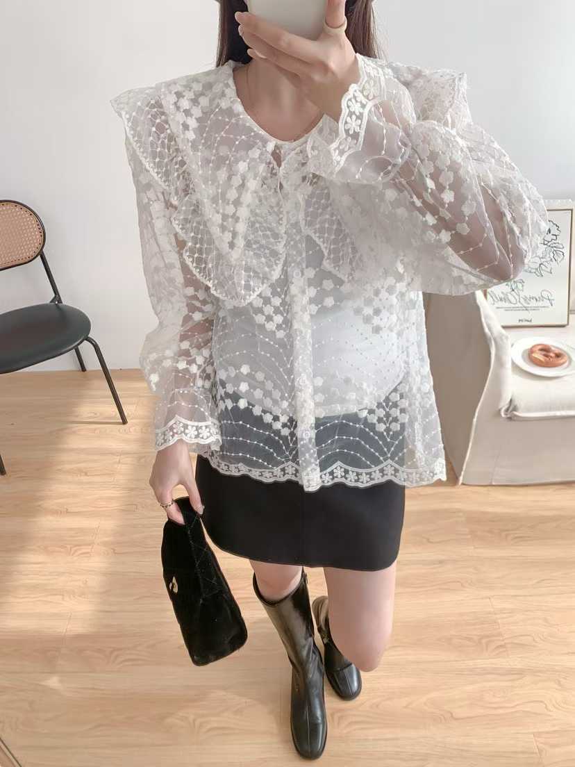 韩国新款洛丽塔娃娃领重工绣花喇叭袖透视蕾丝衫长袖衬衣女配带吊