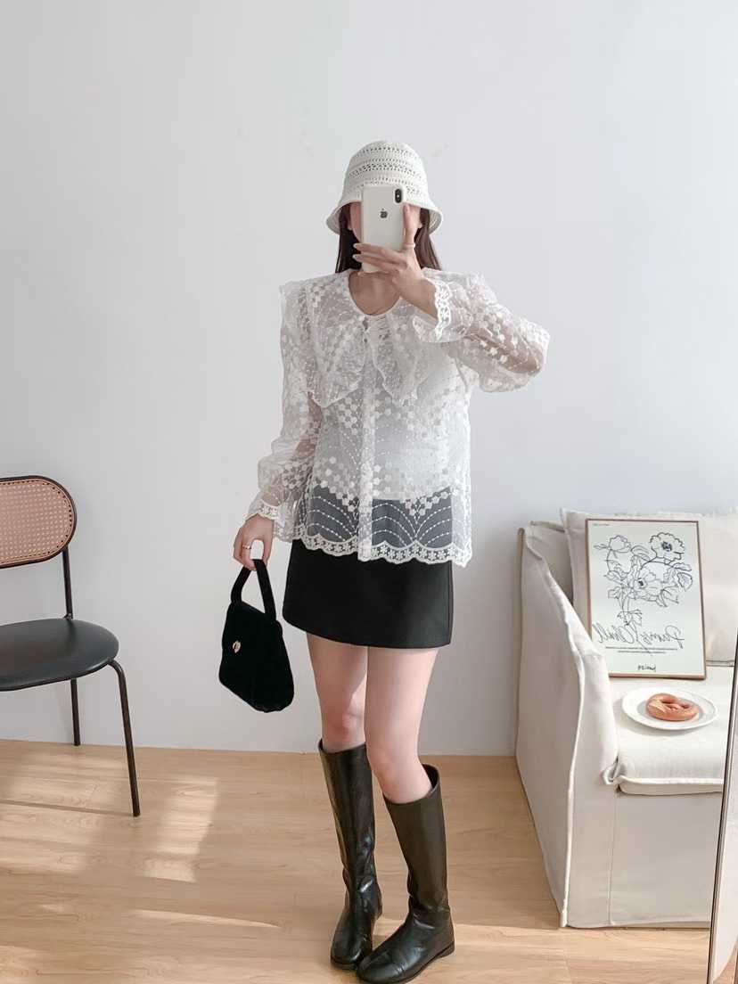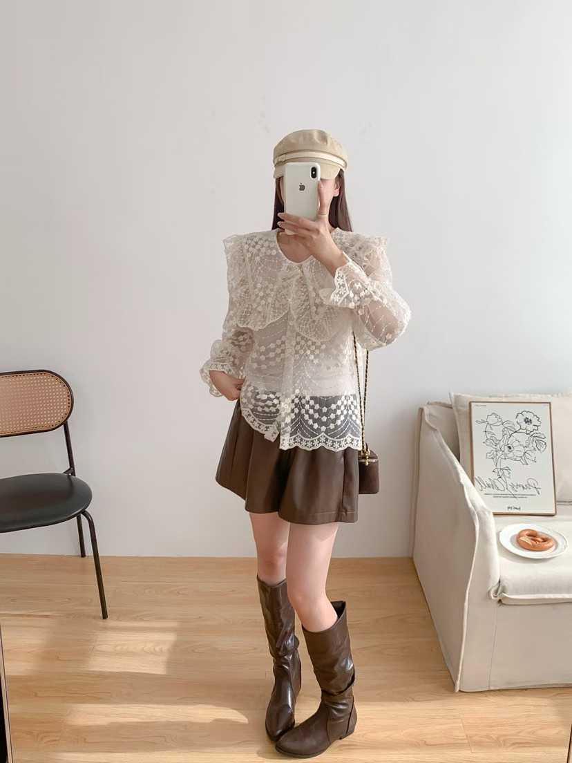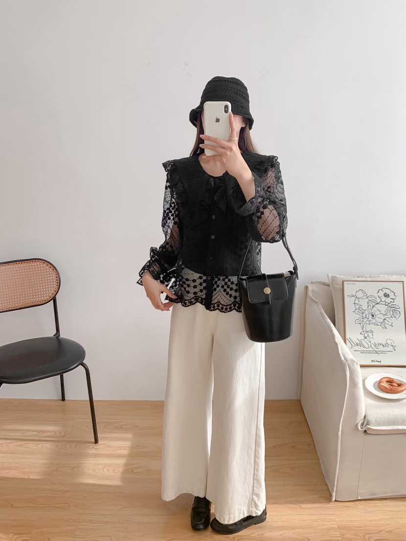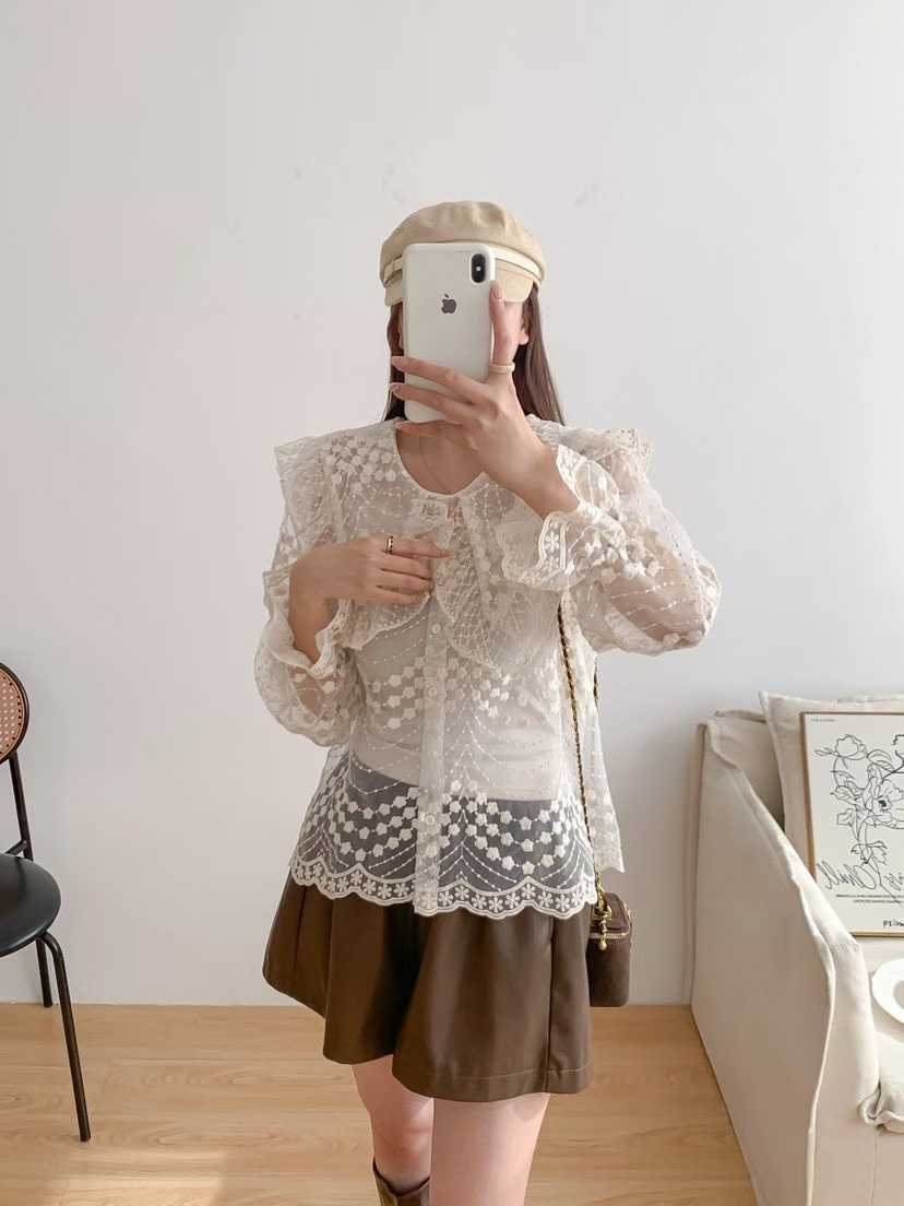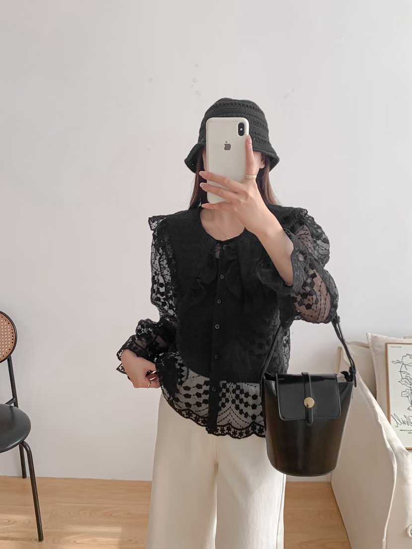 韩国新款洛丽塔娃娃领重工绣花喇叭袖透视蕾丝衫长袖衬衣女配带吊
