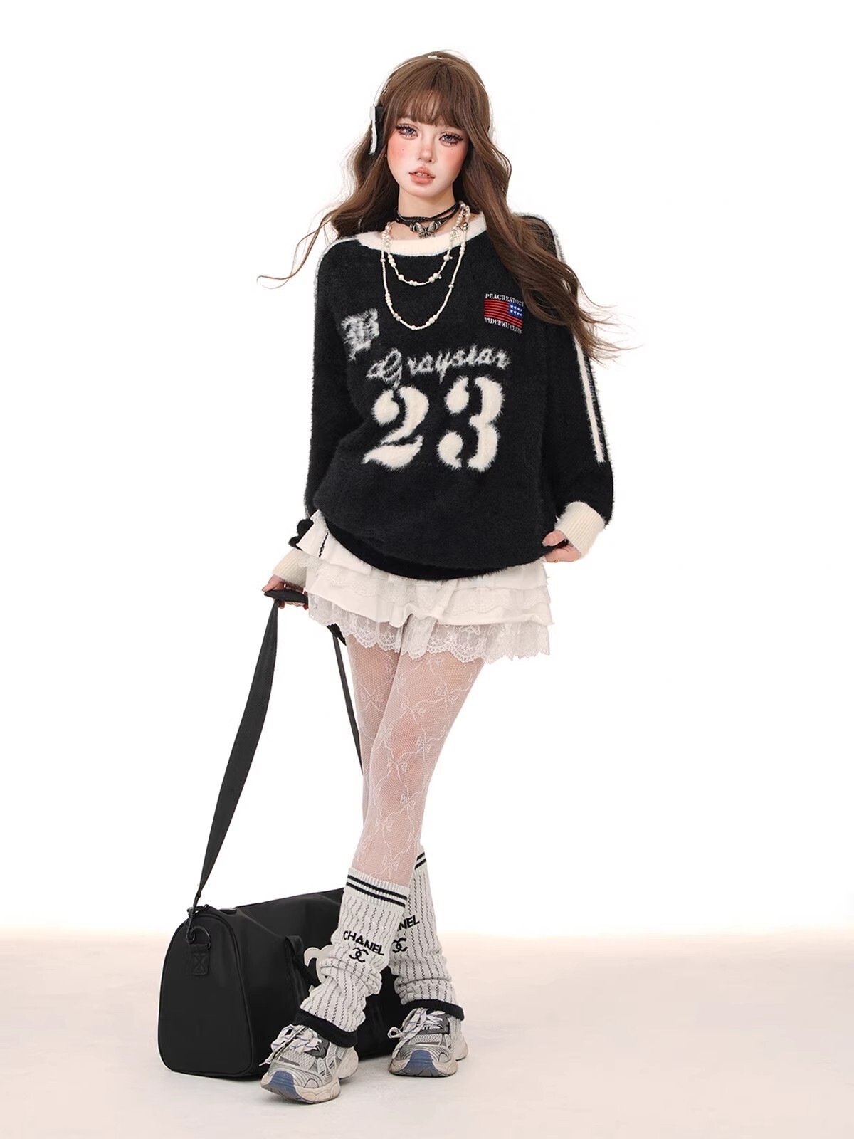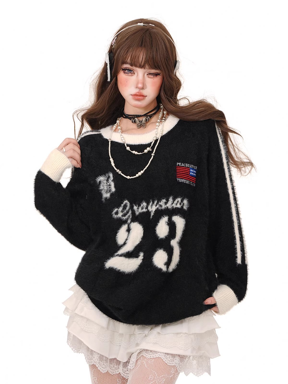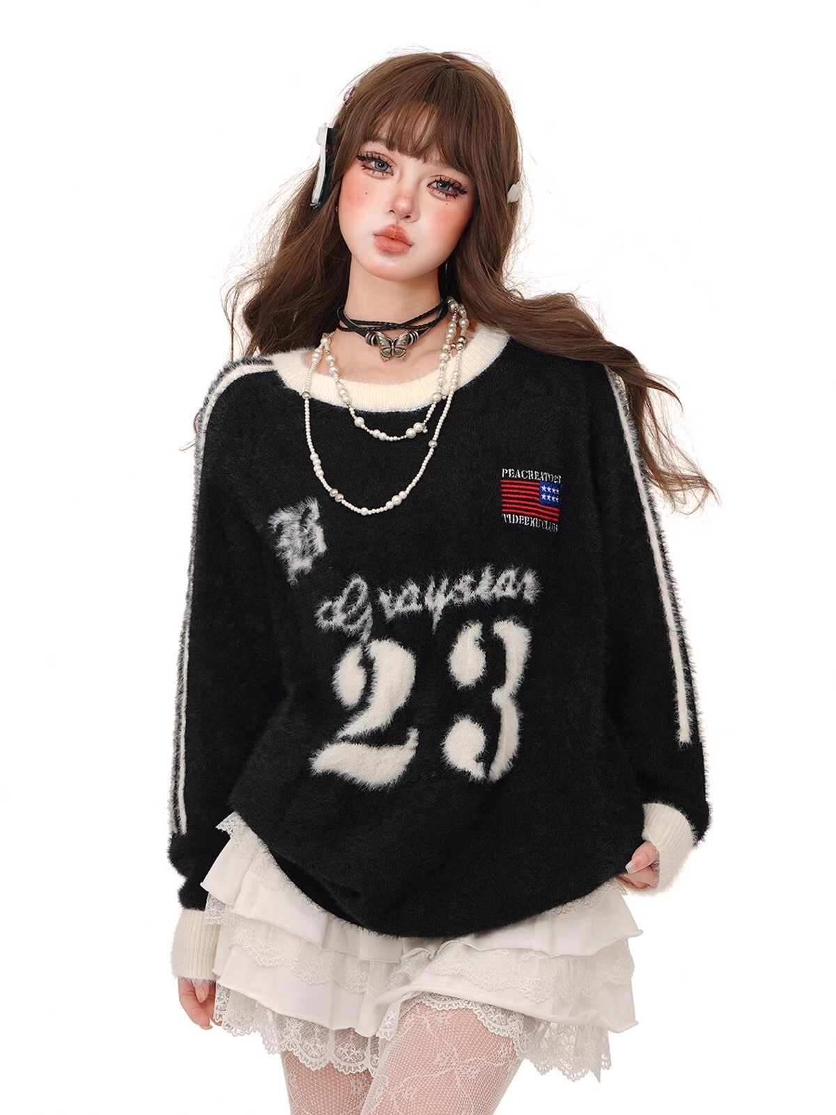 水貂绒美式魔王中性复古三条杆毛衣女春新款宽松情侣圆领长袖
