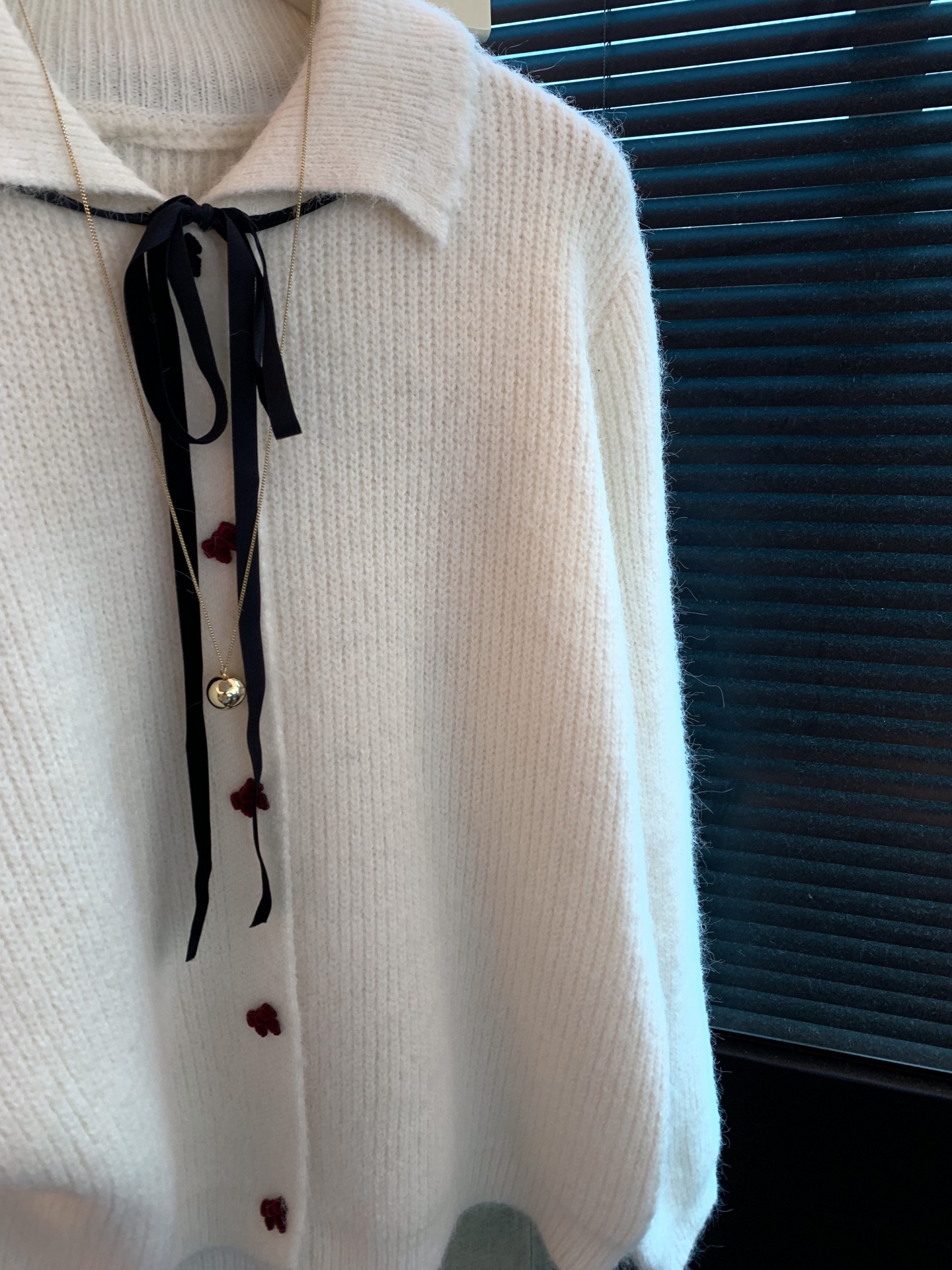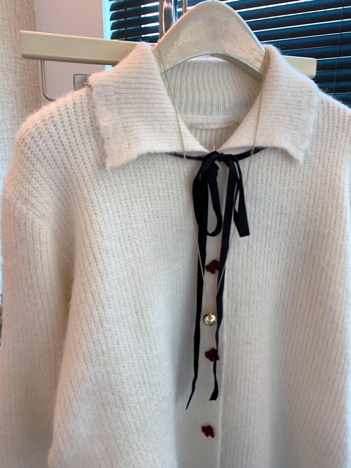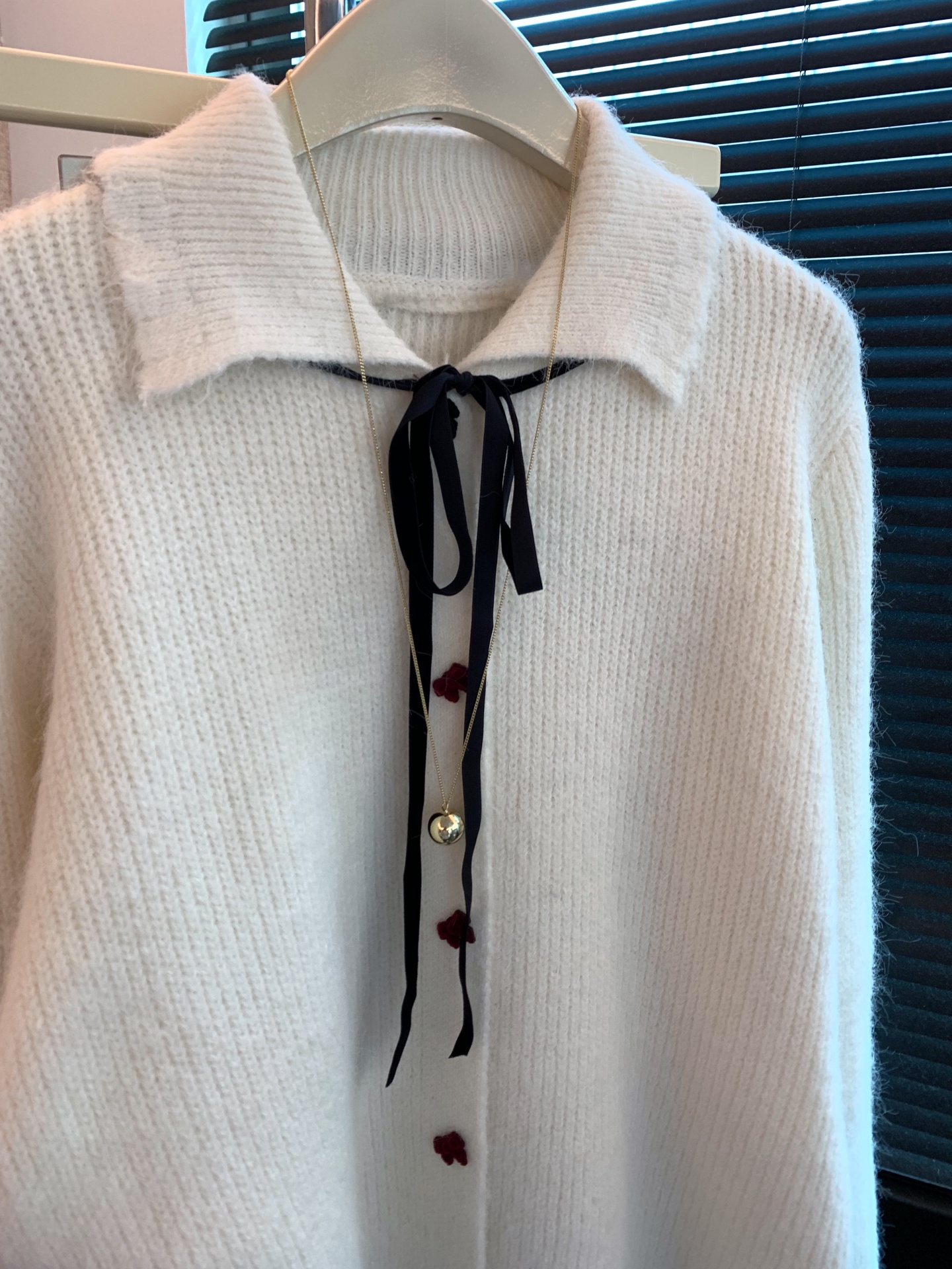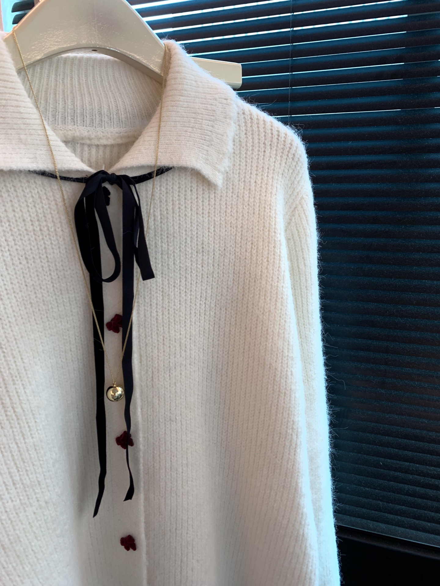实拍秋冬甜美翻领系带蝴蝶结系带针织开衫女毛衣学院风长袖毛衣