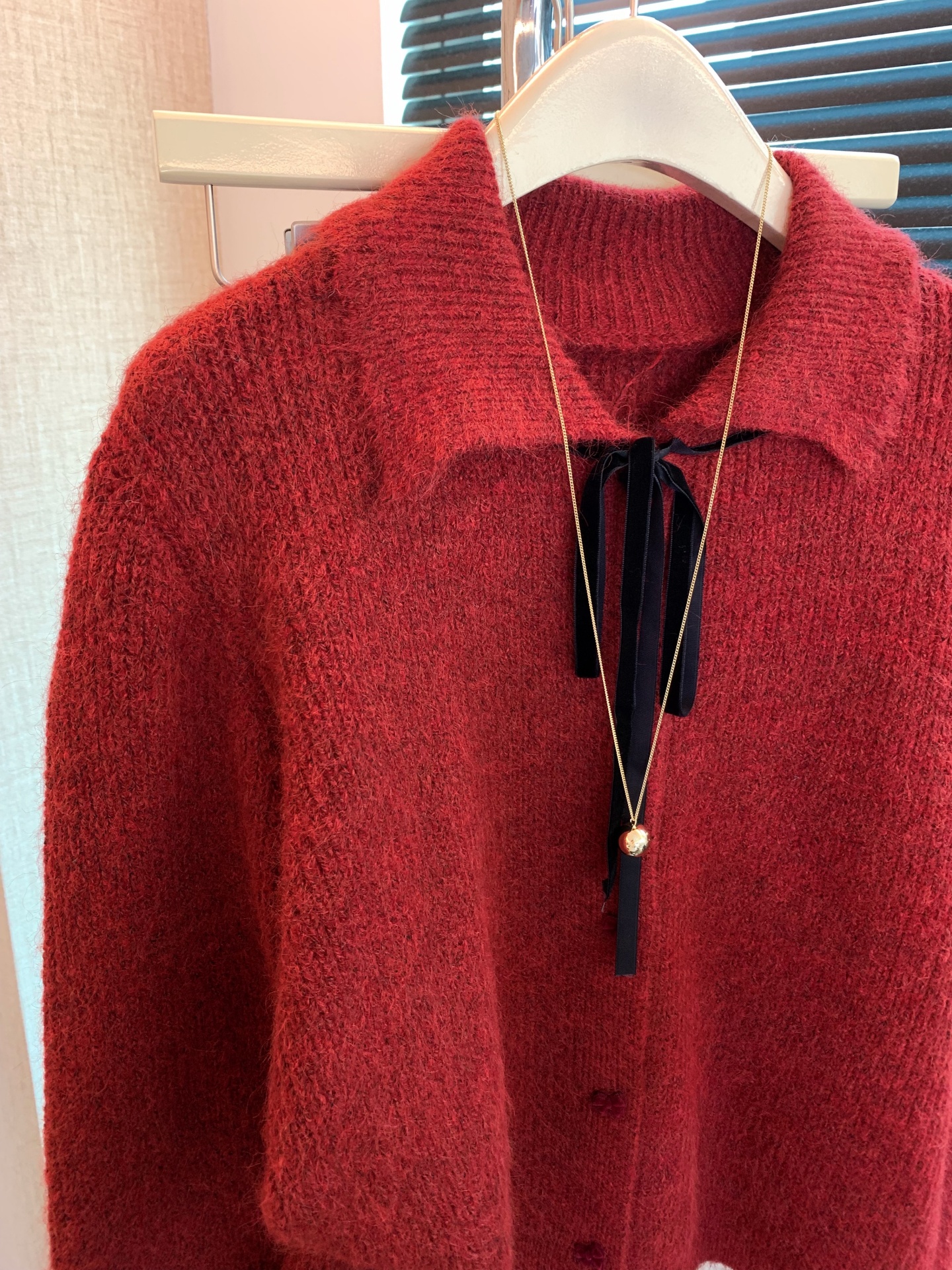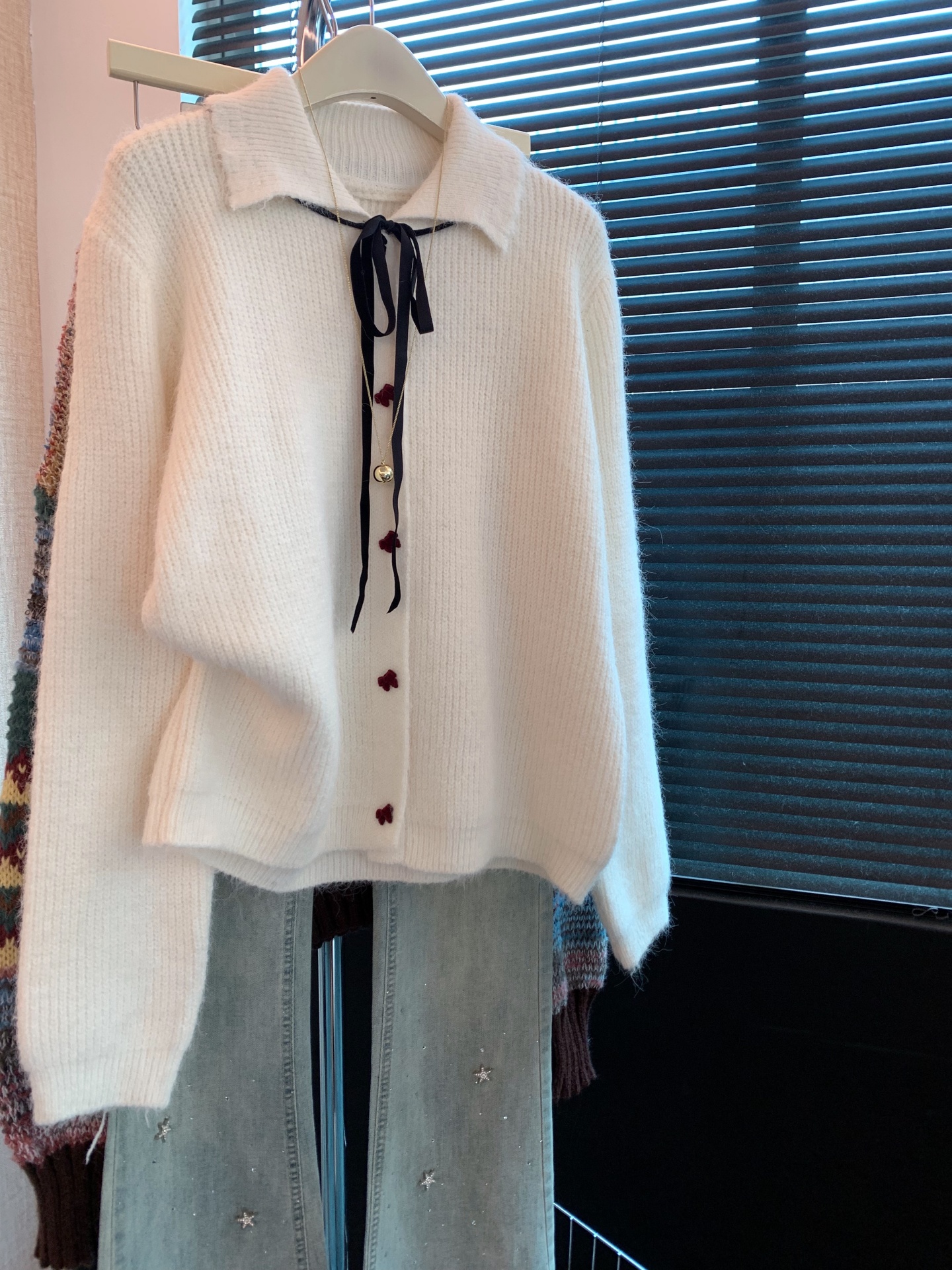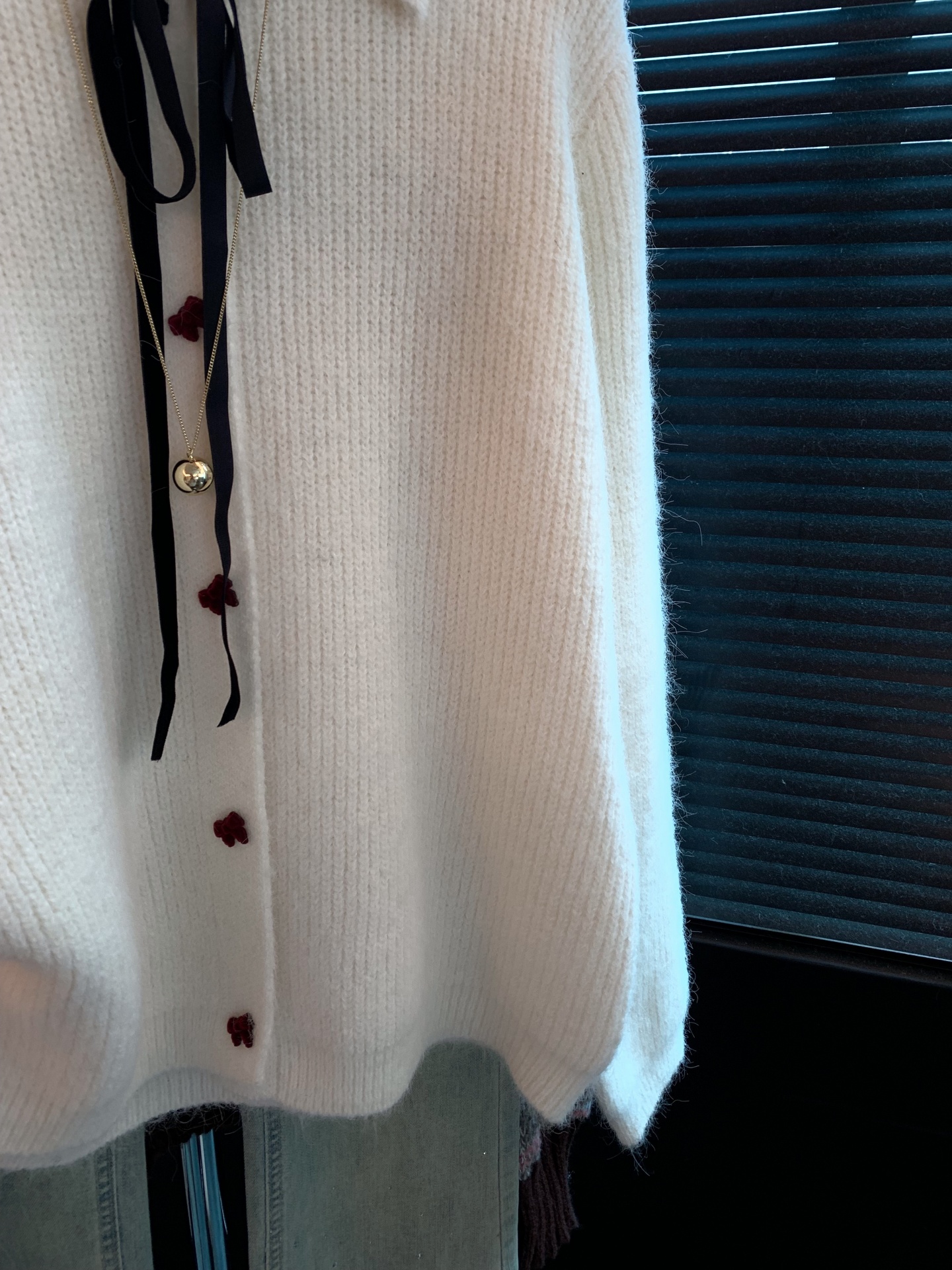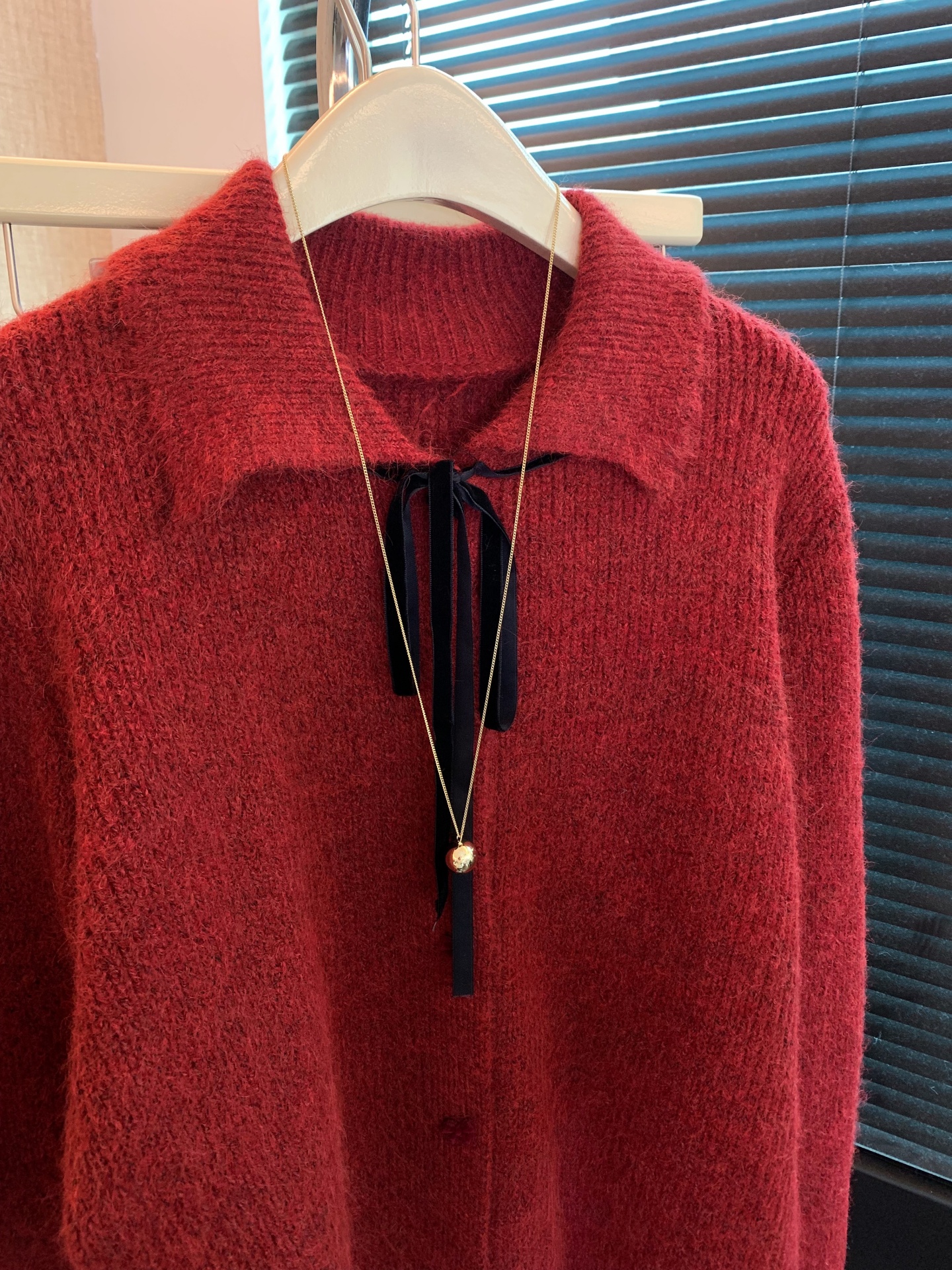 实拍秋冬甜美翻领系带蝴蝶结系带针织开衫女毛衣学院风长袖毛衣