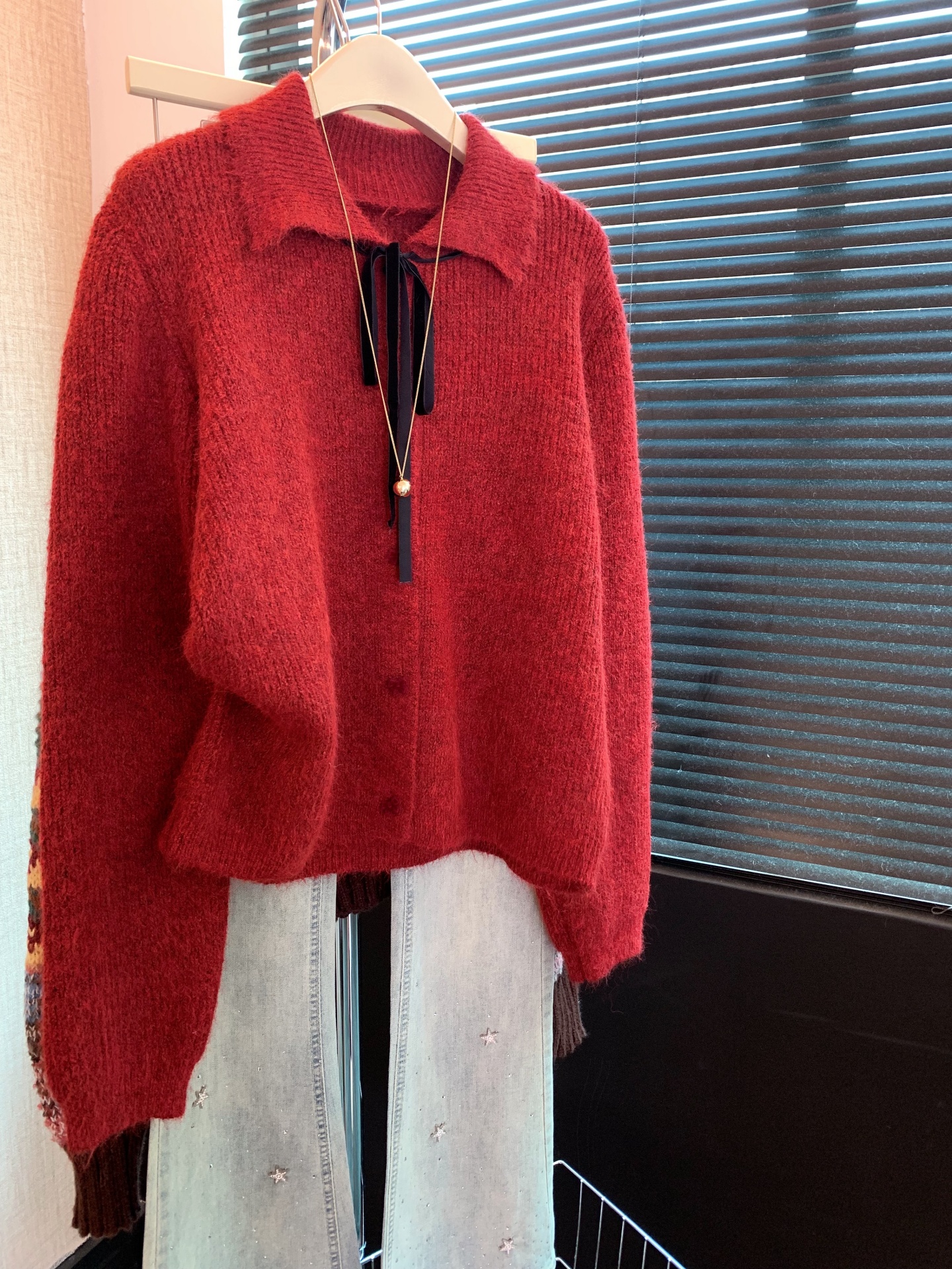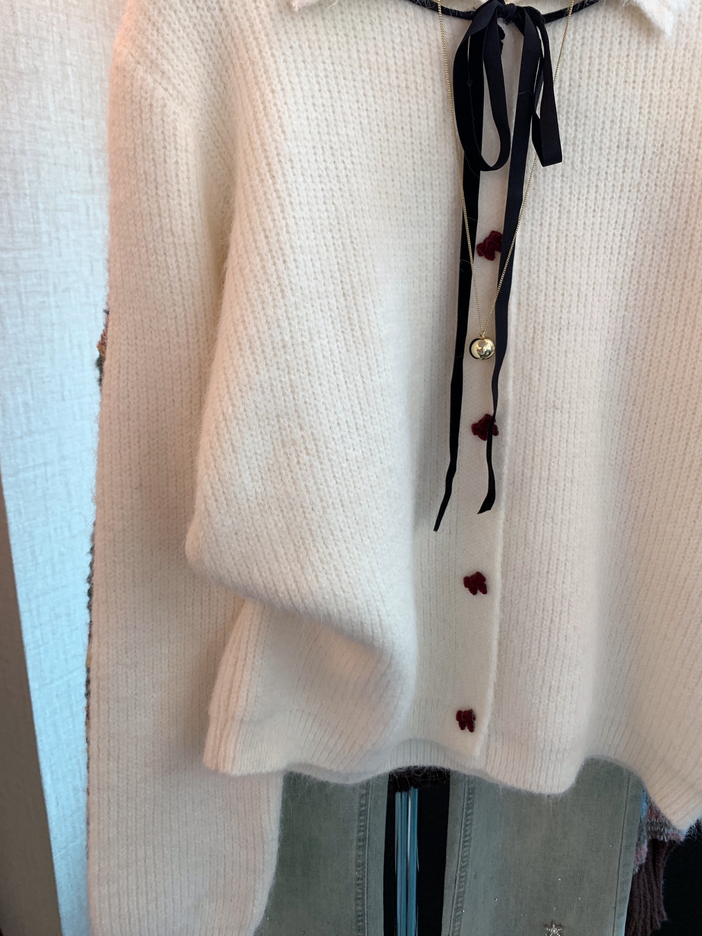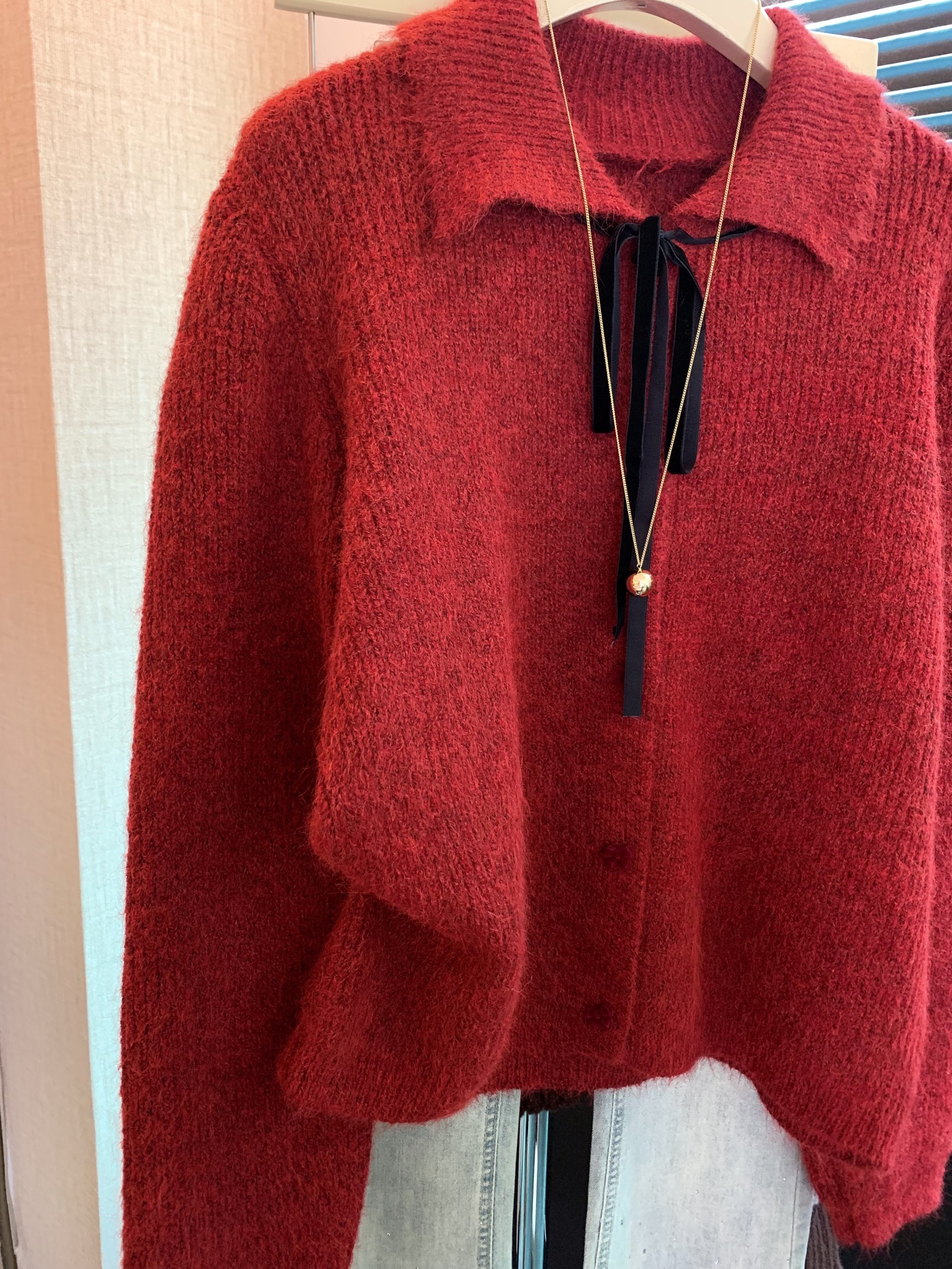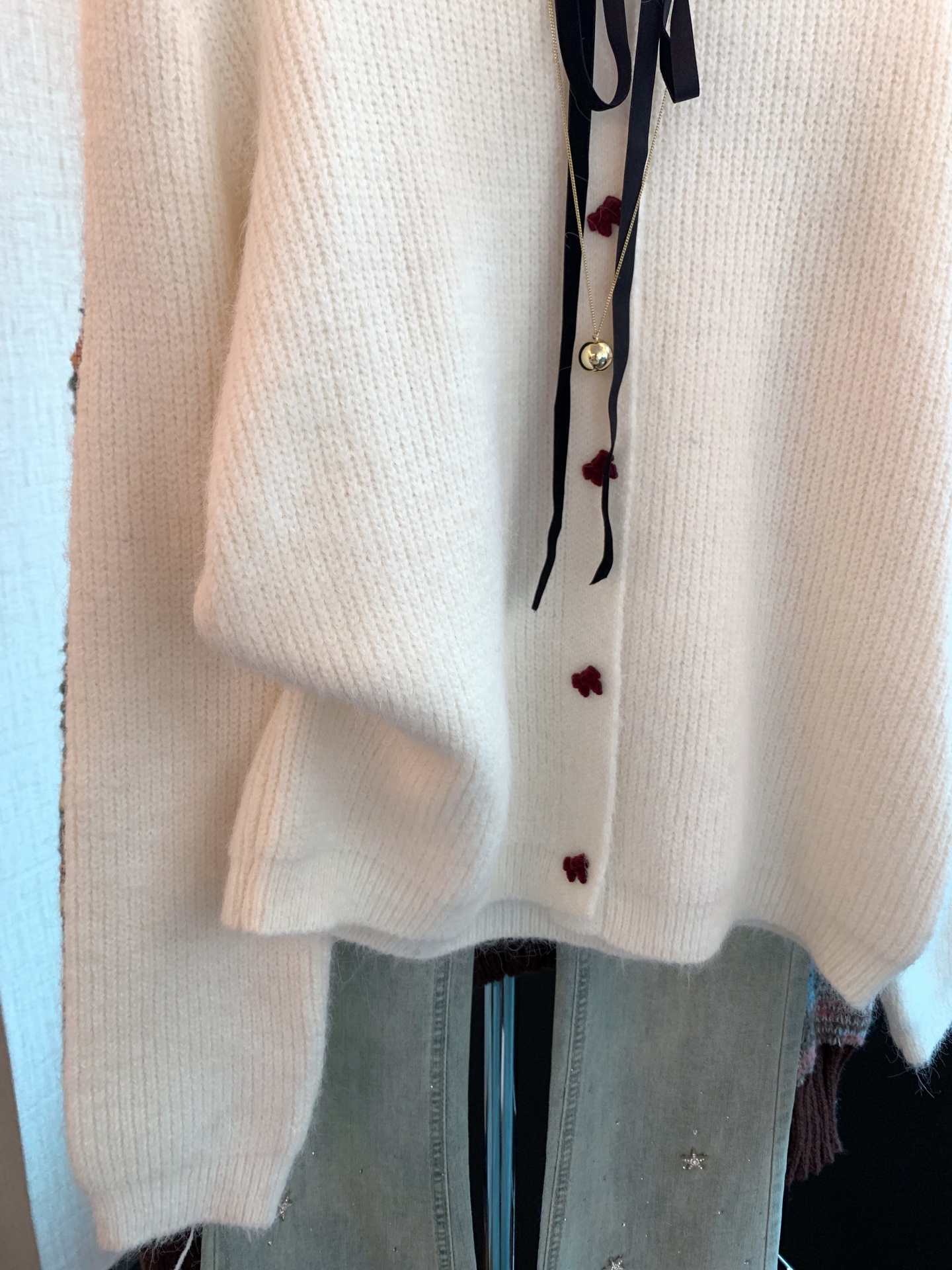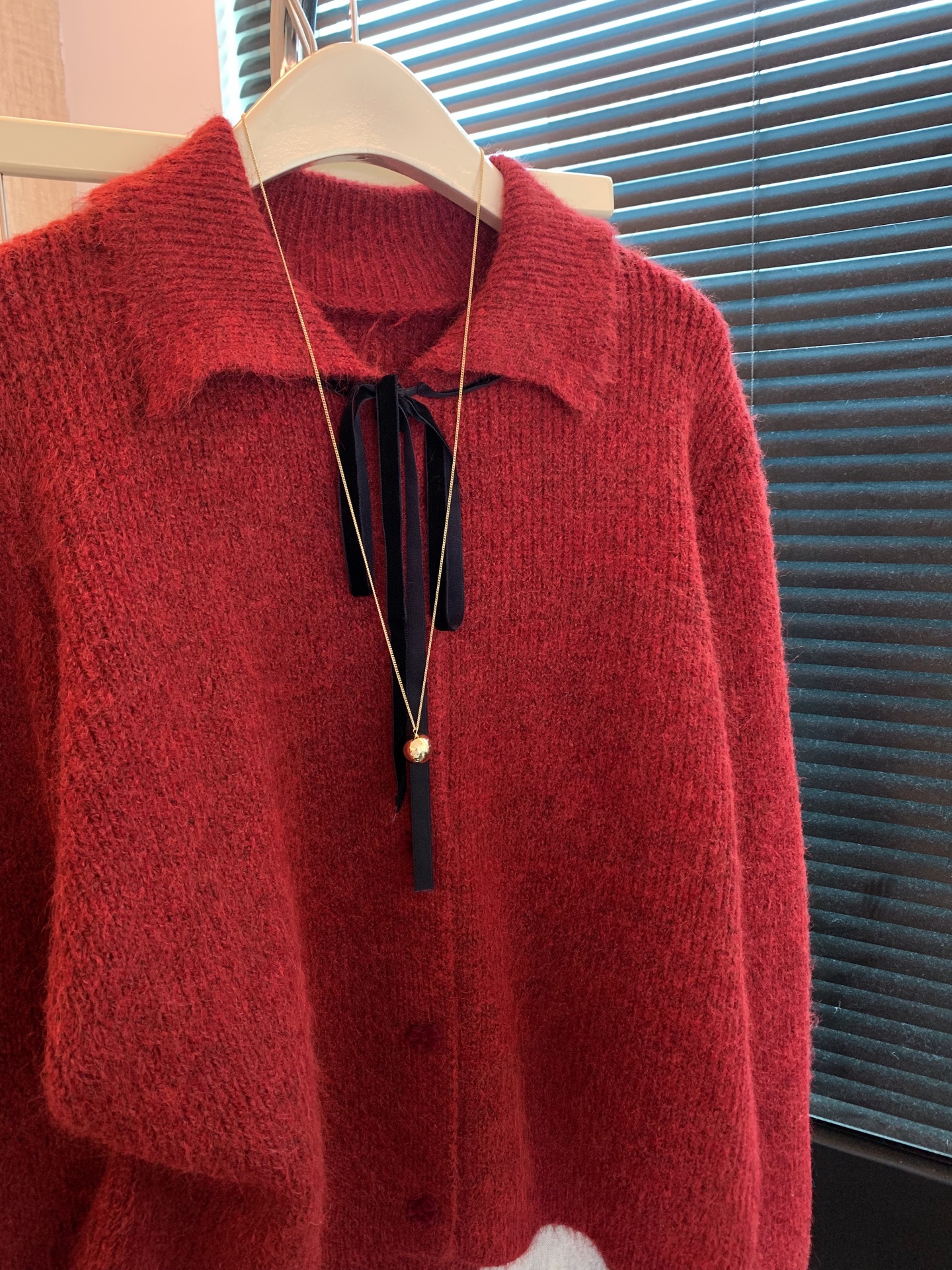 实拍秋冬甜美翻领系带蝴蝶结系带针织开衫女毛衣学院风长袖毛衣