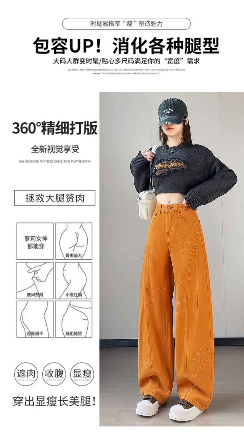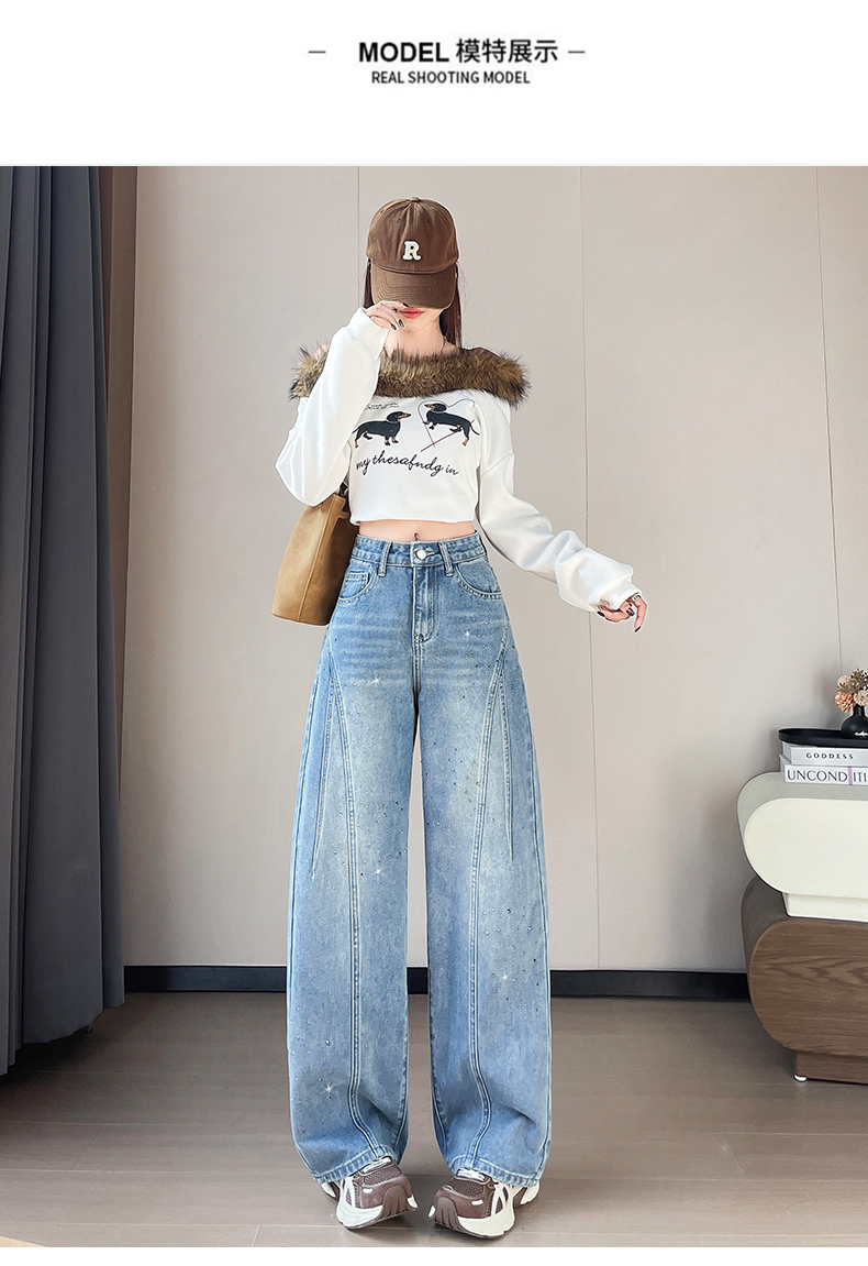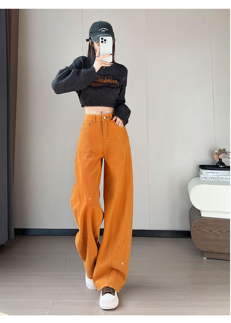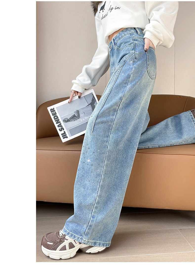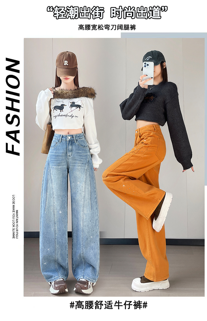 设计感闪闪烫钻直筒牛仔裤女装春秋美式高腰宽松显瘦阔腿弯刀裤子