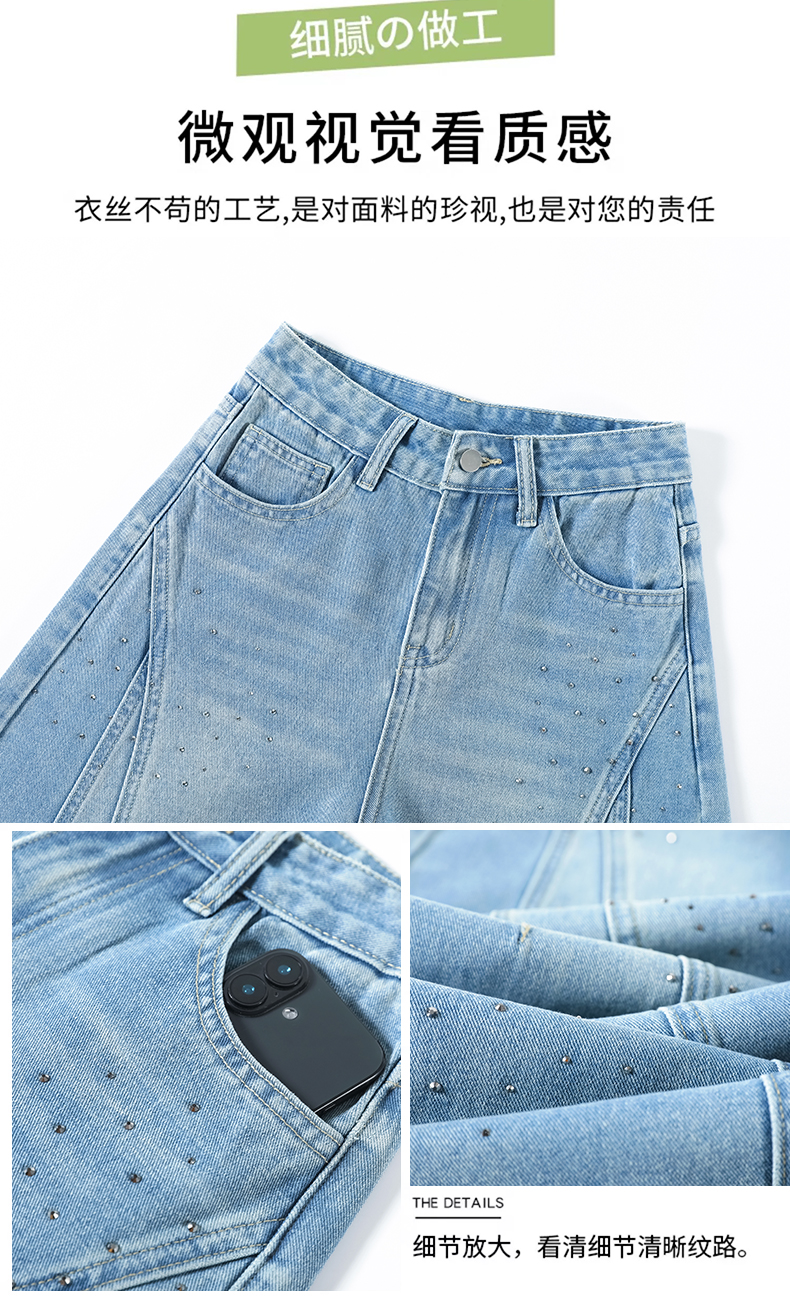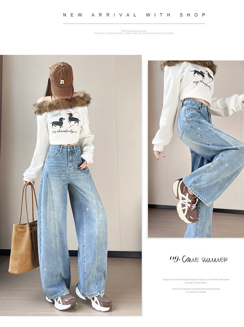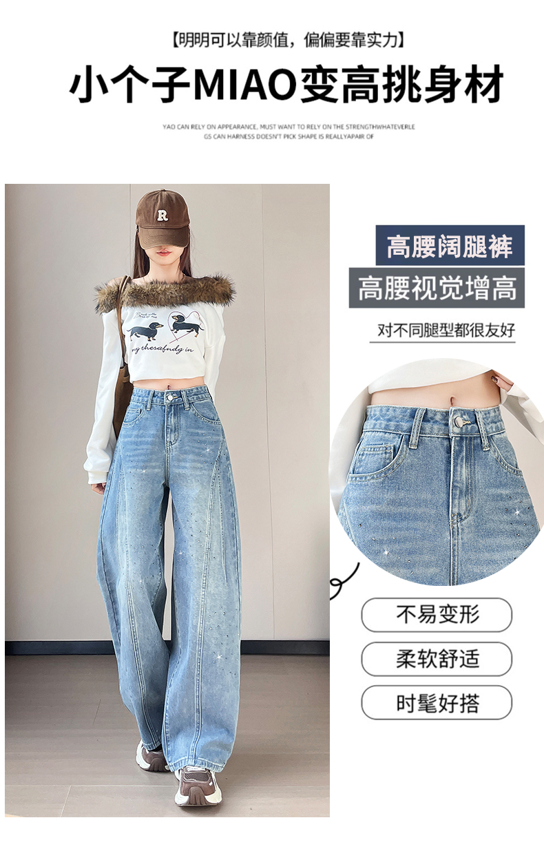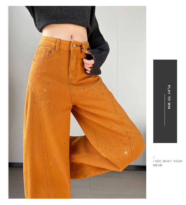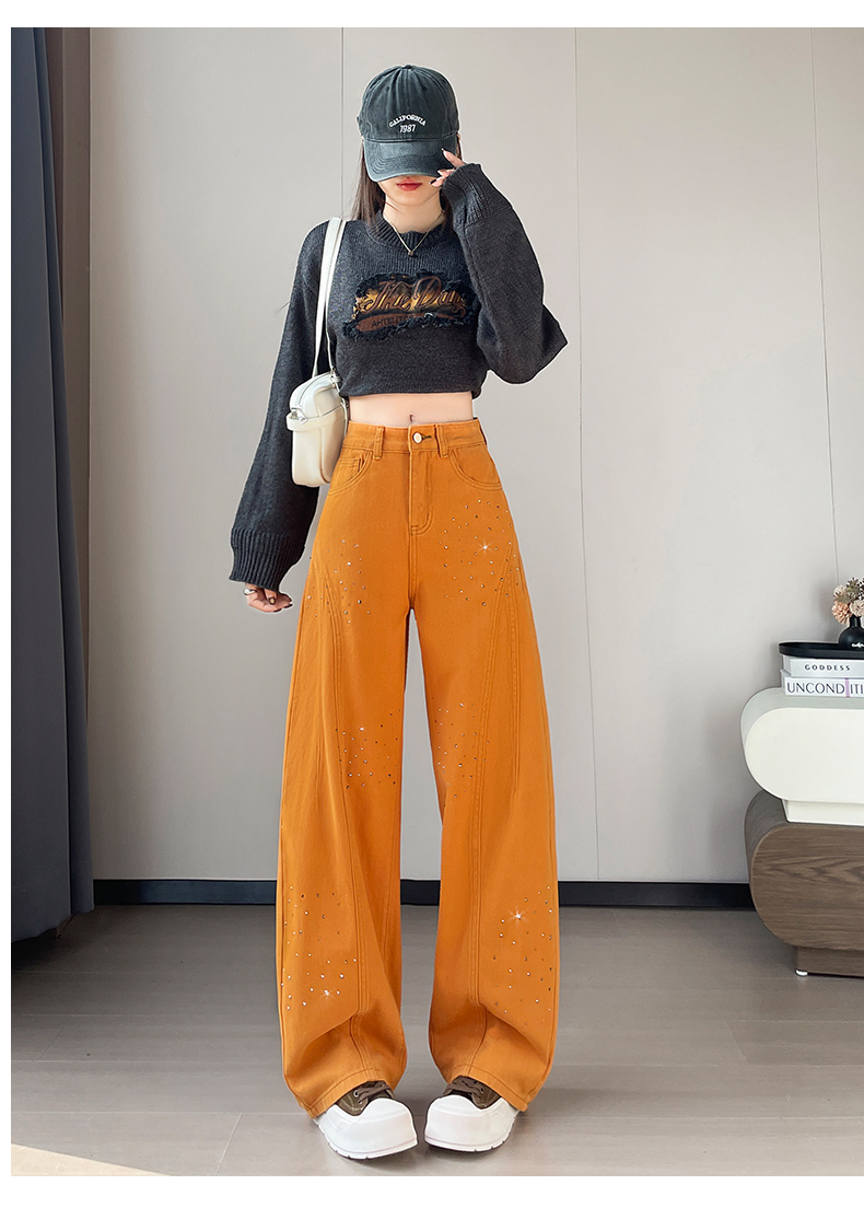 设计感闪闪烫钻直筒牛仔裤女装春秋美式高腰宽松显瘦阔腿弯刀裤子