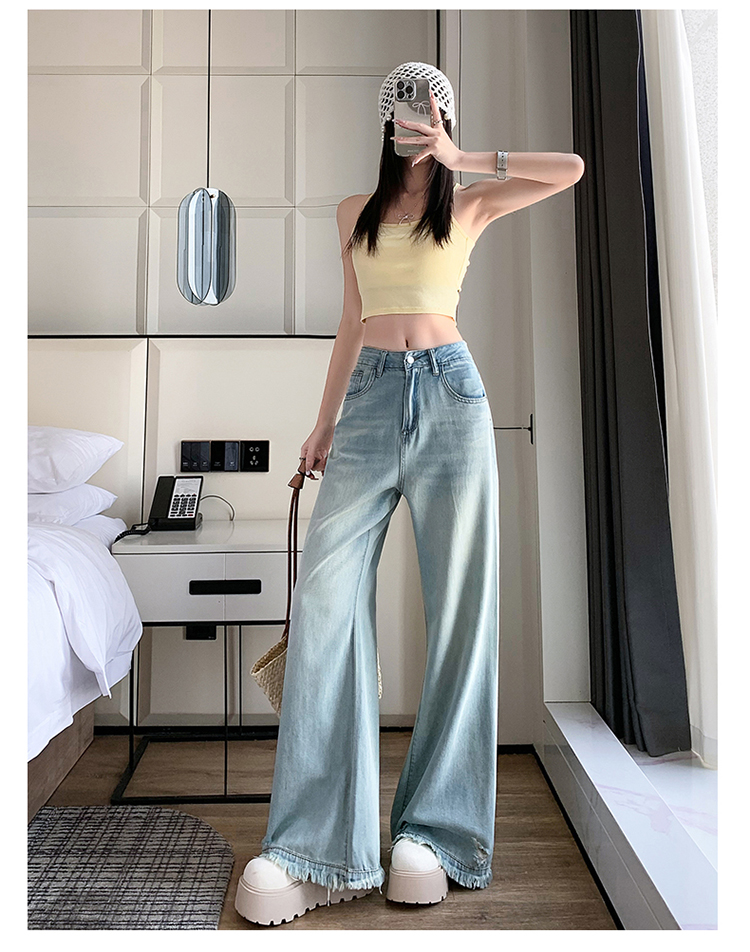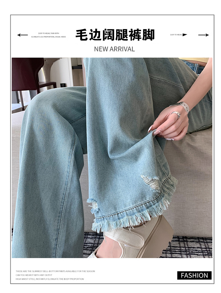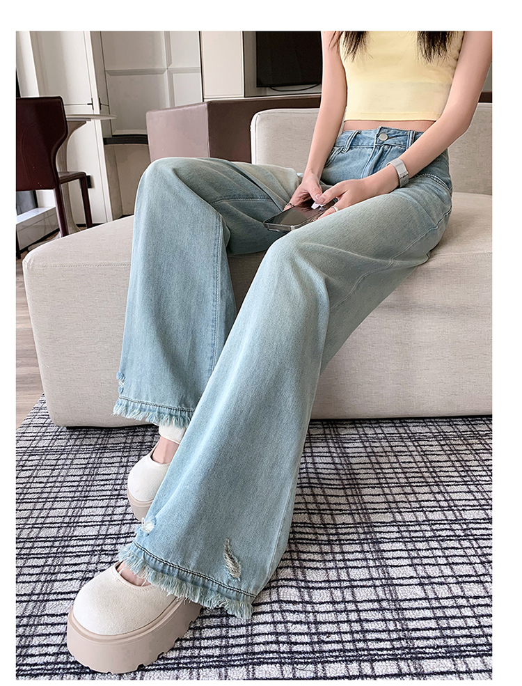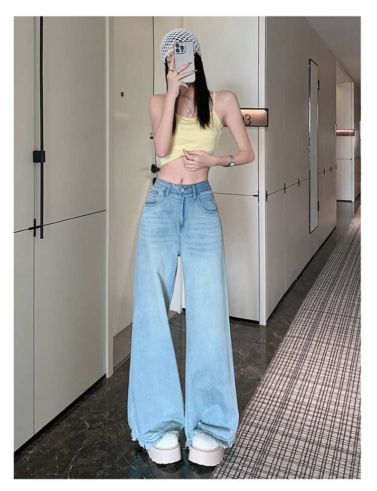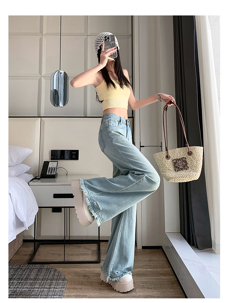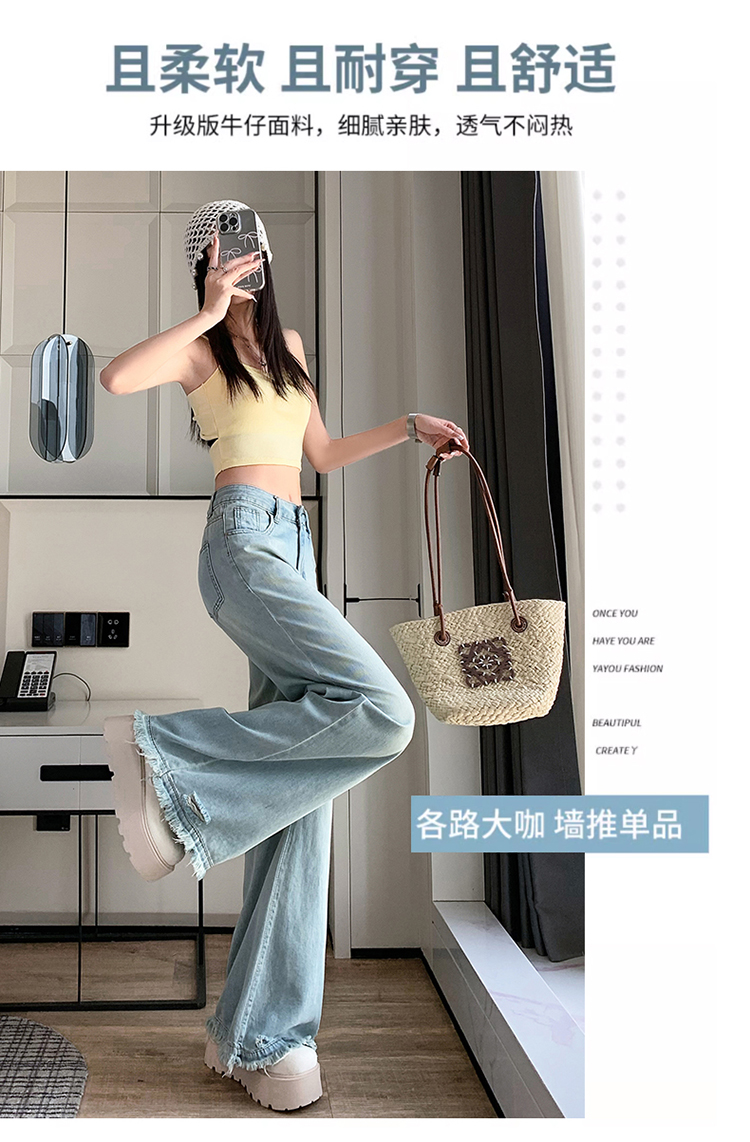 浅蓝色破洞毛边高腰微喇牛仔裤女春季宽松百搭休闲阔腿喇叭拖地裤