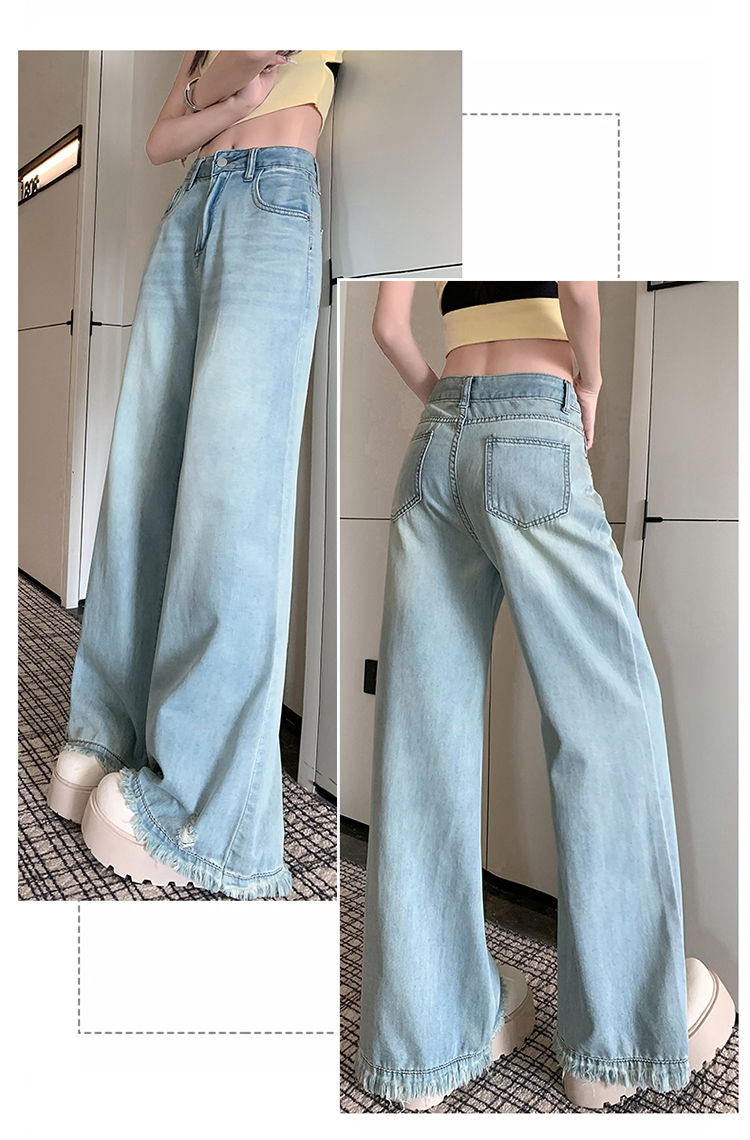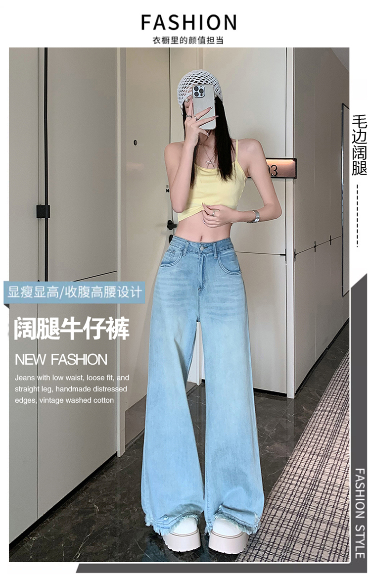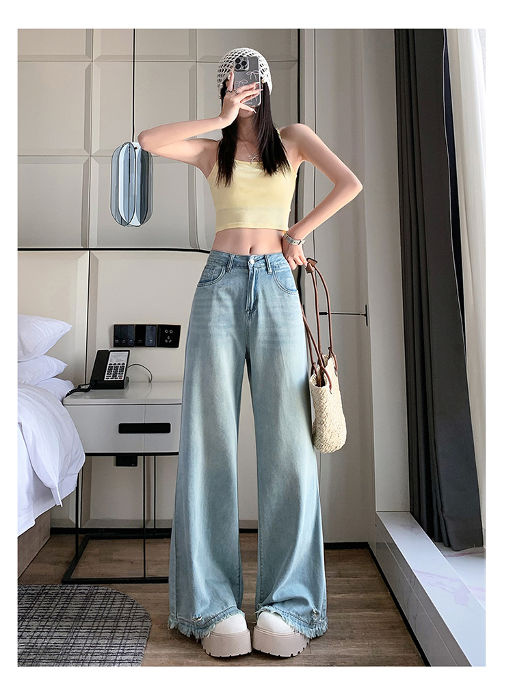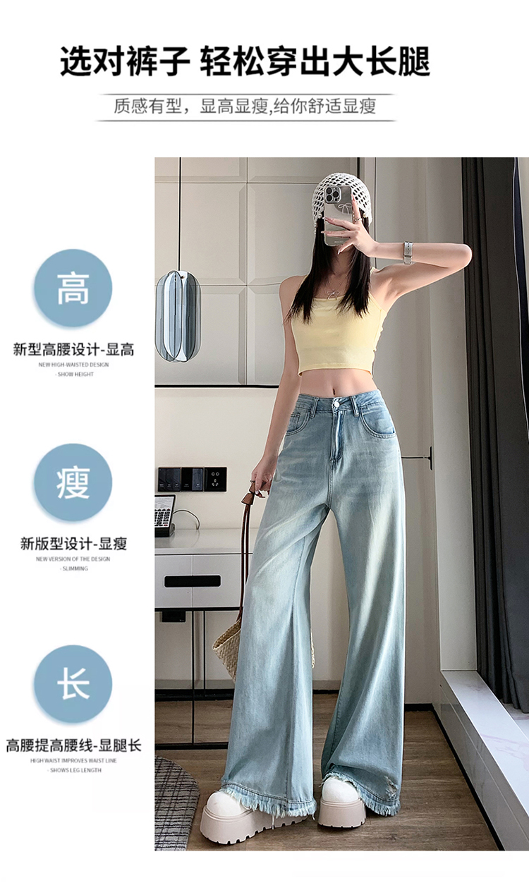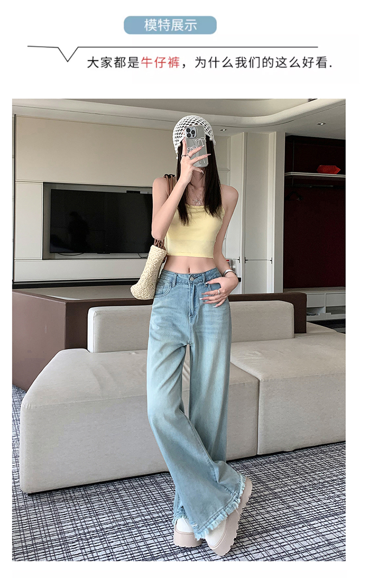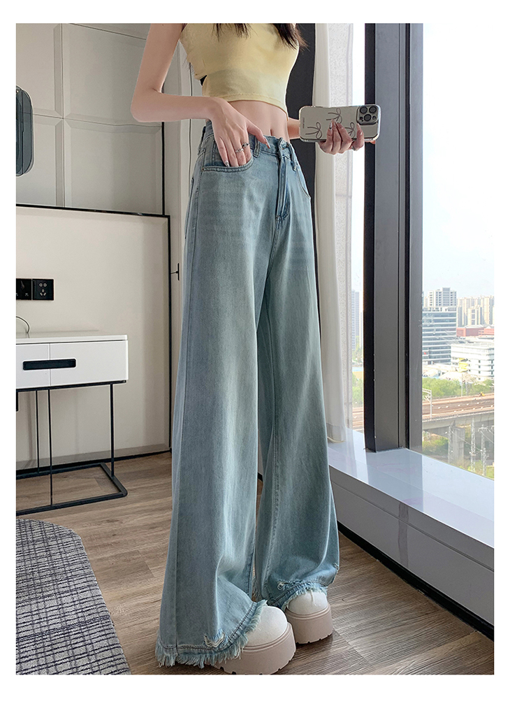 浅蓝色破洞毛边高腰微喇牛仔裤女春季宽松百搭休闲阔腿喇叭拖地裤