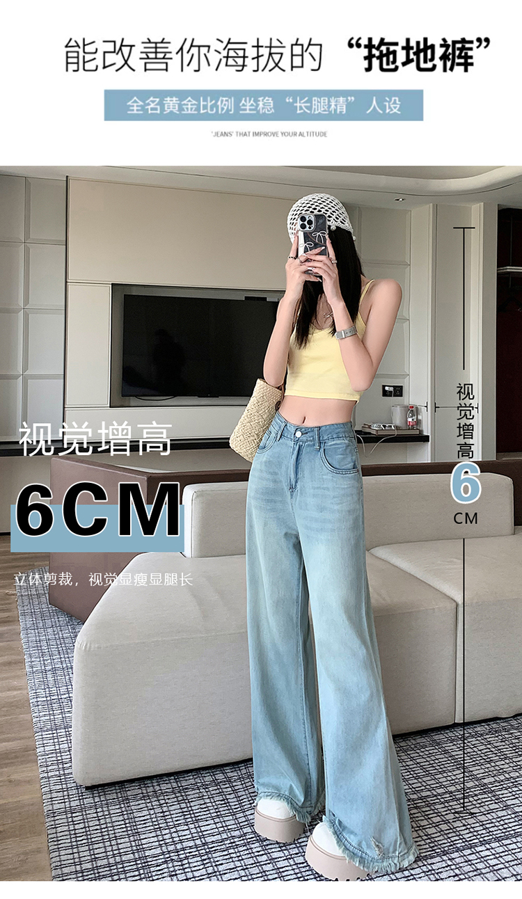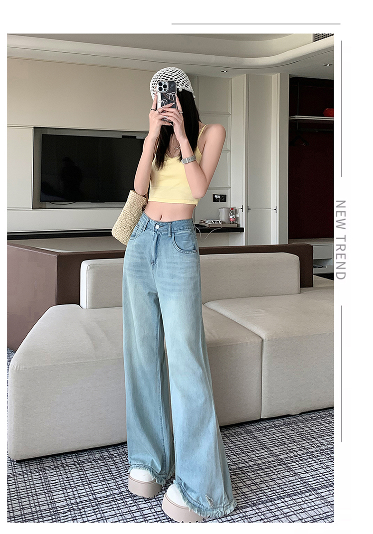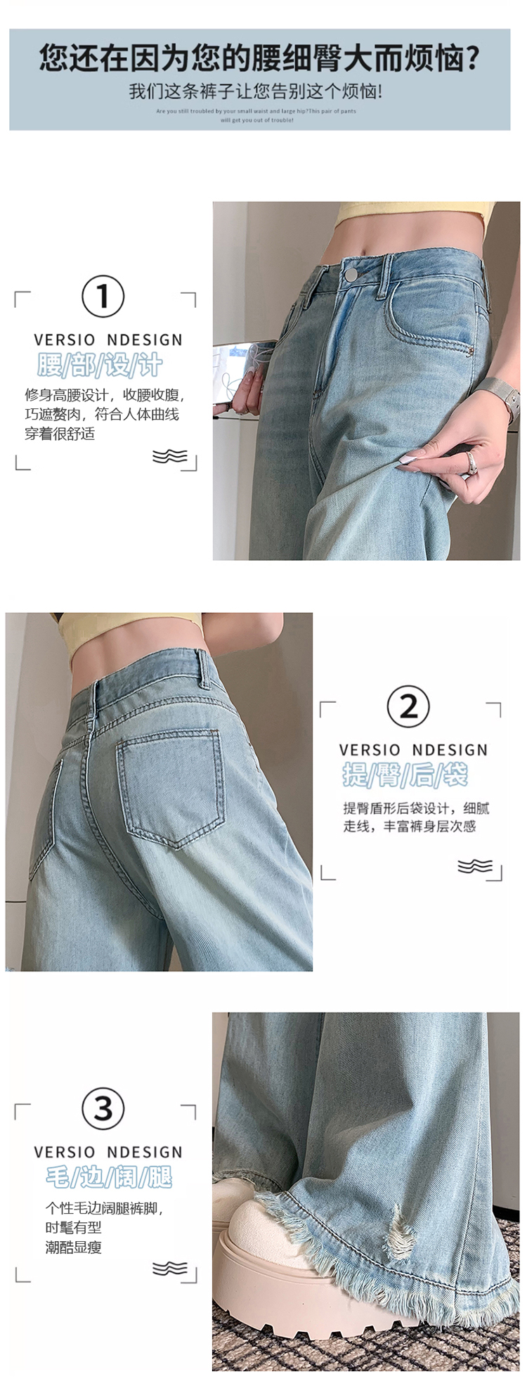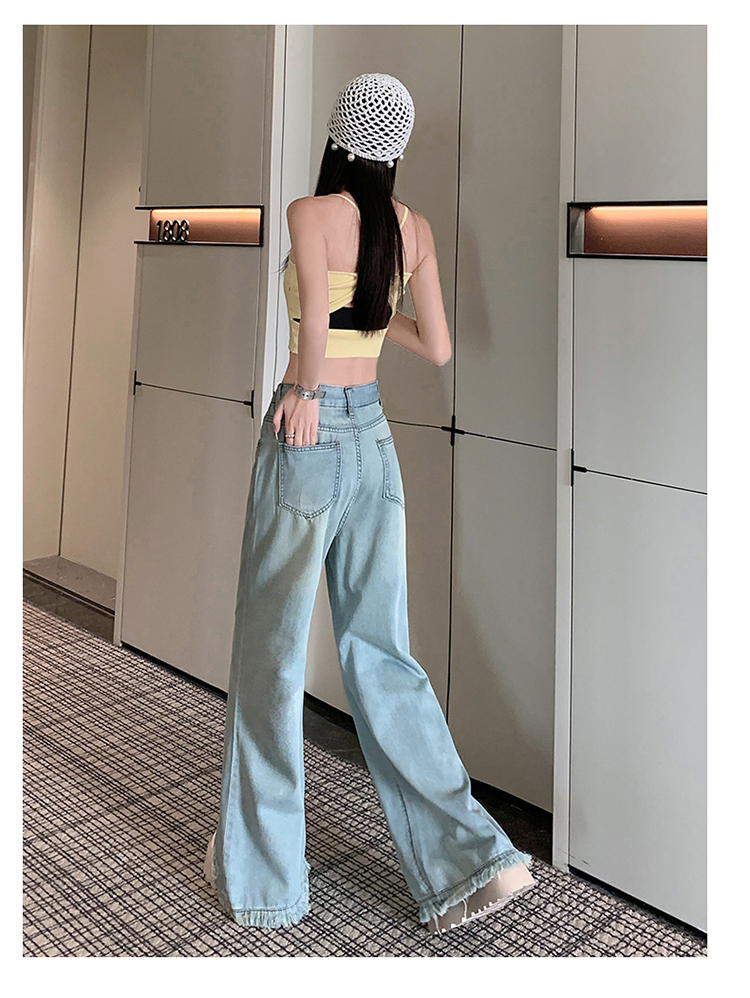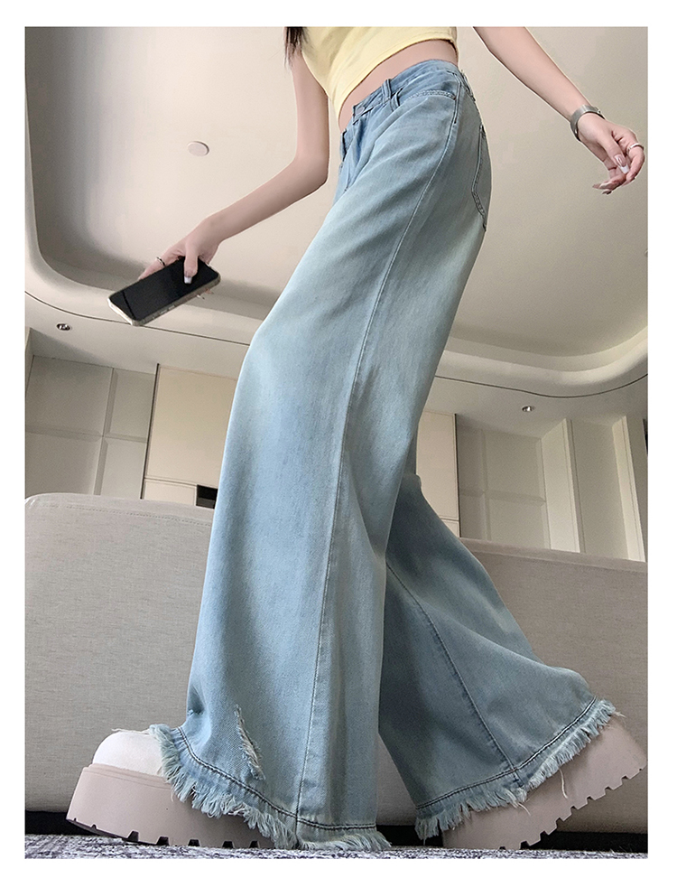浅蓝色破洞毛边高腰微喇牛仔裤女春季宽松百搭休闲阔腿喇叭拖地裤