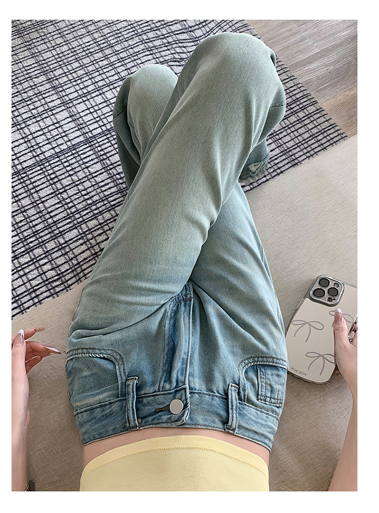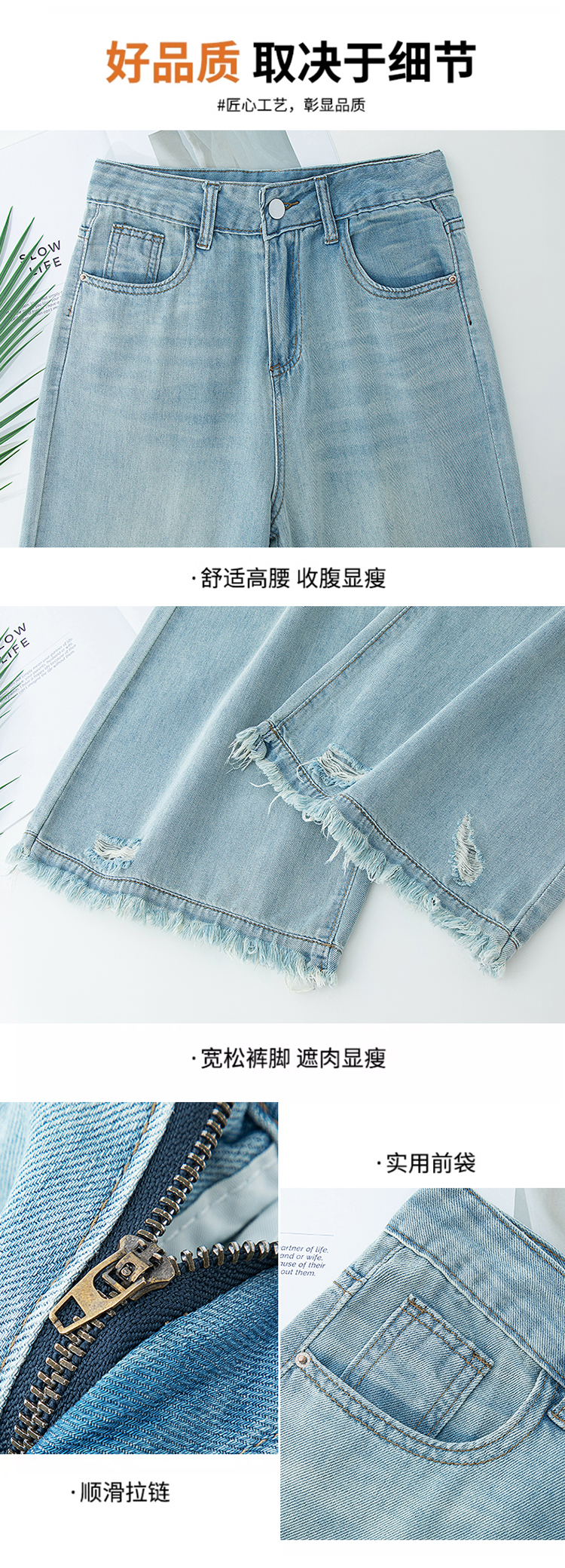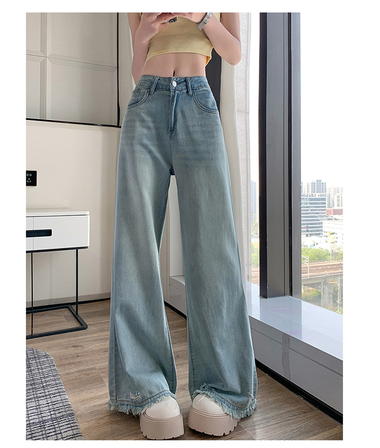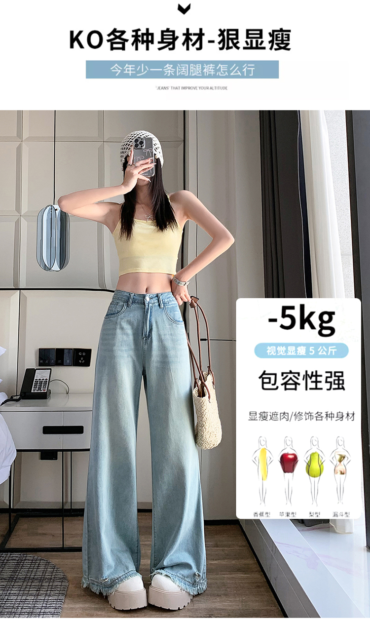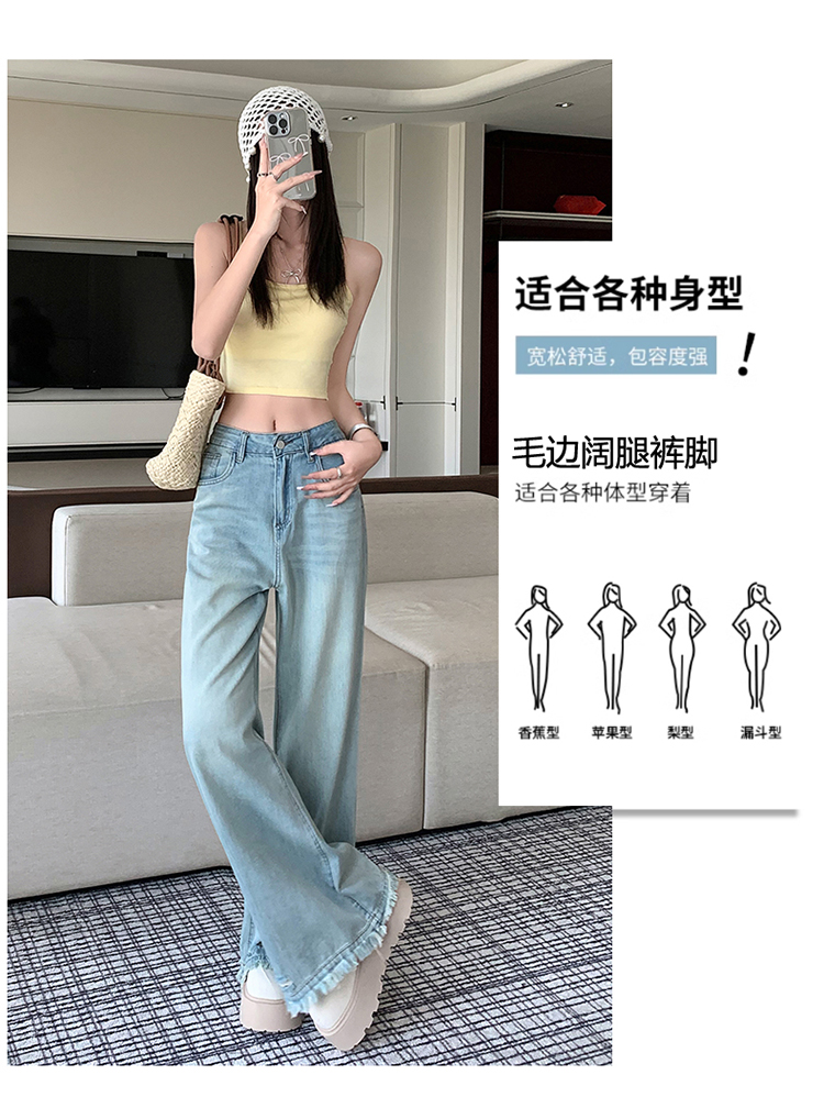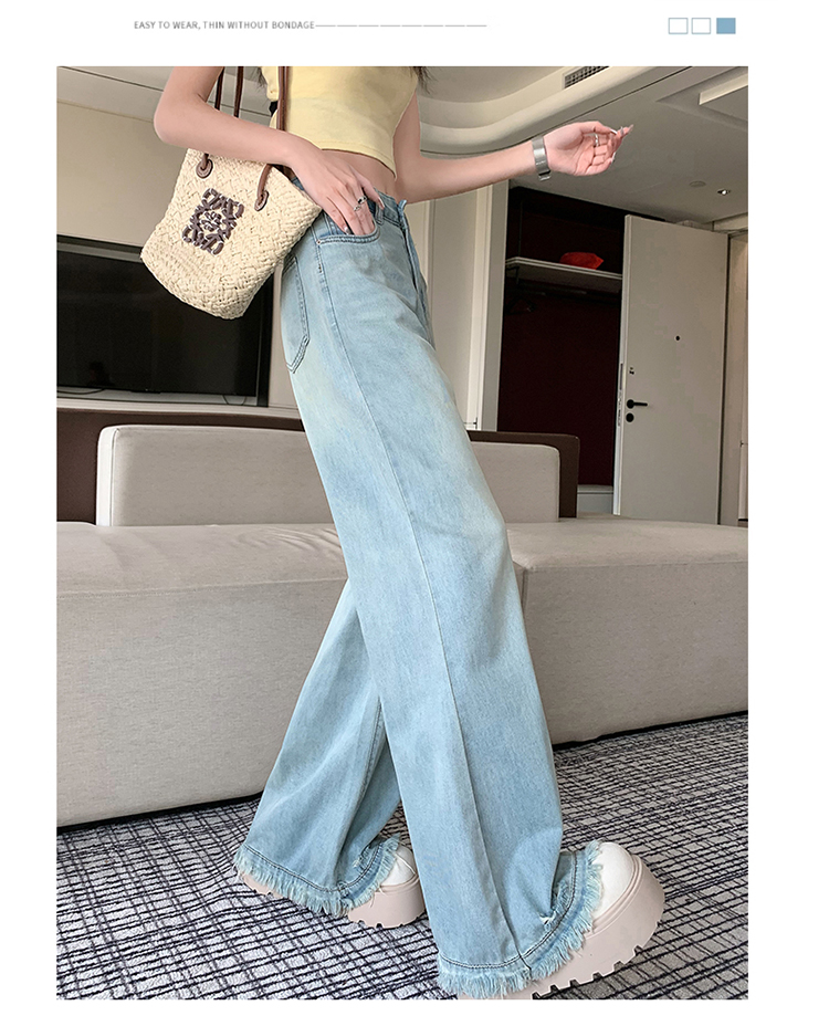 浅蓝色破洞毛边高腰微喇牛仔裤女春季宽松百搭休闲阔腿喇叭拖地裤