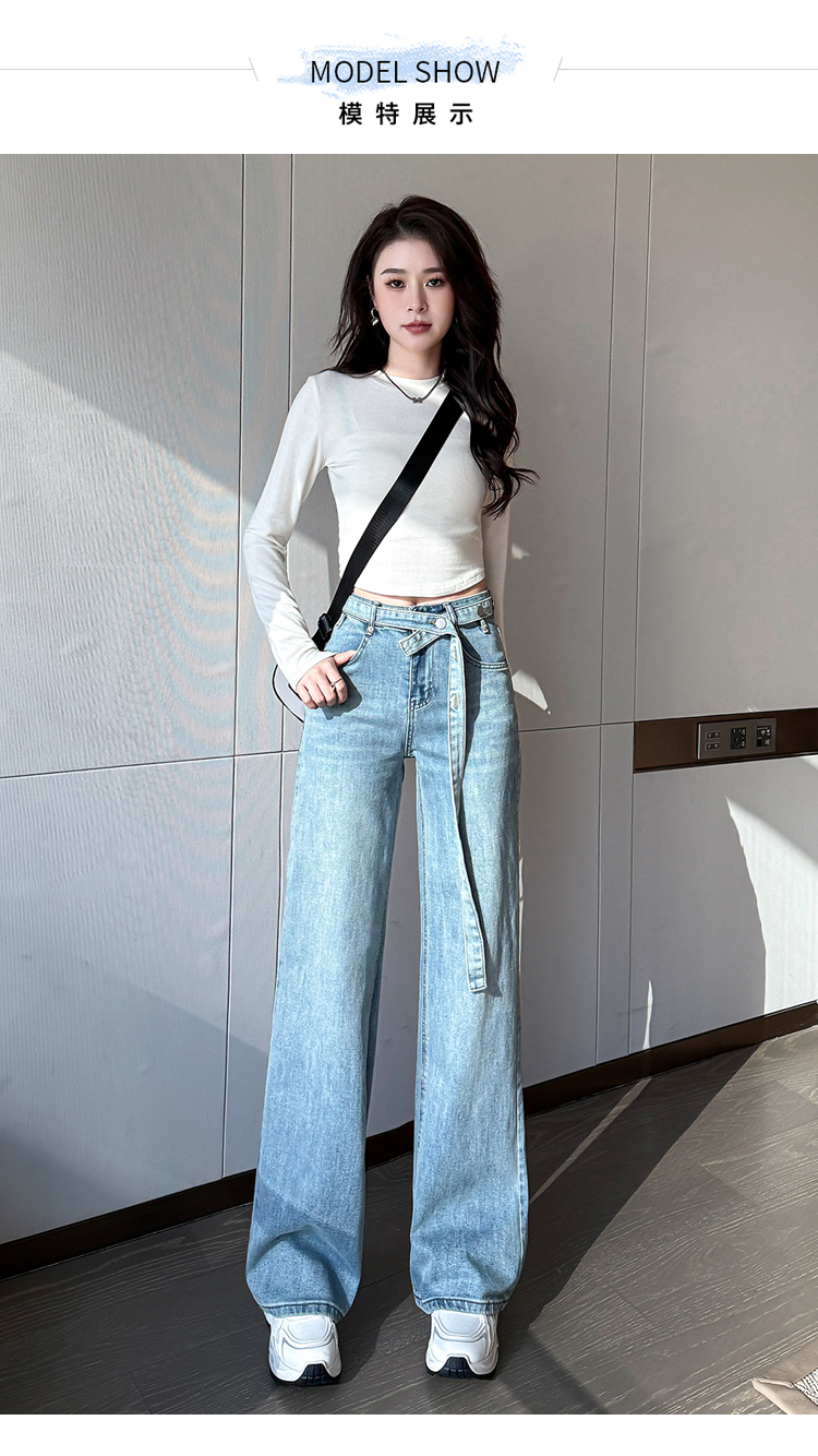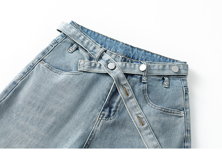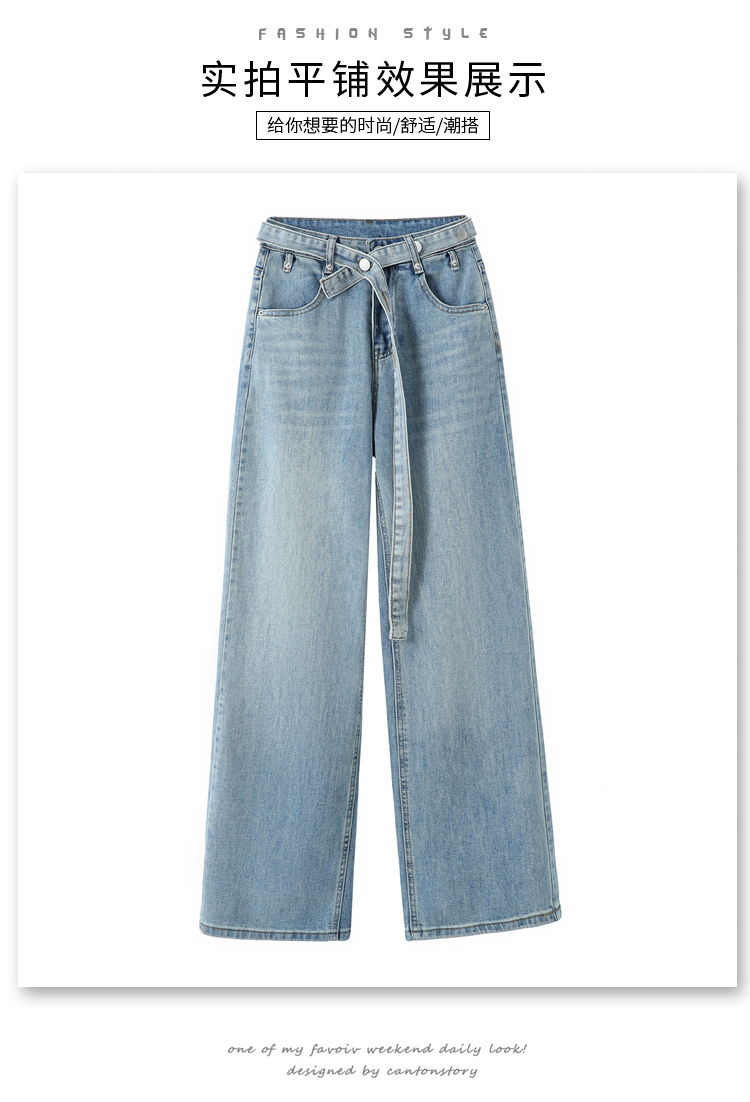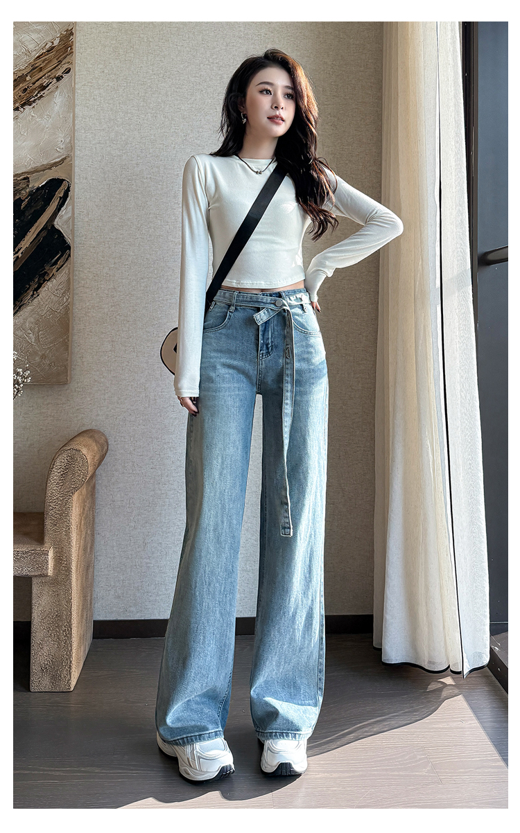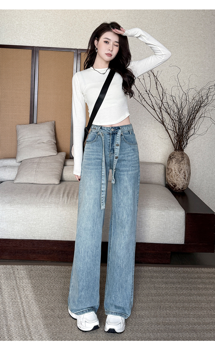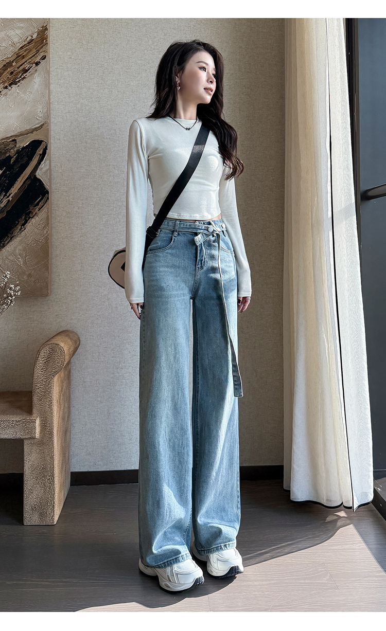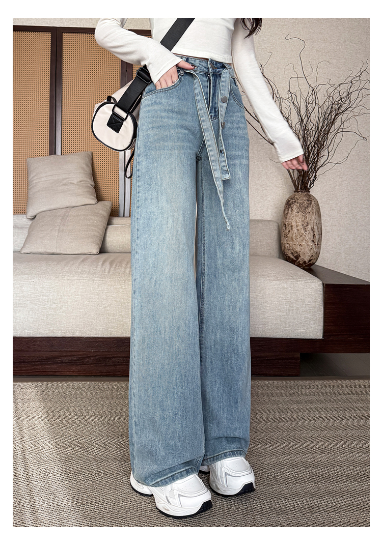 春季新款腰头系带设计牛仔弯刀裤女百搭复古水洗浅蓝高腰阔腿长裤