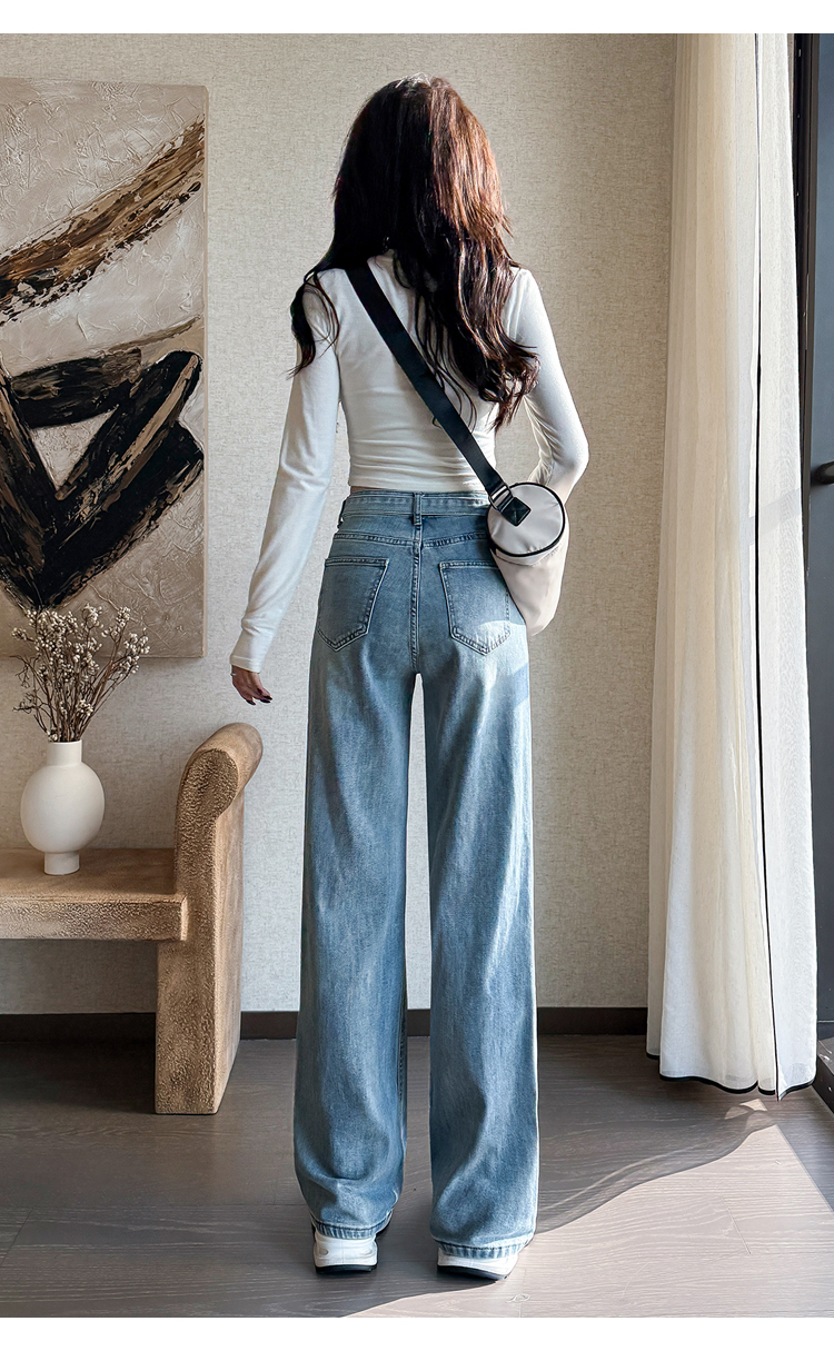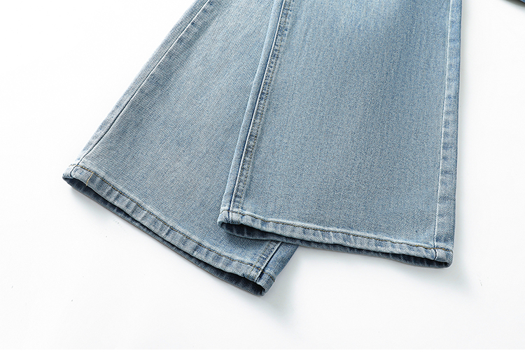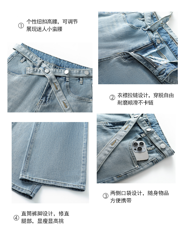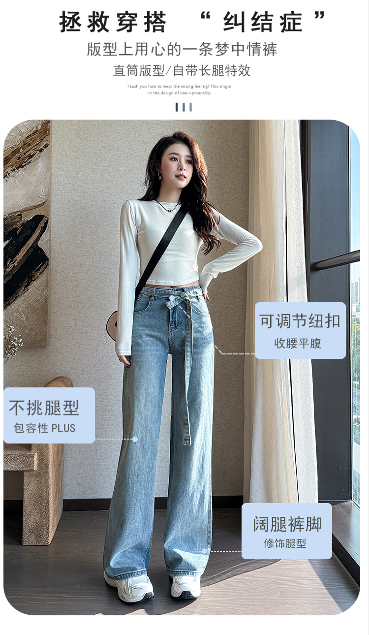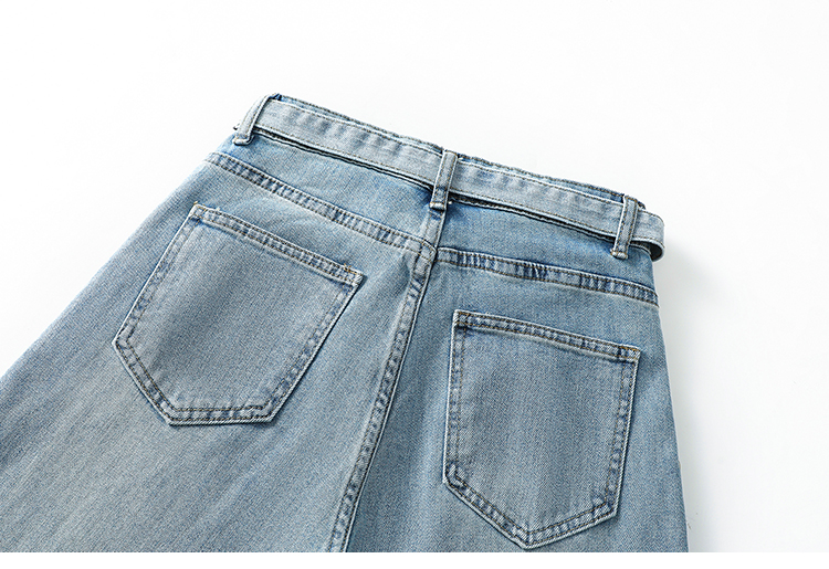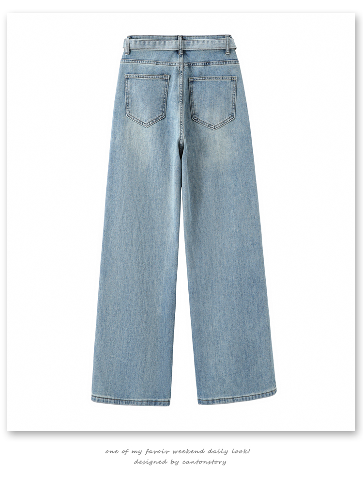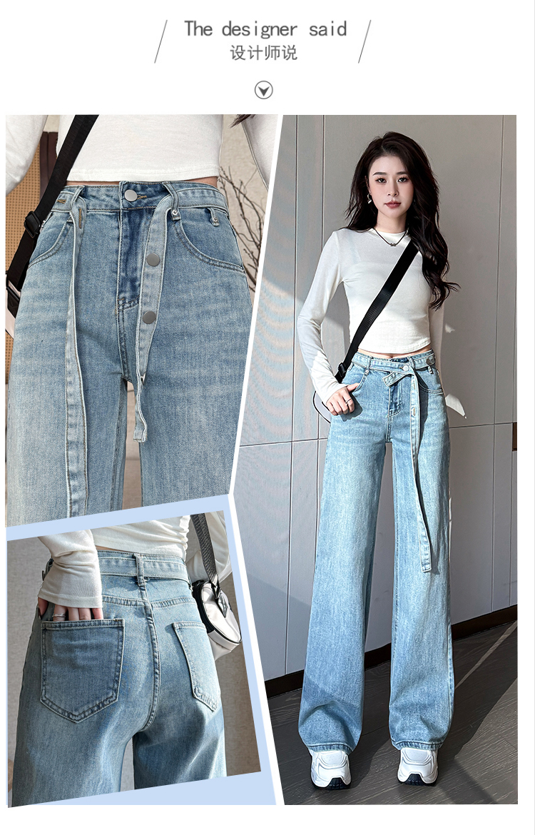 春季新款腰头系带设计牛仔弯刀裤女百搭复古水洗浅蓝高腰阔腿长裤