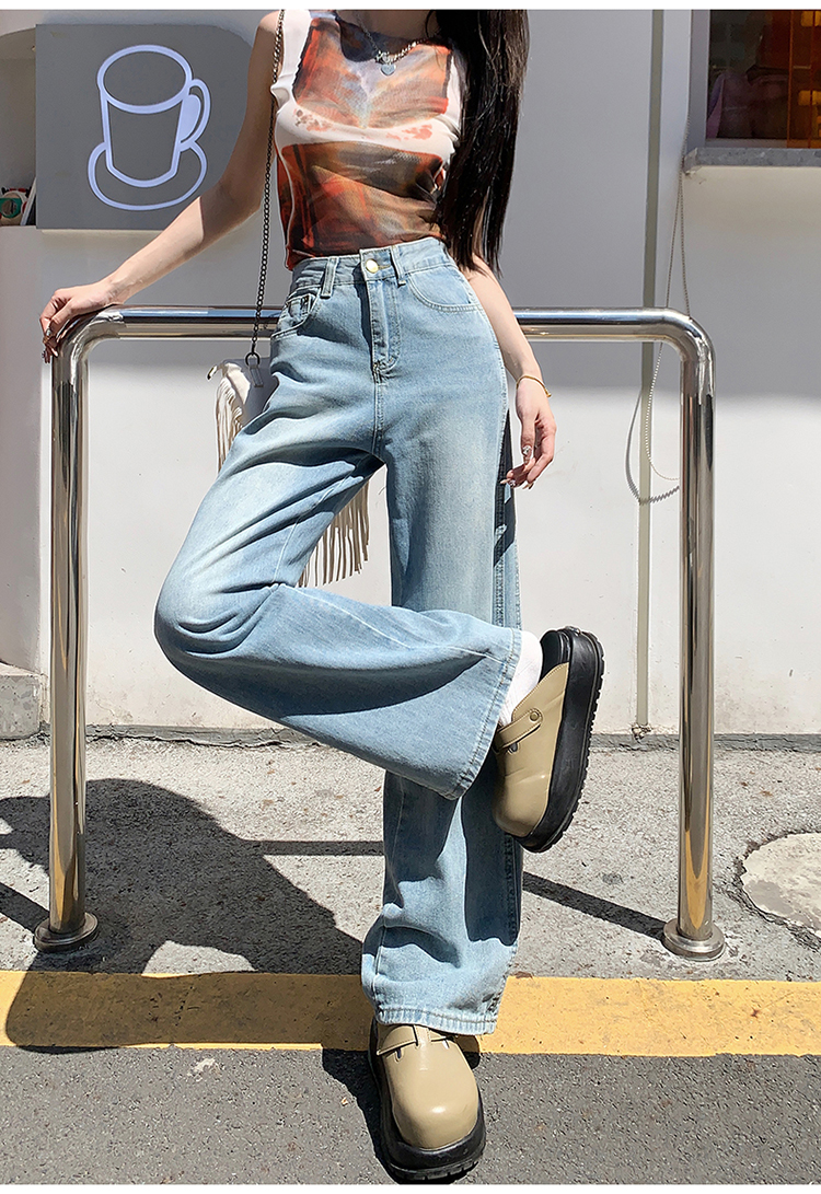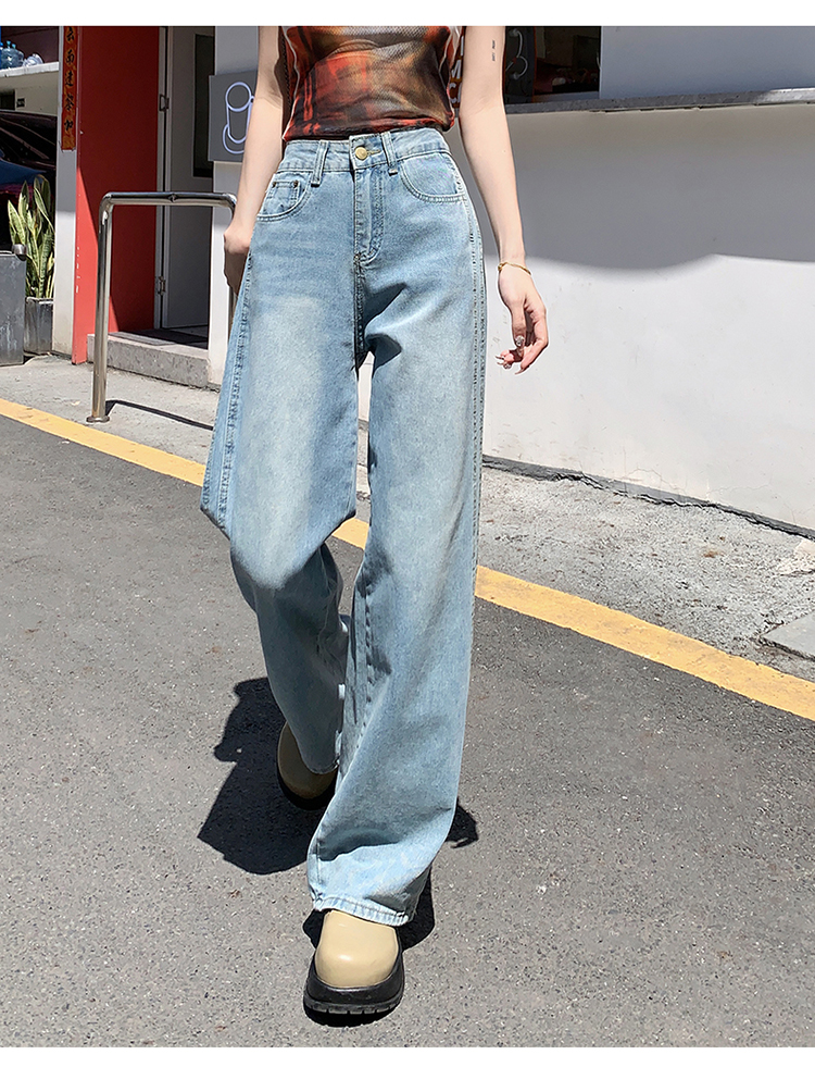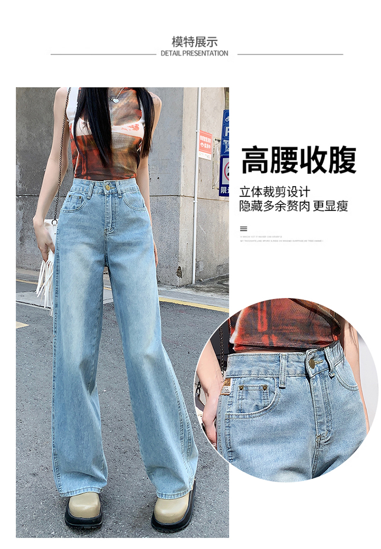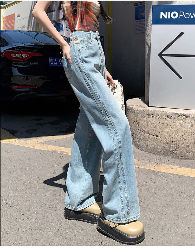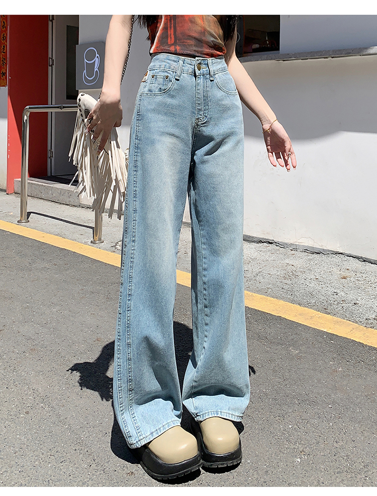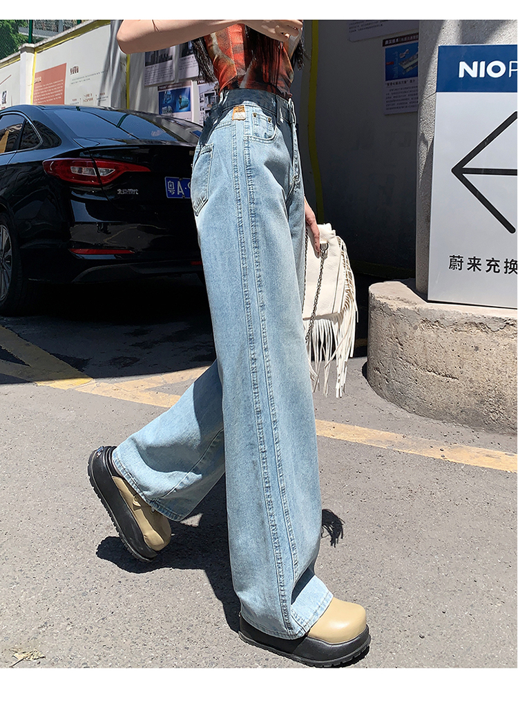 浅蓝阔腿牛仔裤女秋冬季复古怀旧撞色皮牌加绒窄版拖地垂感长裤子