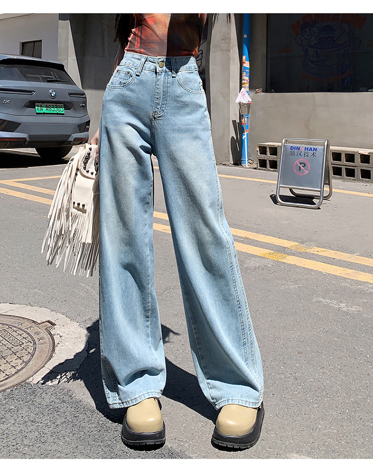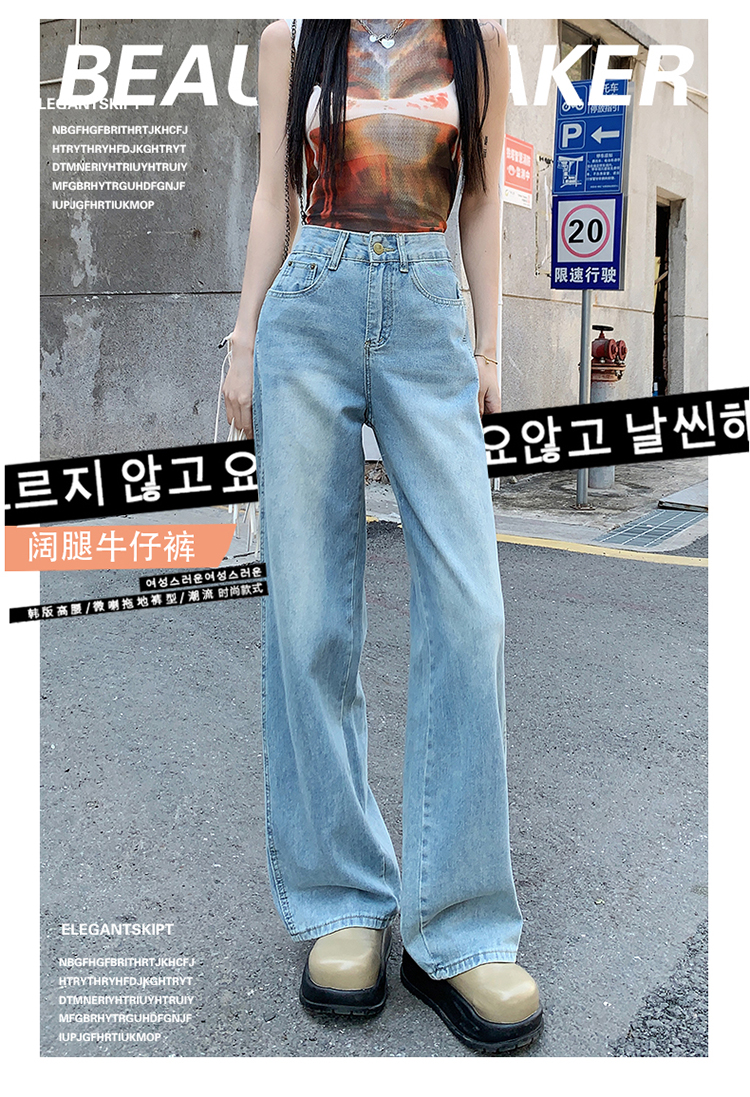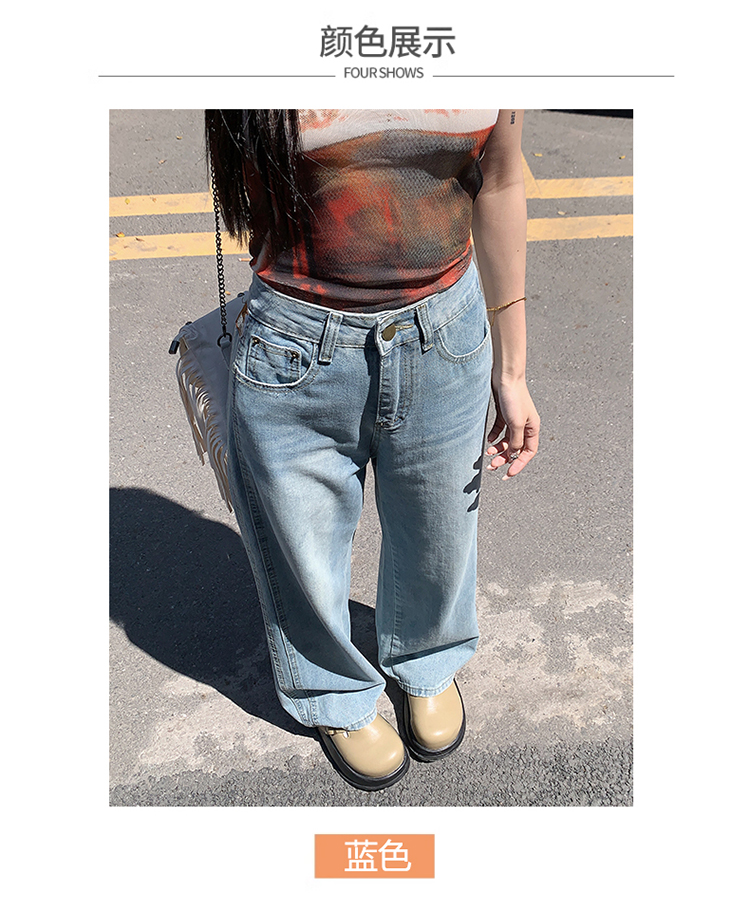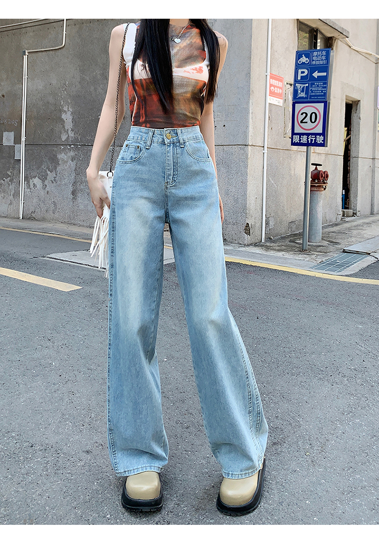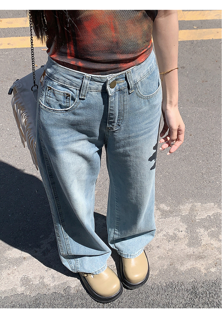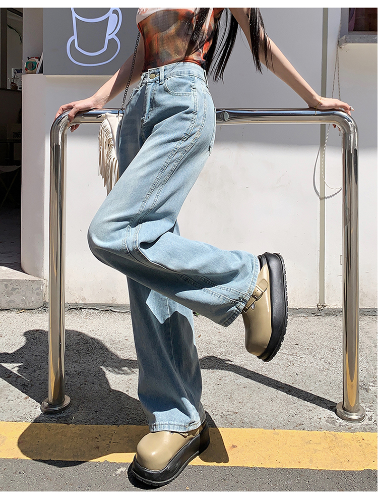 浅蓝阔腿牛仔裤女秋冬季复古怀旧撞色皮牌加绒窄版拖地垂感长裤子