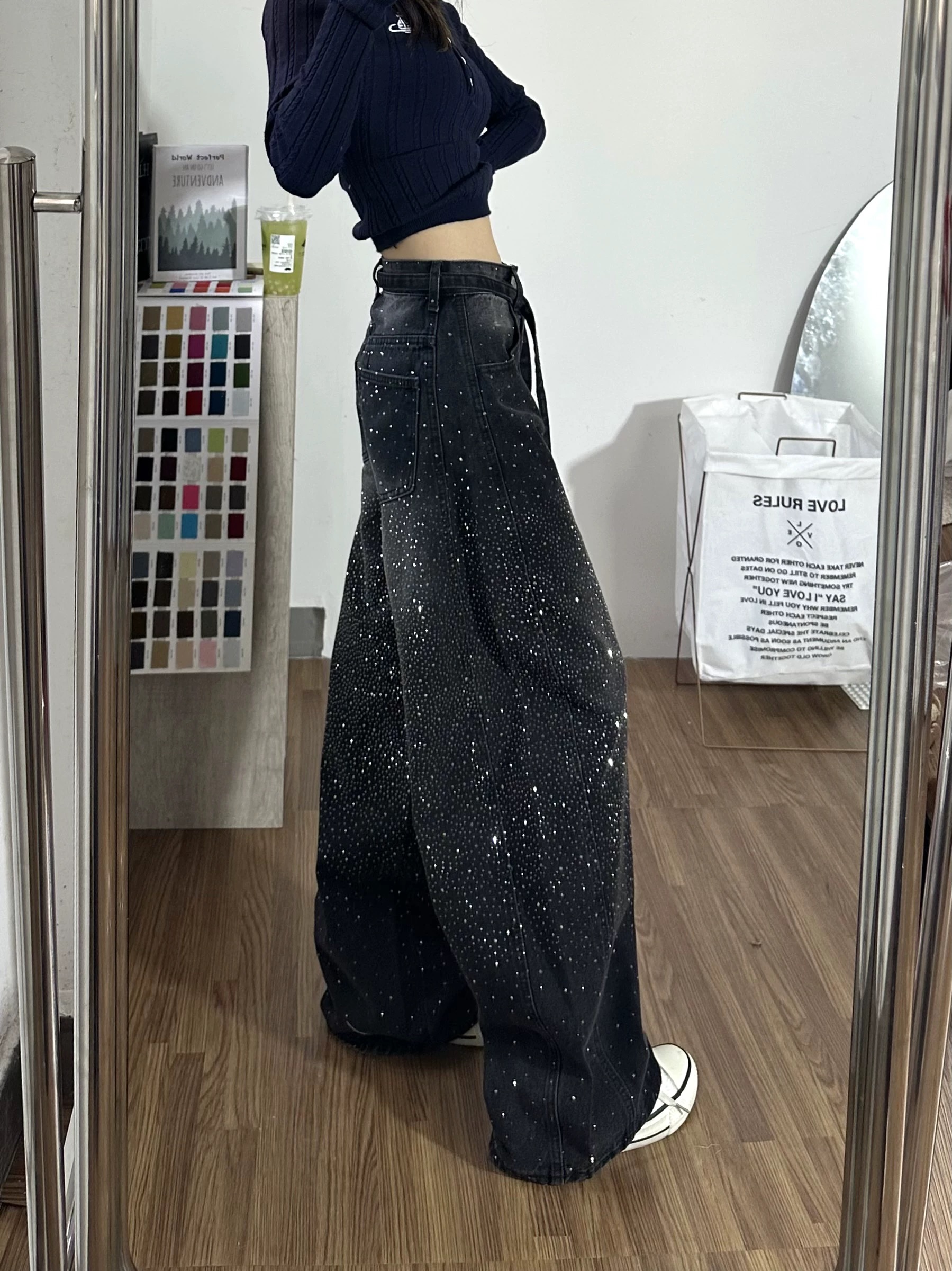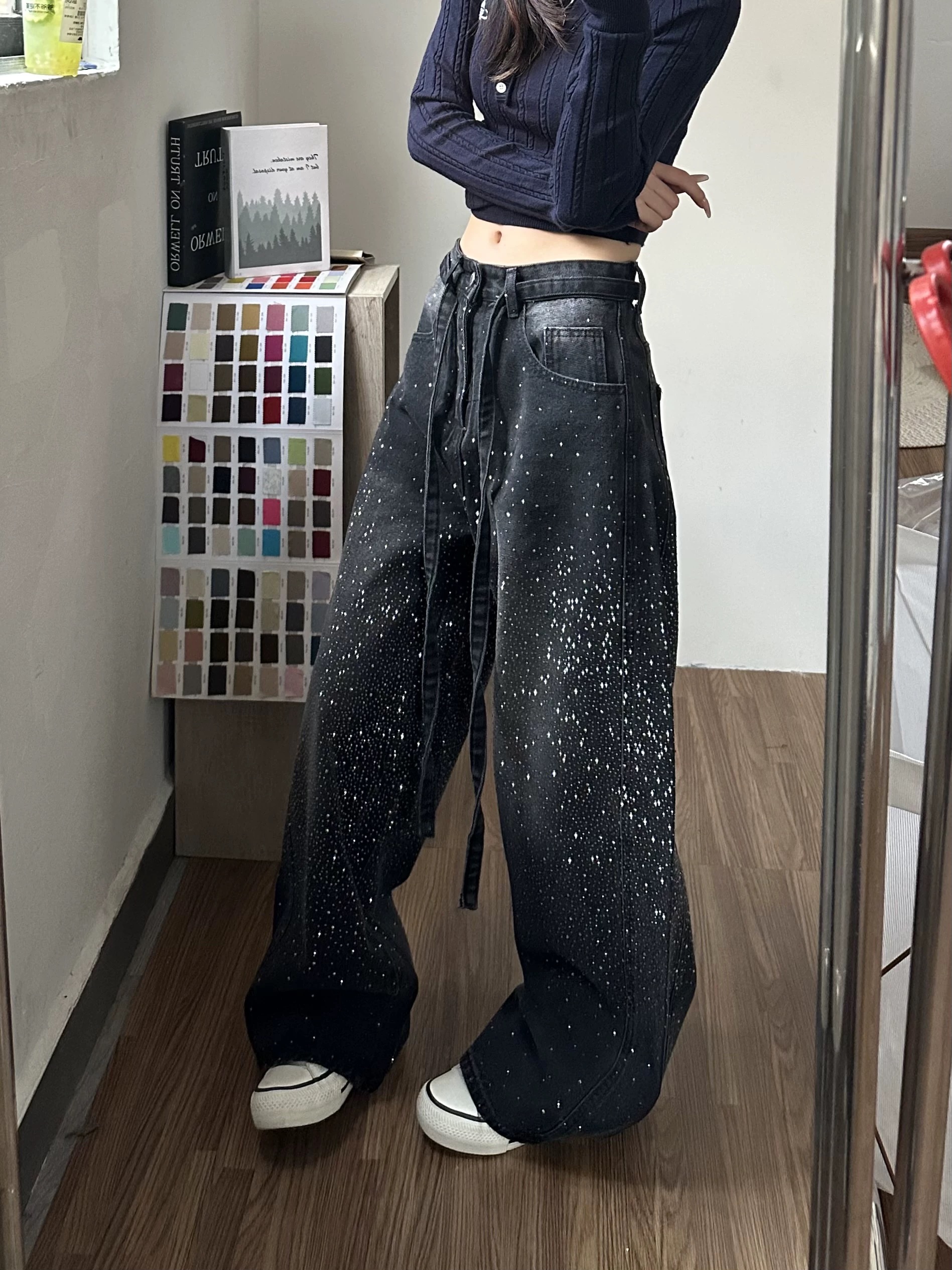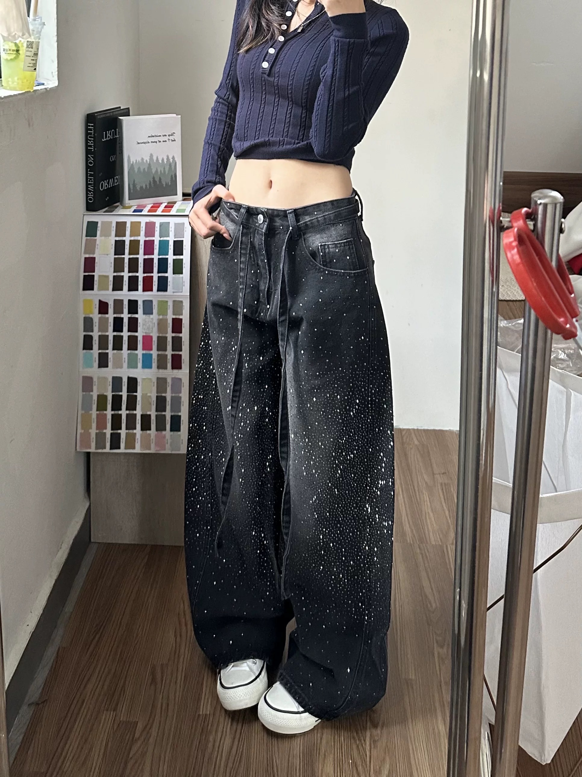 2026春季满天星烫钻阔腿牛仔裤女新款高腰显瘦小个子拖地裤