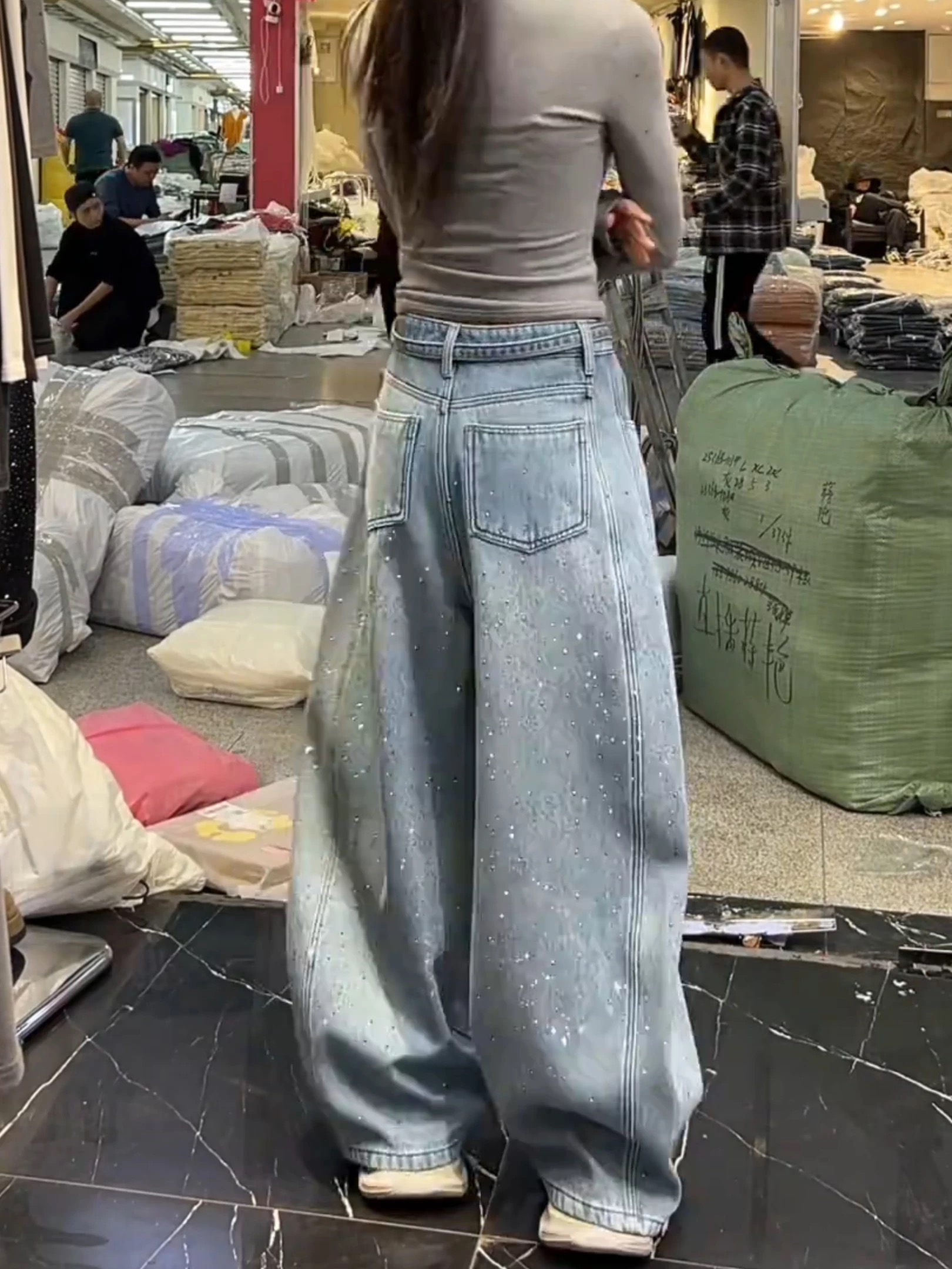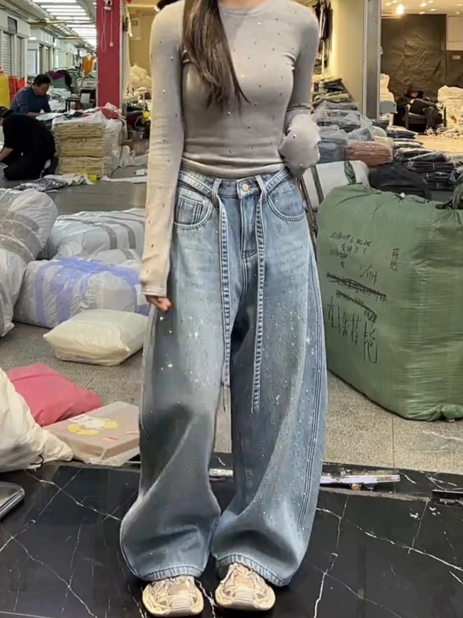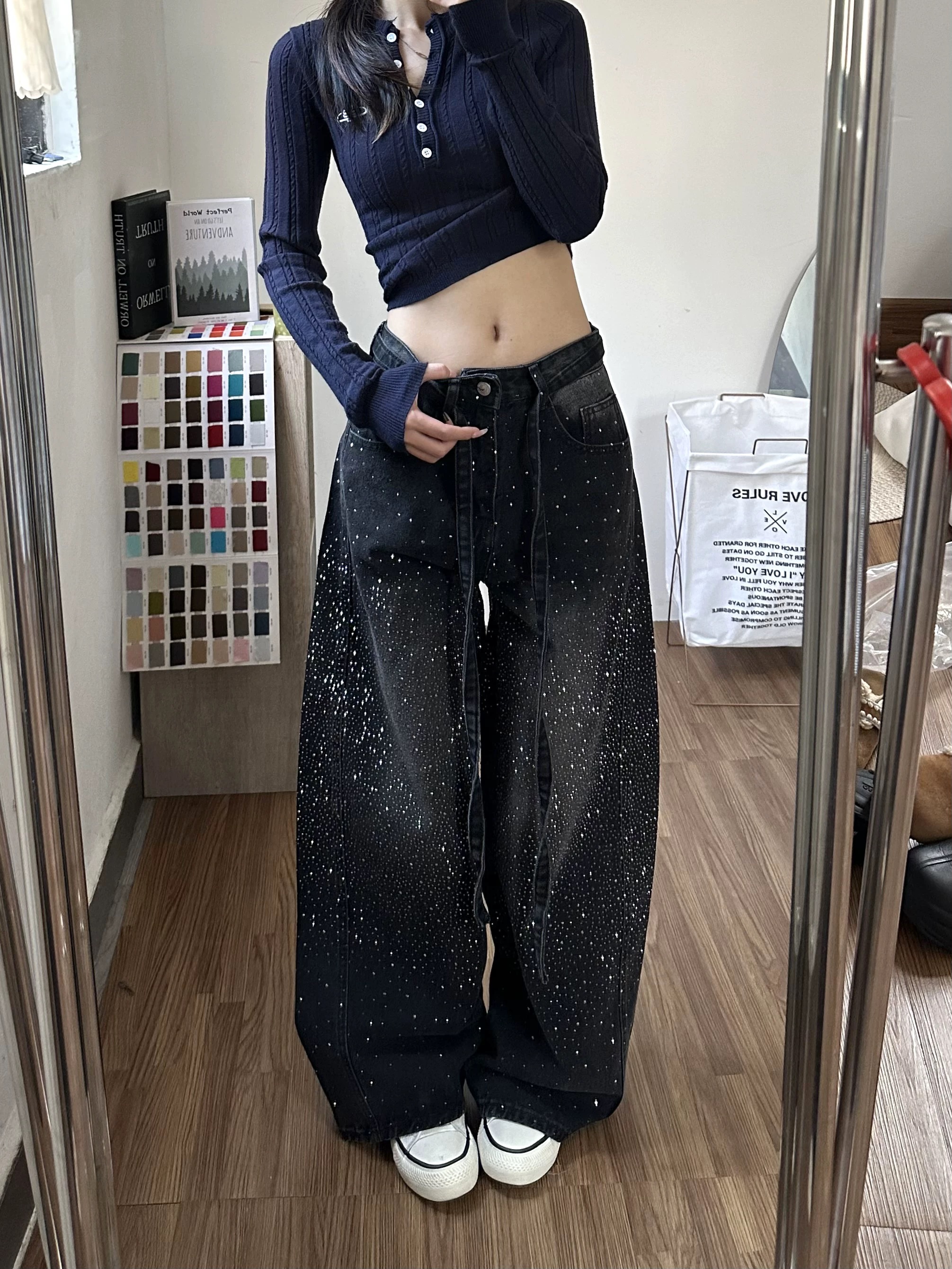 2026春季满天星烫钻阔腿牛仔裤女新款高腰显瘦小个子拖地裤