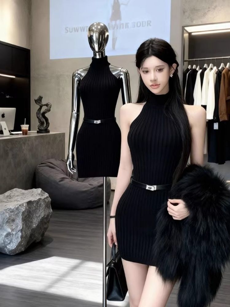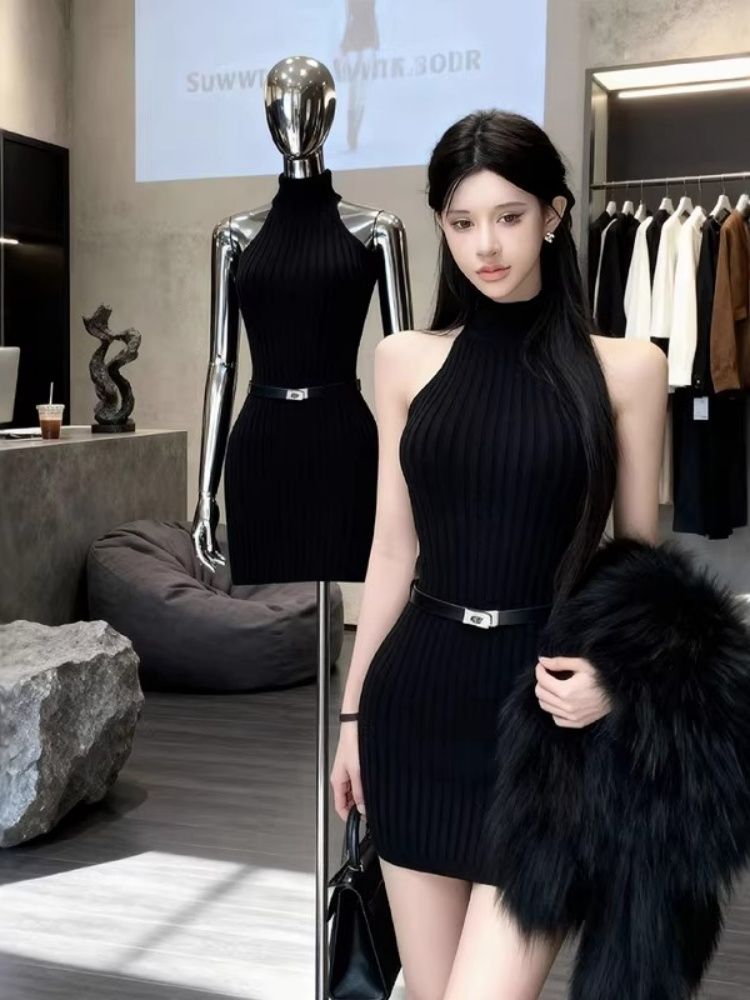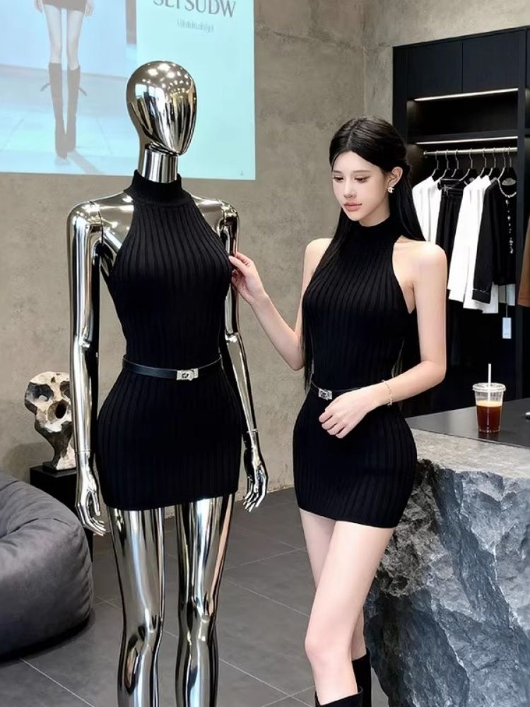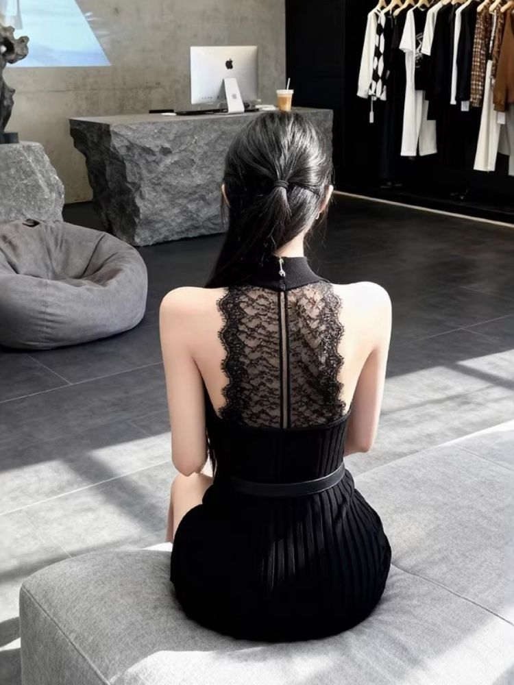 出大货 挂脖无袖针织连衣裙女秋冬气质高级感蕾丝露背包臀短裙子
