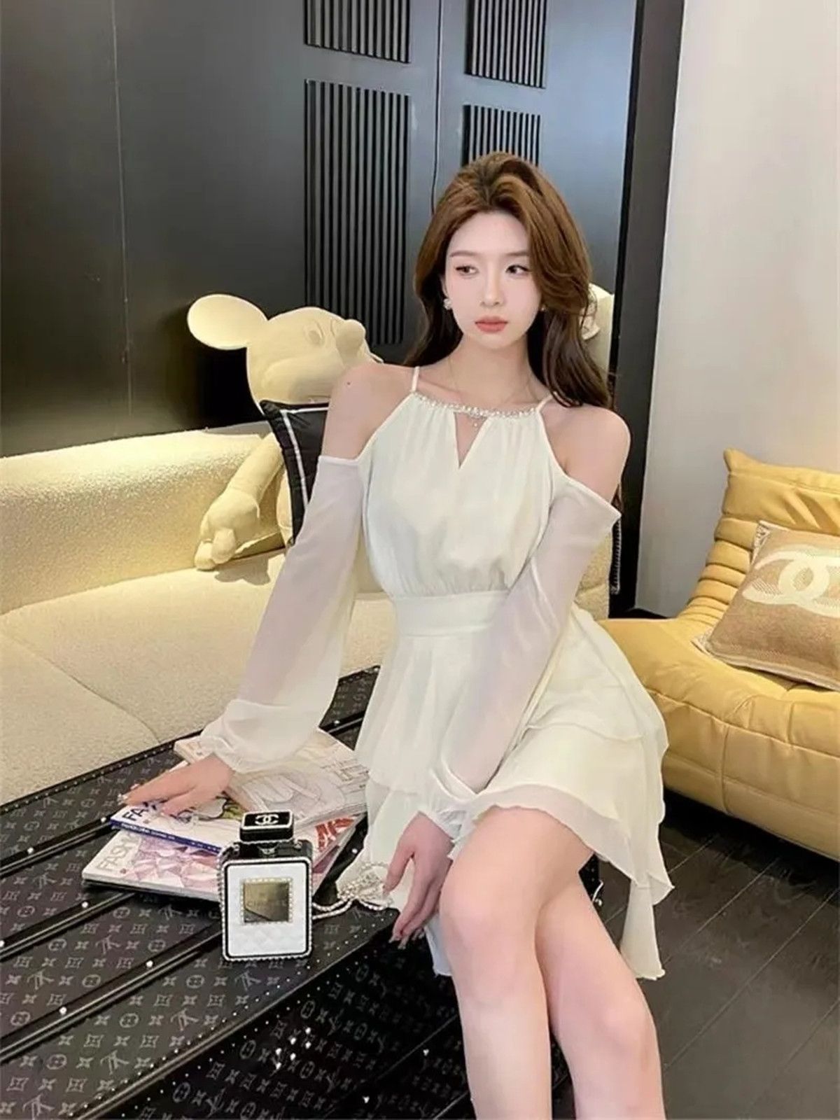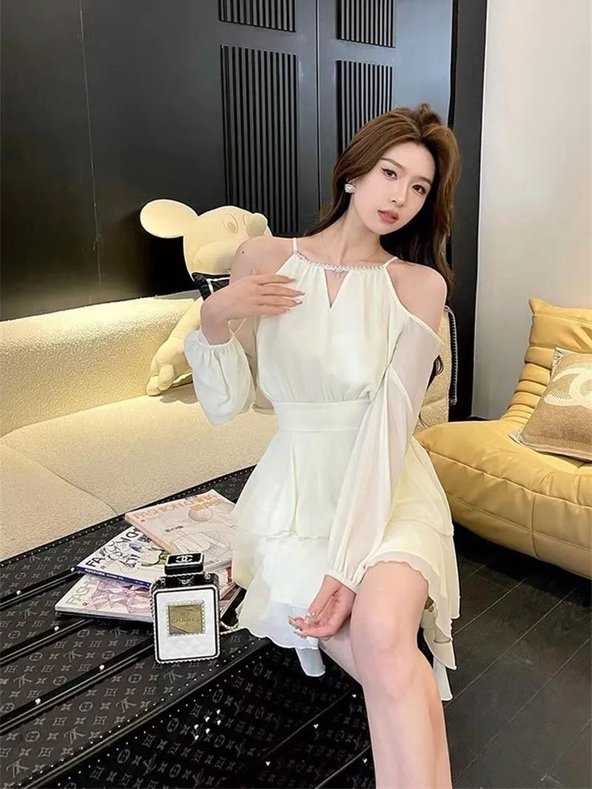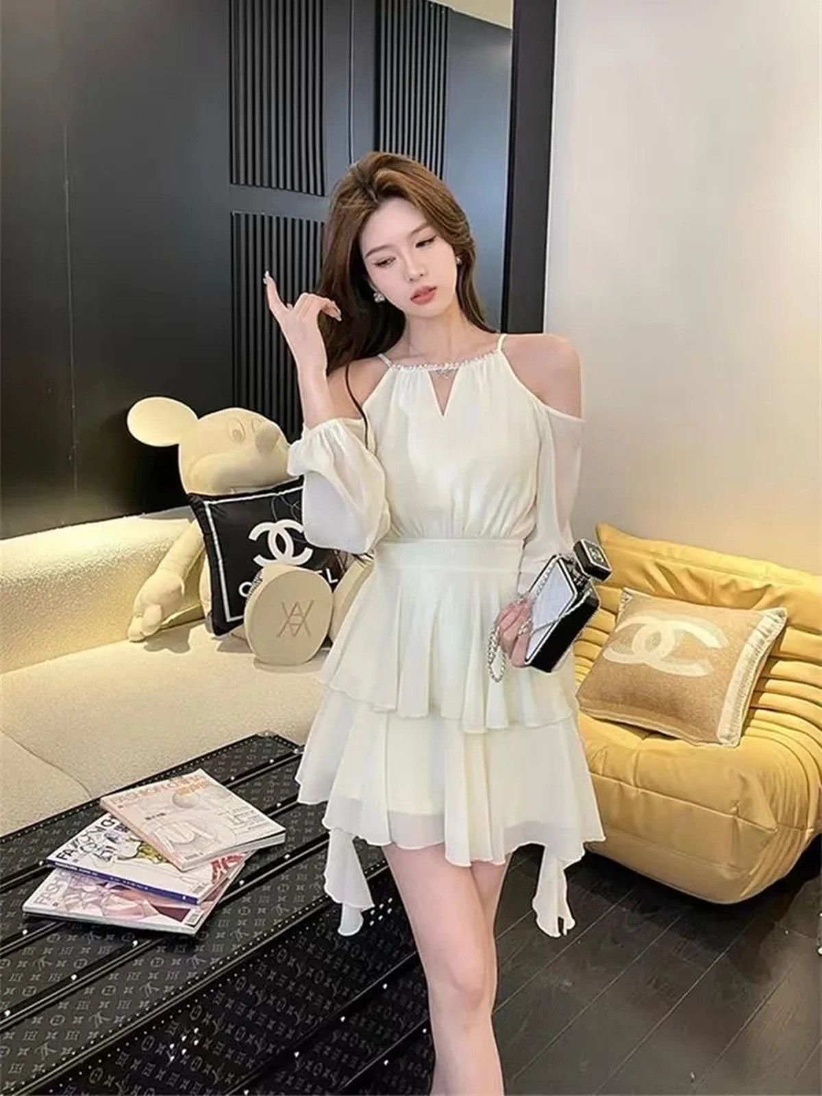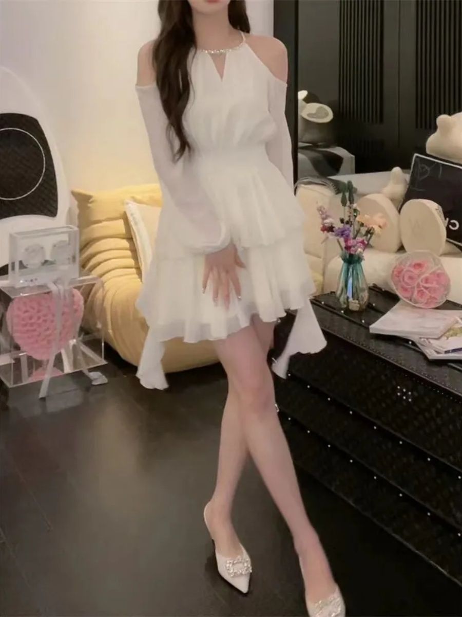 出大货 吊带挂脖连衣裙女春夏2025新款温柔系穿搭蛋糕露肩短裙子