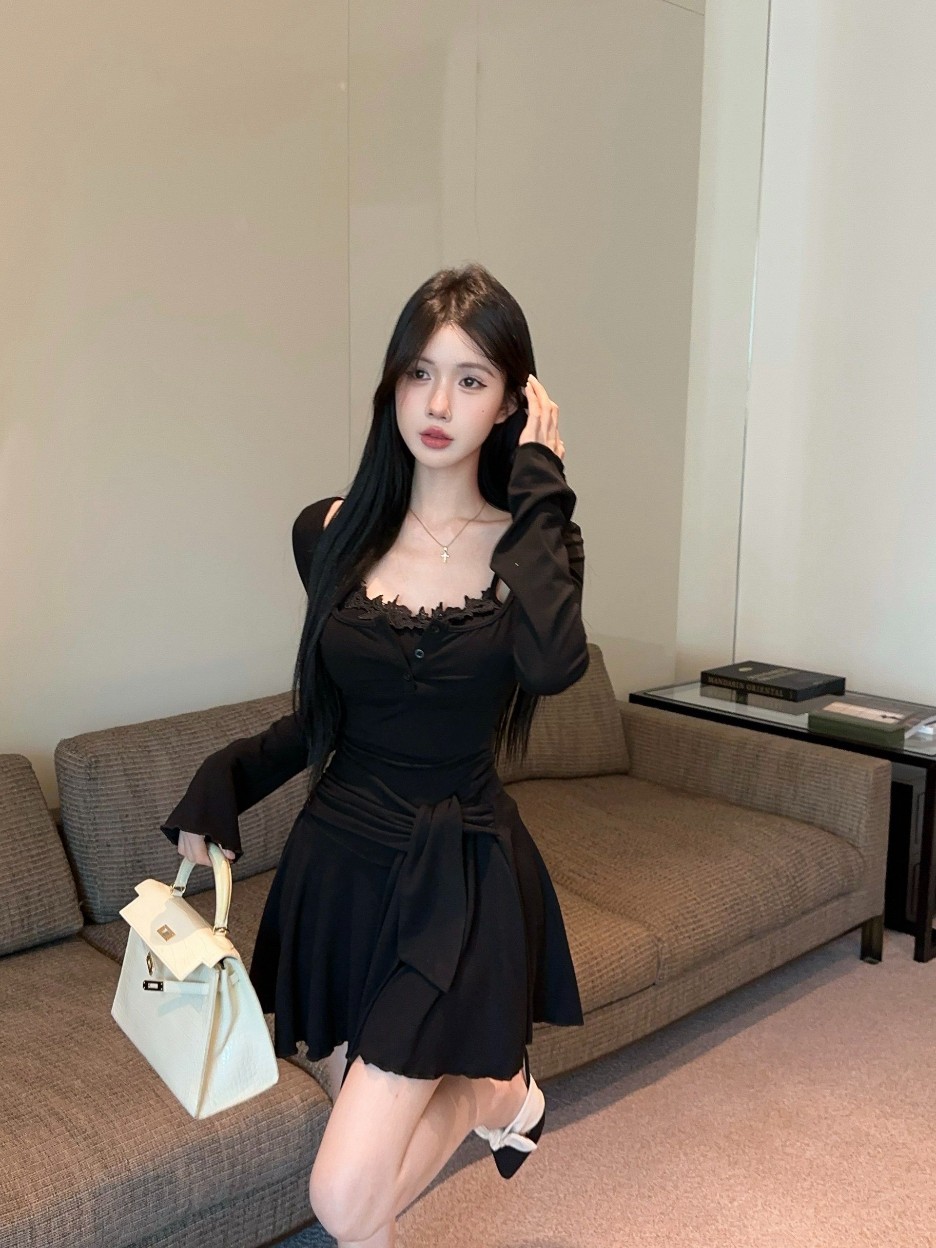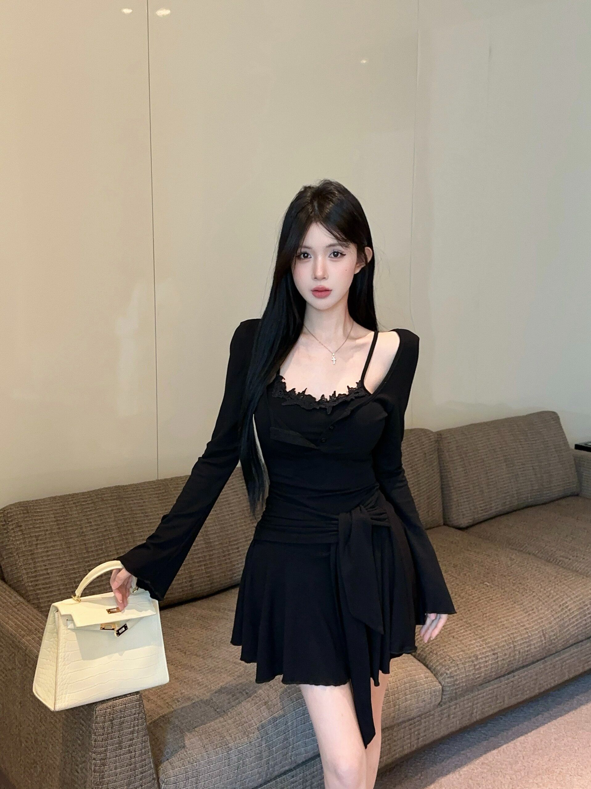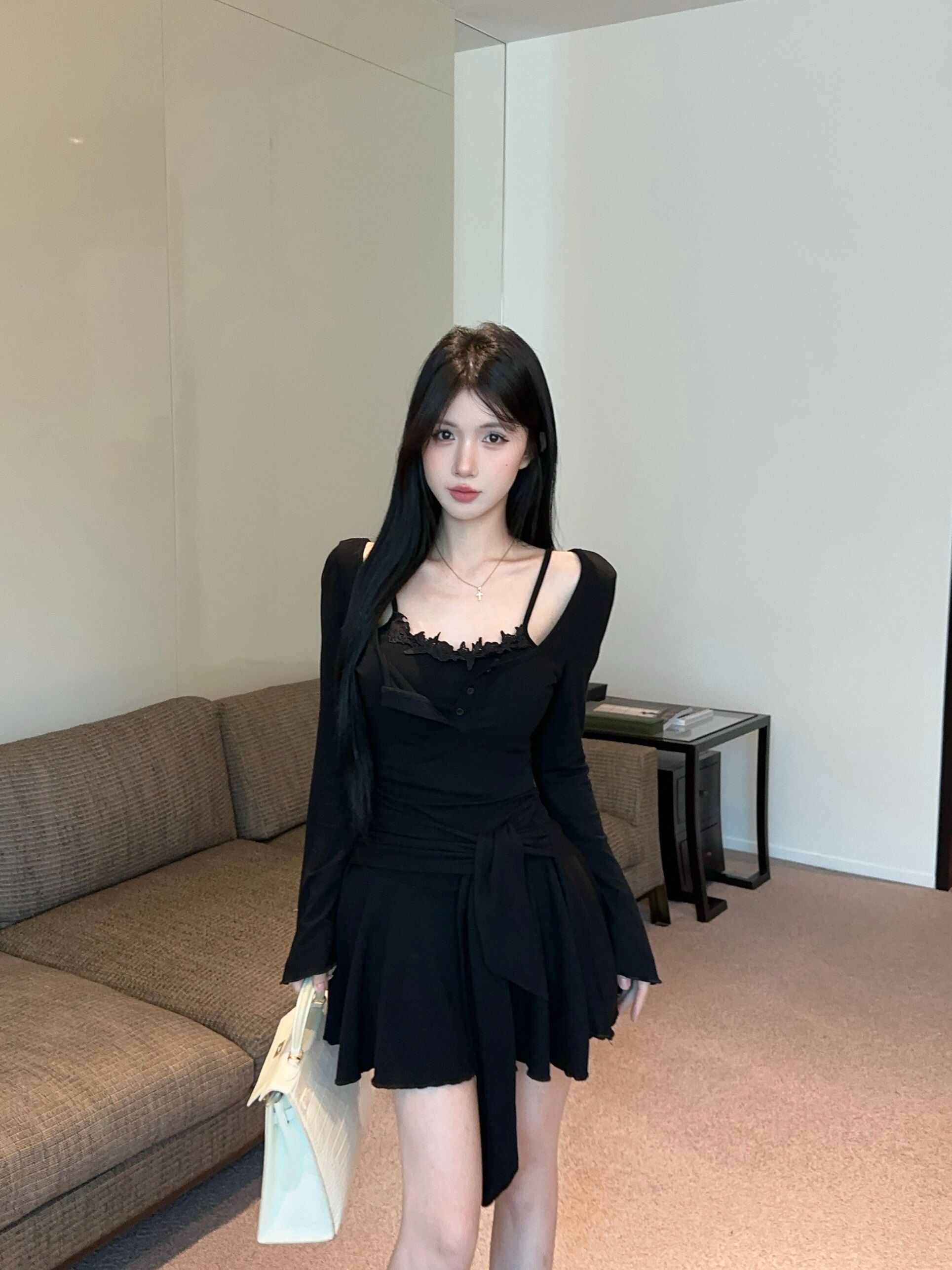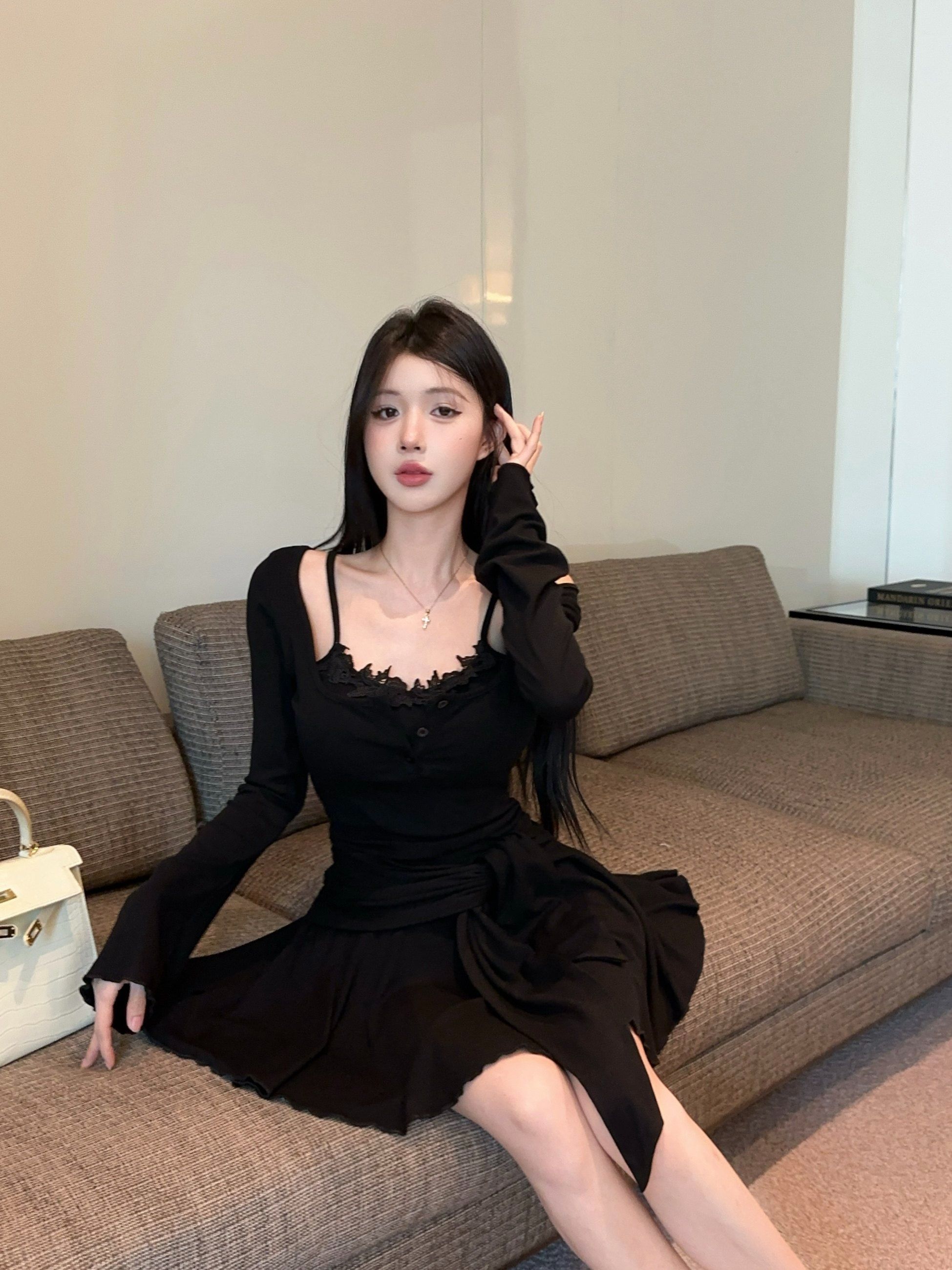 出大货 蕾丝吊带假两件长袖连衣裙2026秋独特漂亮气质a字短裙