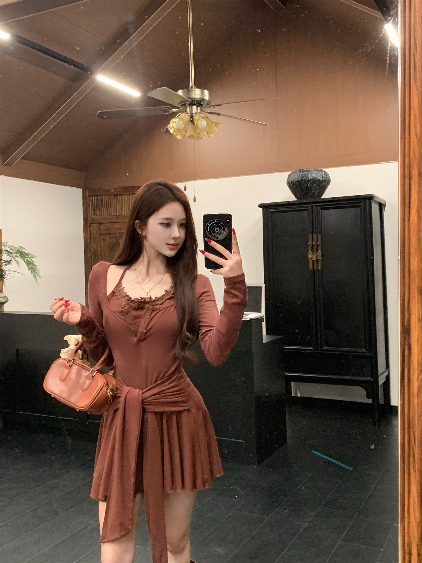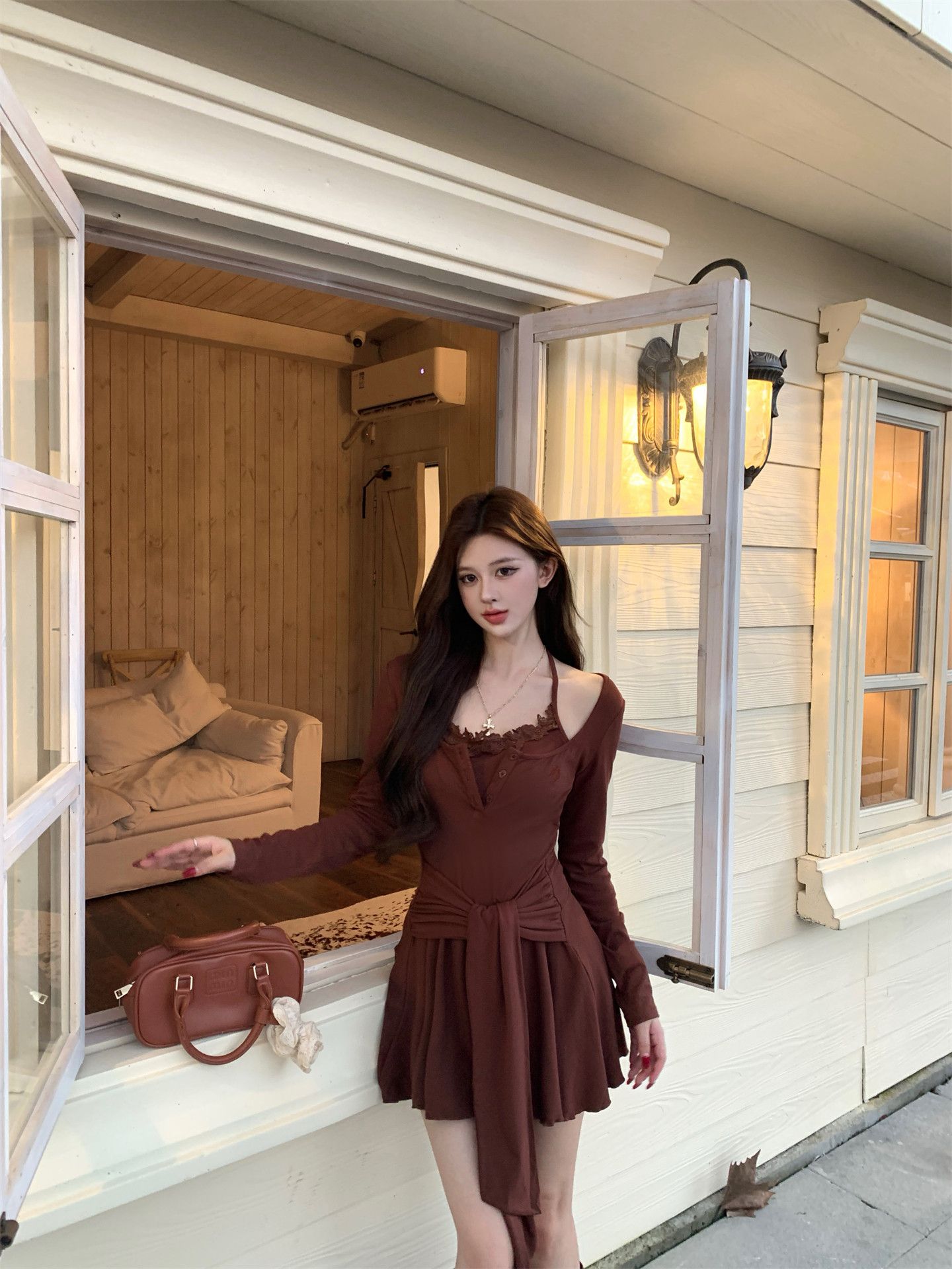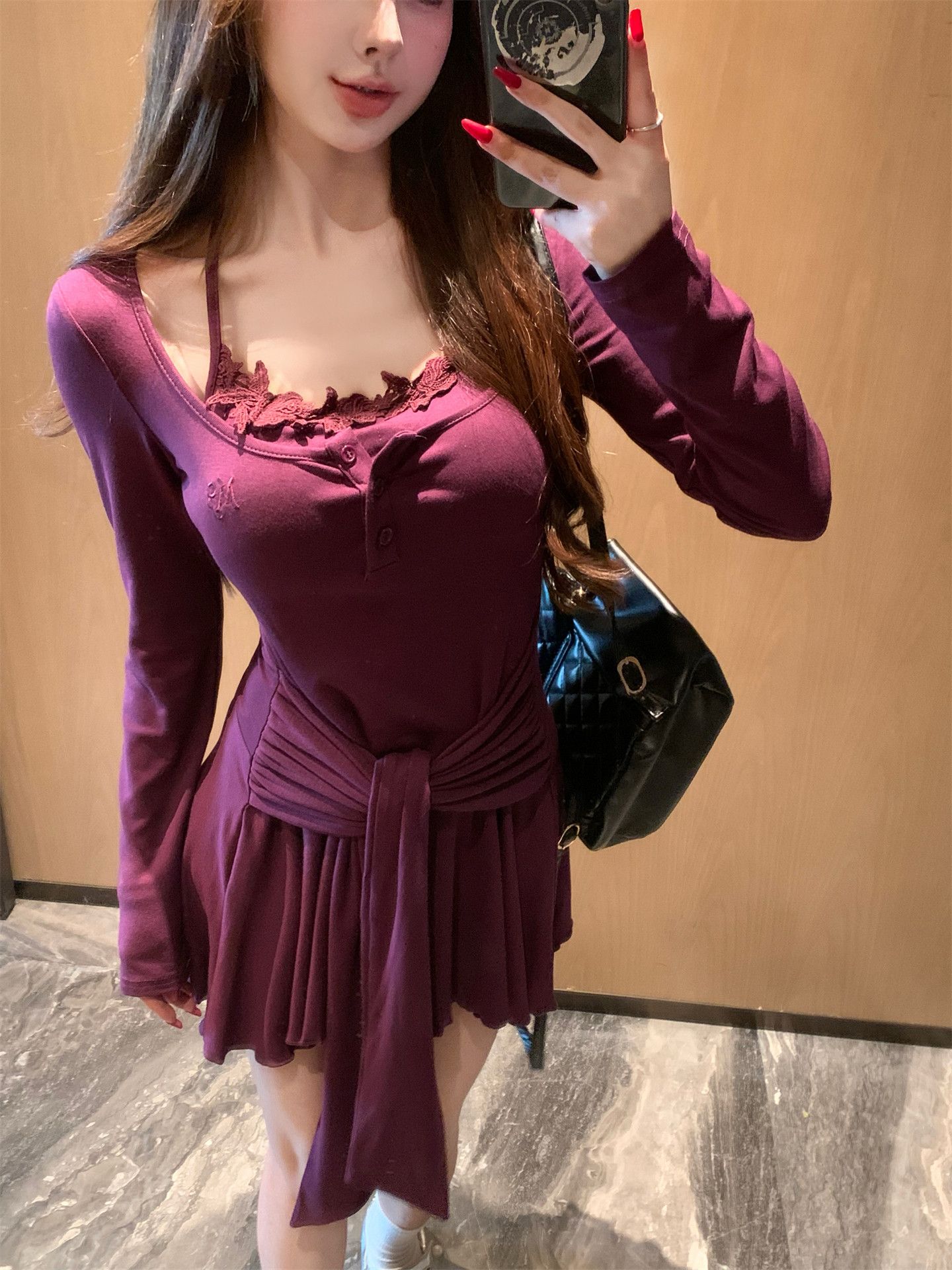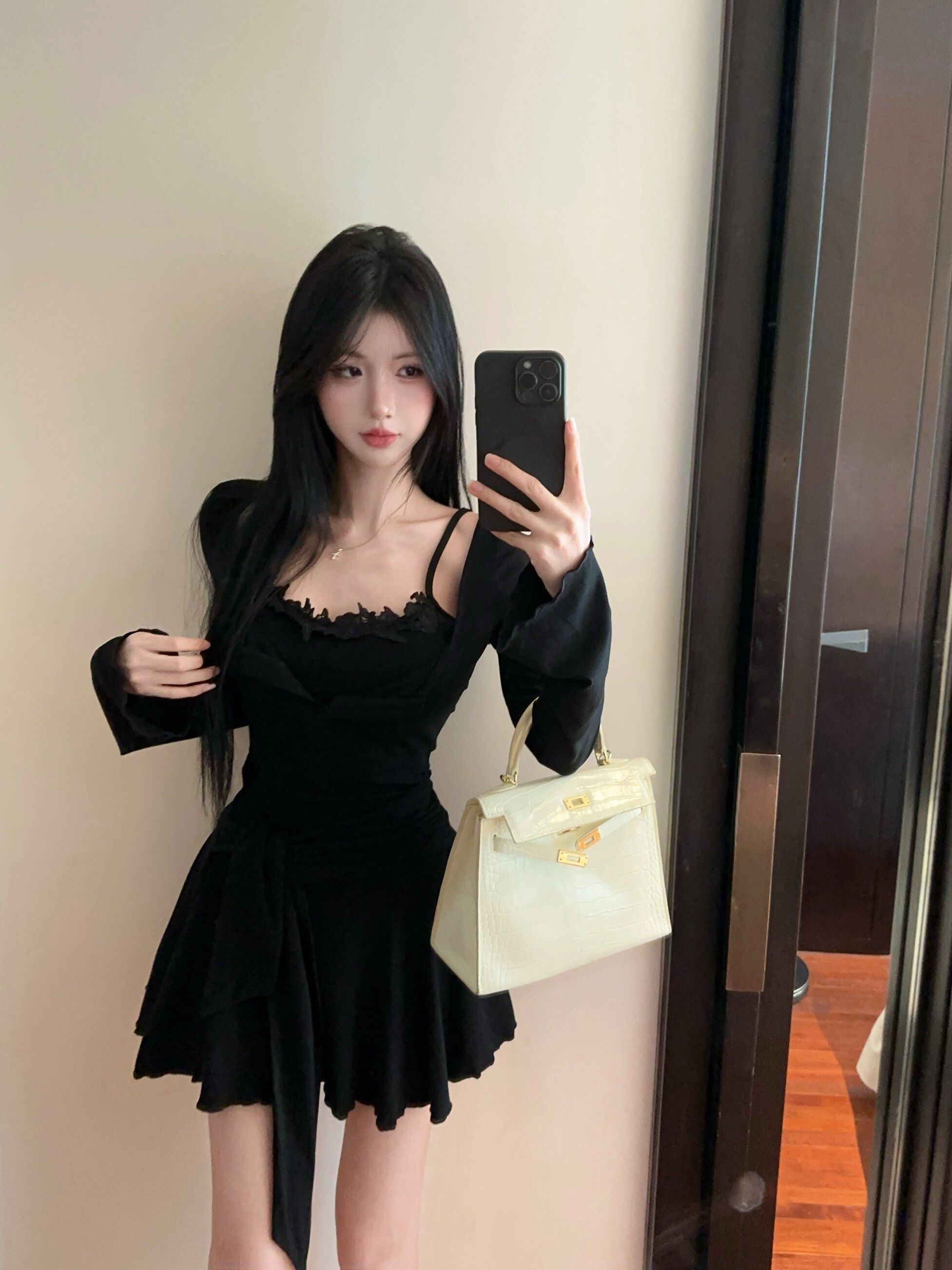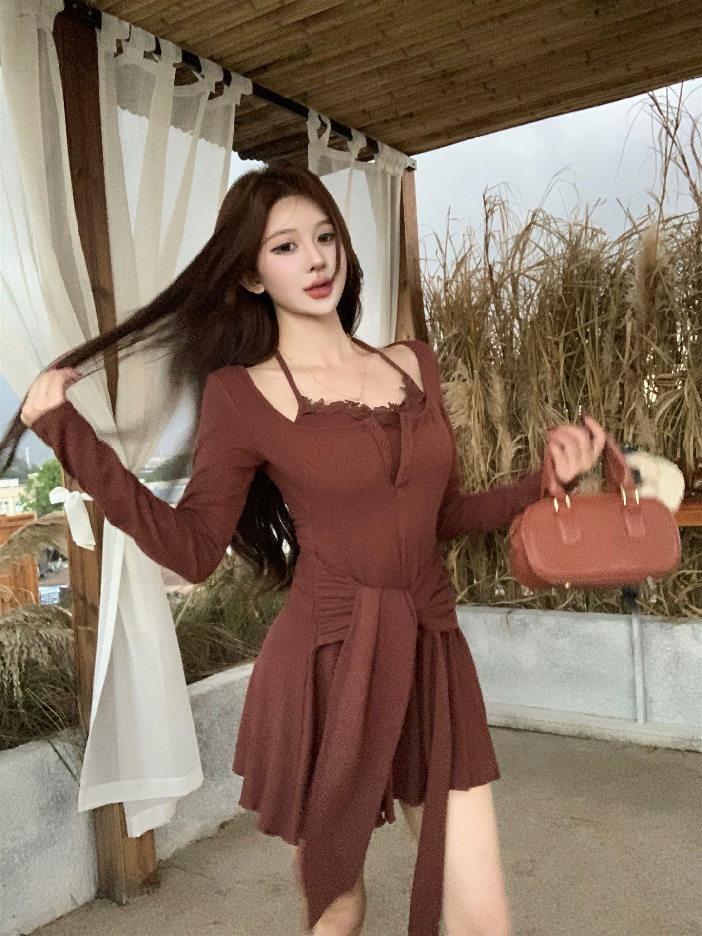 出大货 蕾丝吊带假两件长袖连衣裙2026秋独特漂亮气质a字短裙