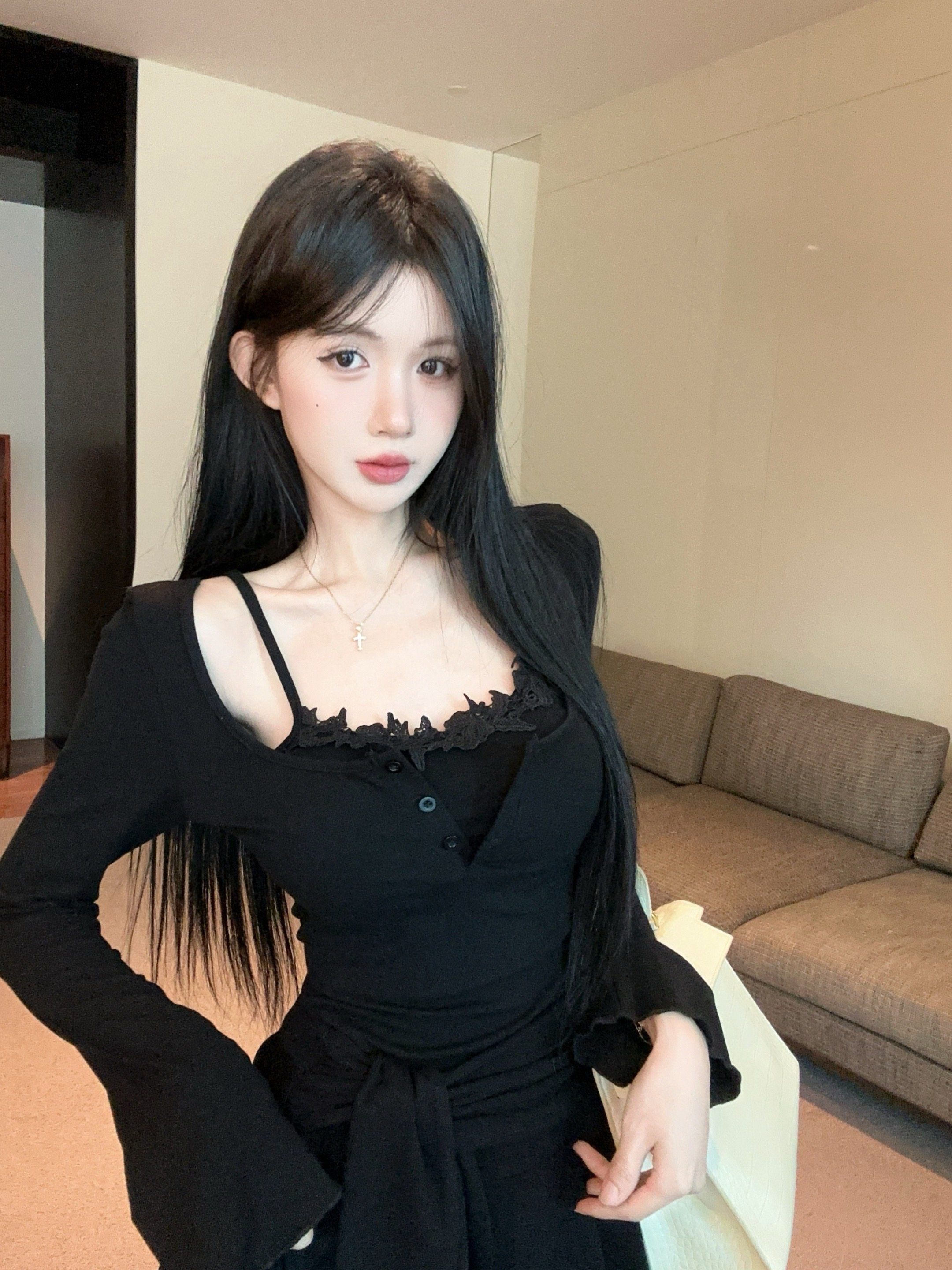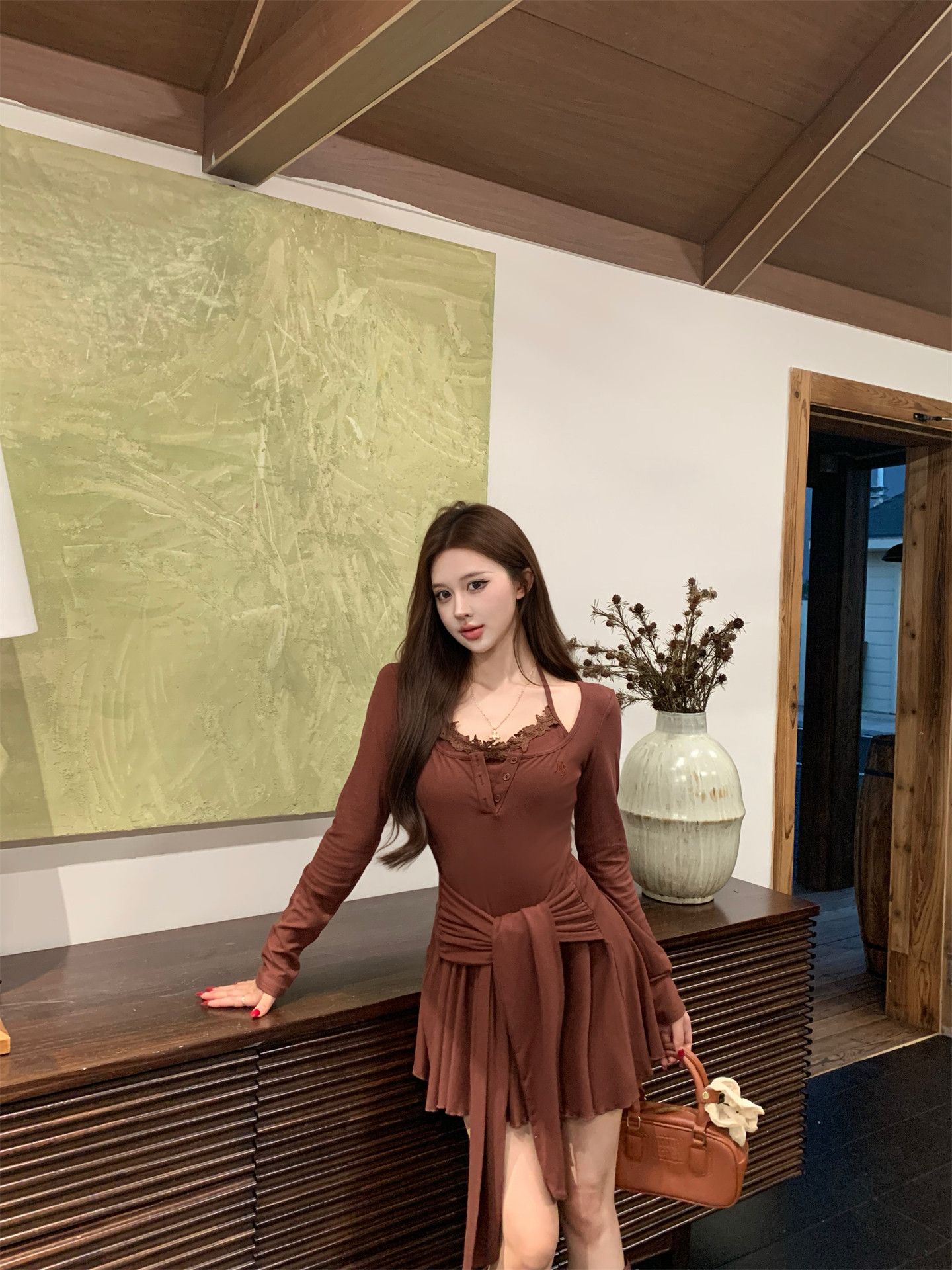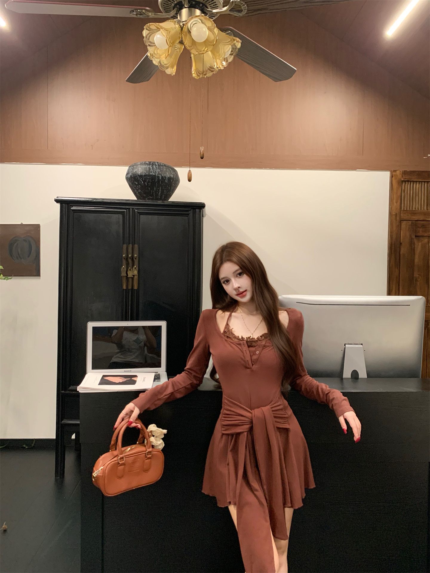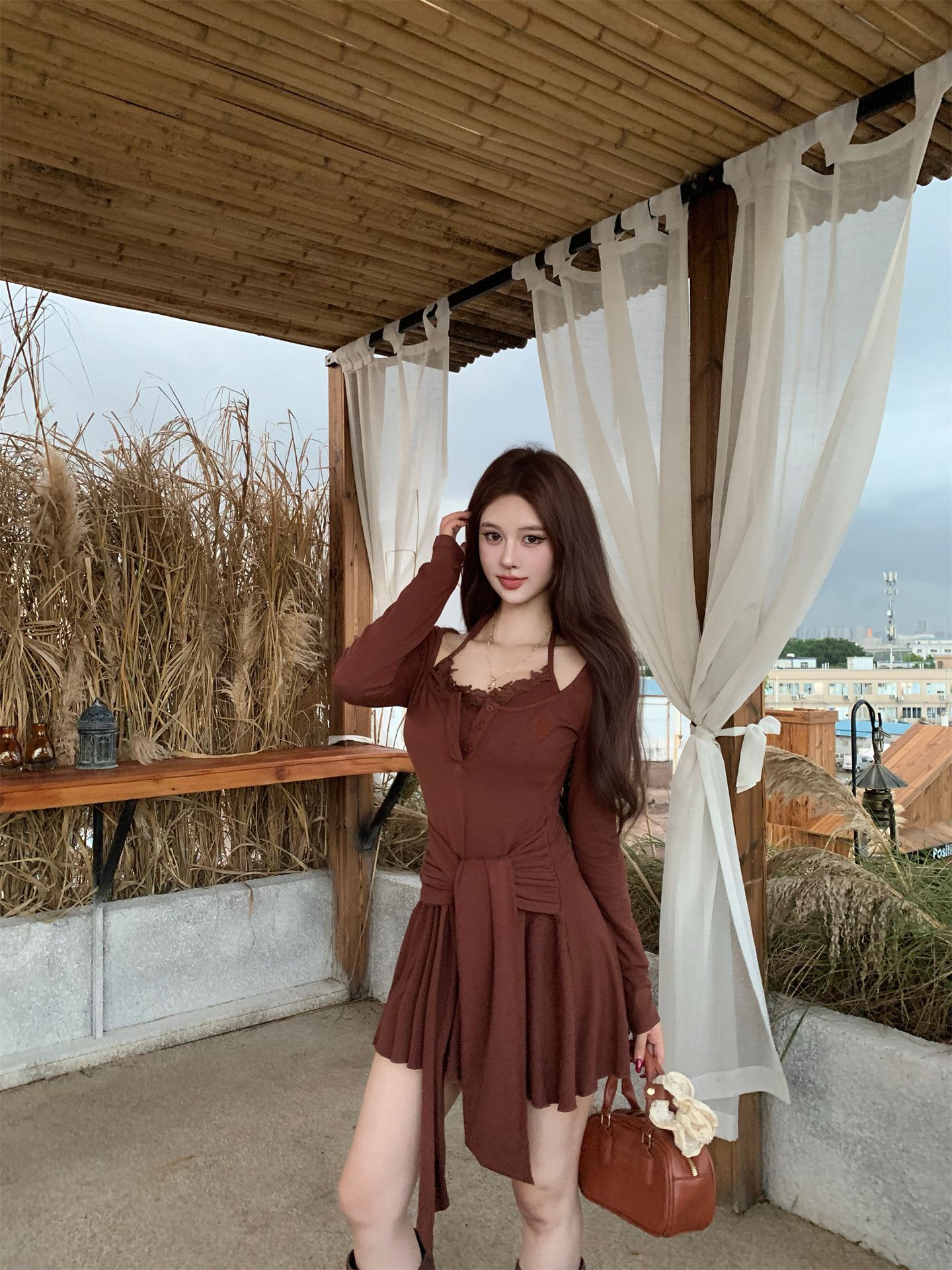 出大货 蕾丝吊带假两件长袖连衣裙2026秋独特漂亮气质a字短裙