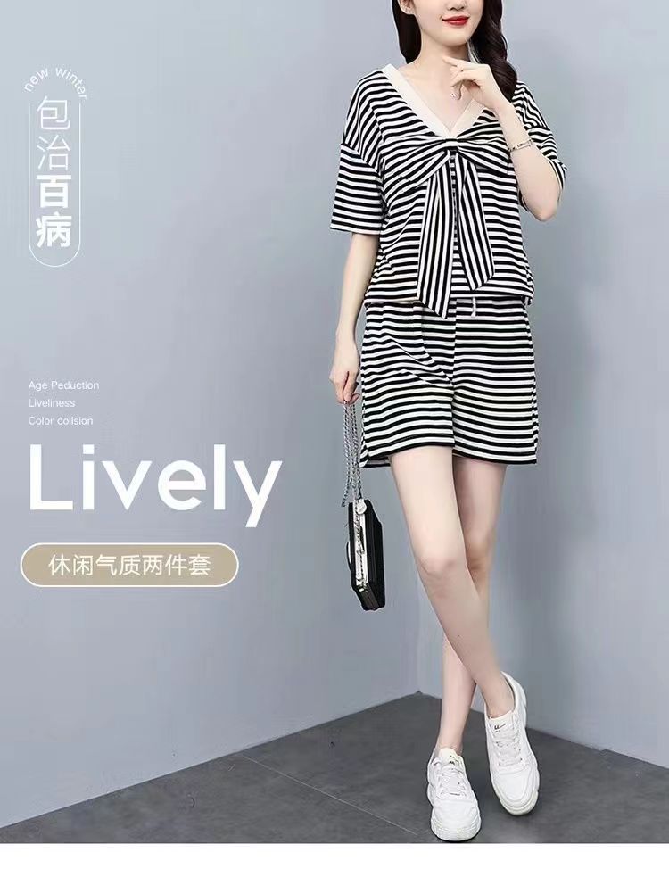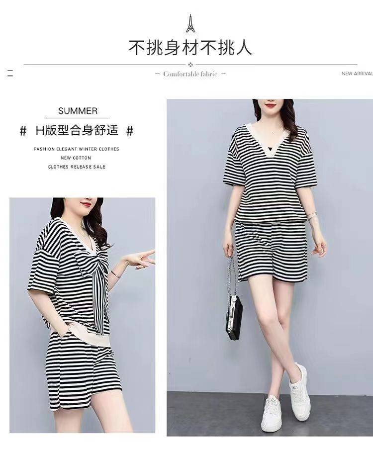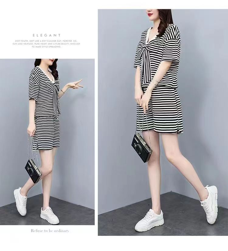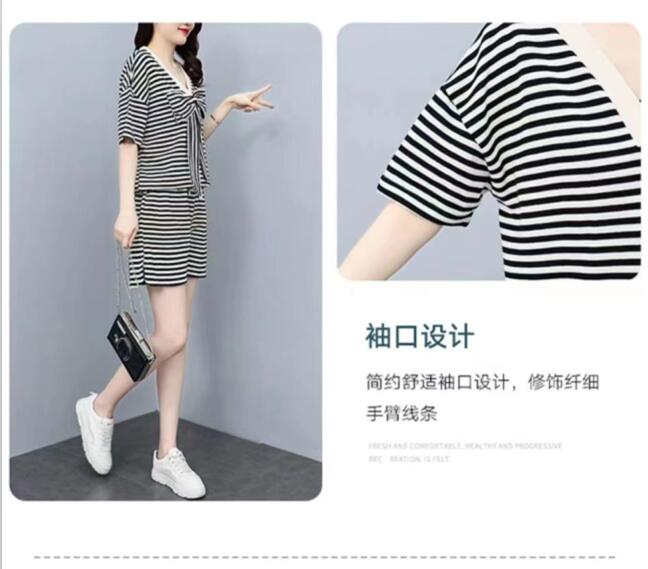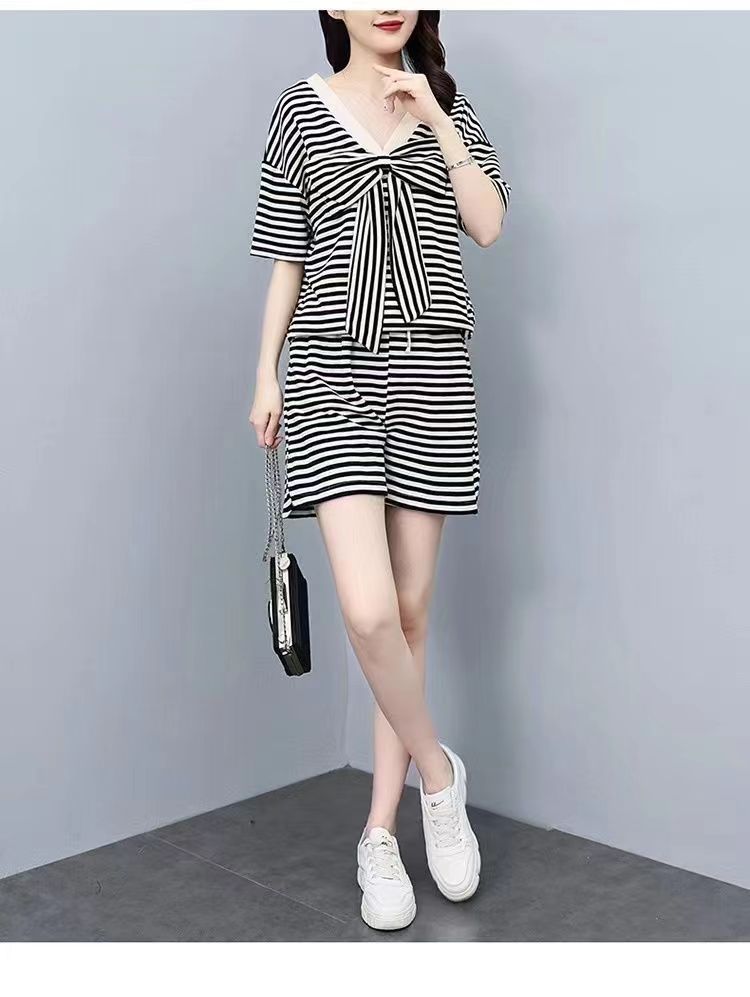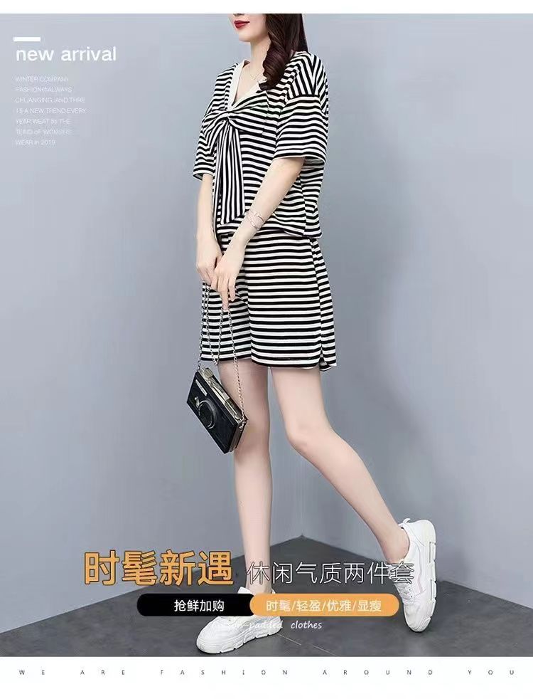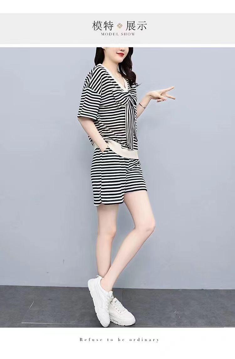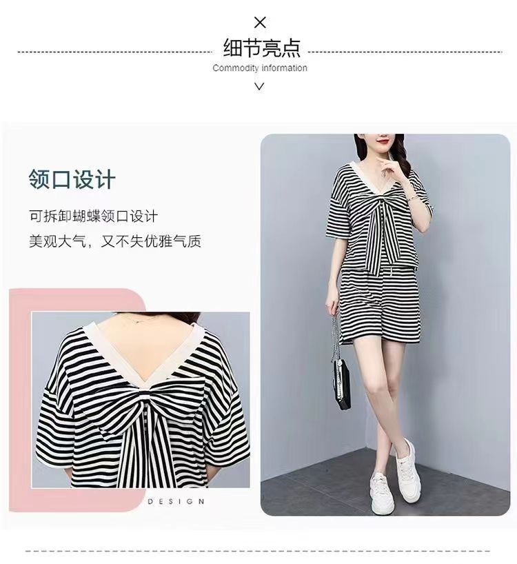 双面可穿 夏季新款韩版宽松条纹蝴蝶结短袖t恤裤子两件套大码女装