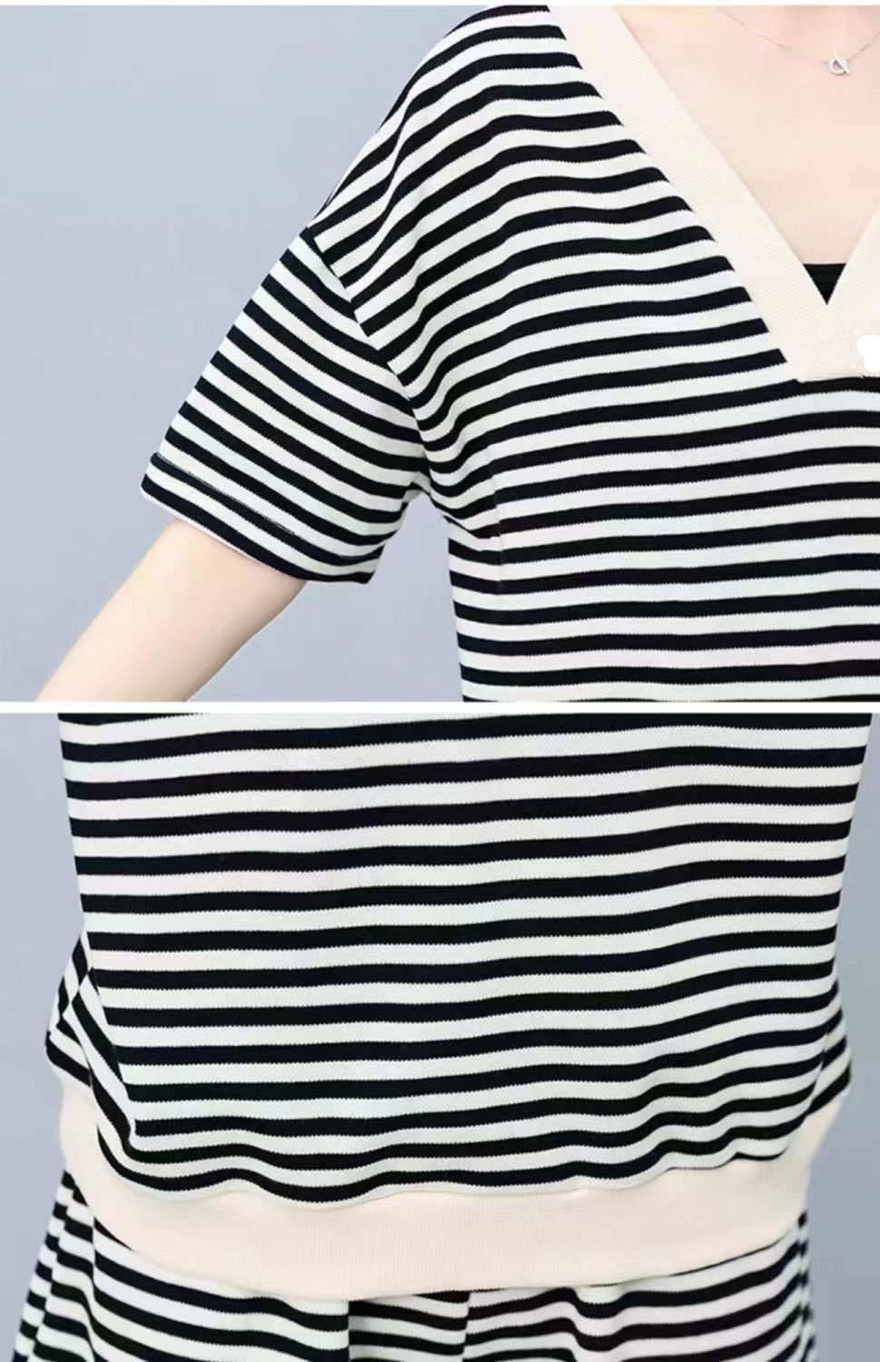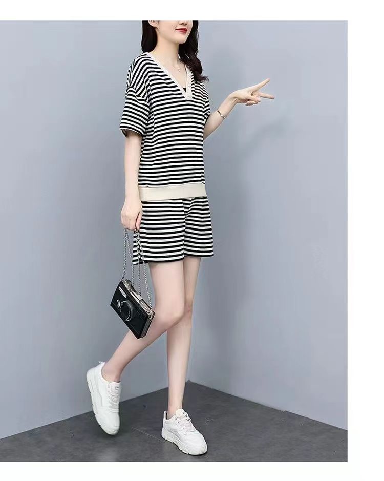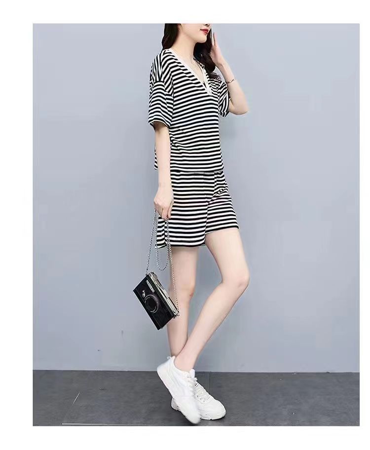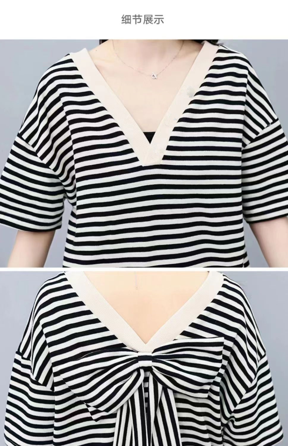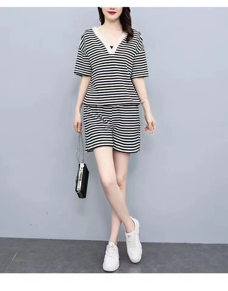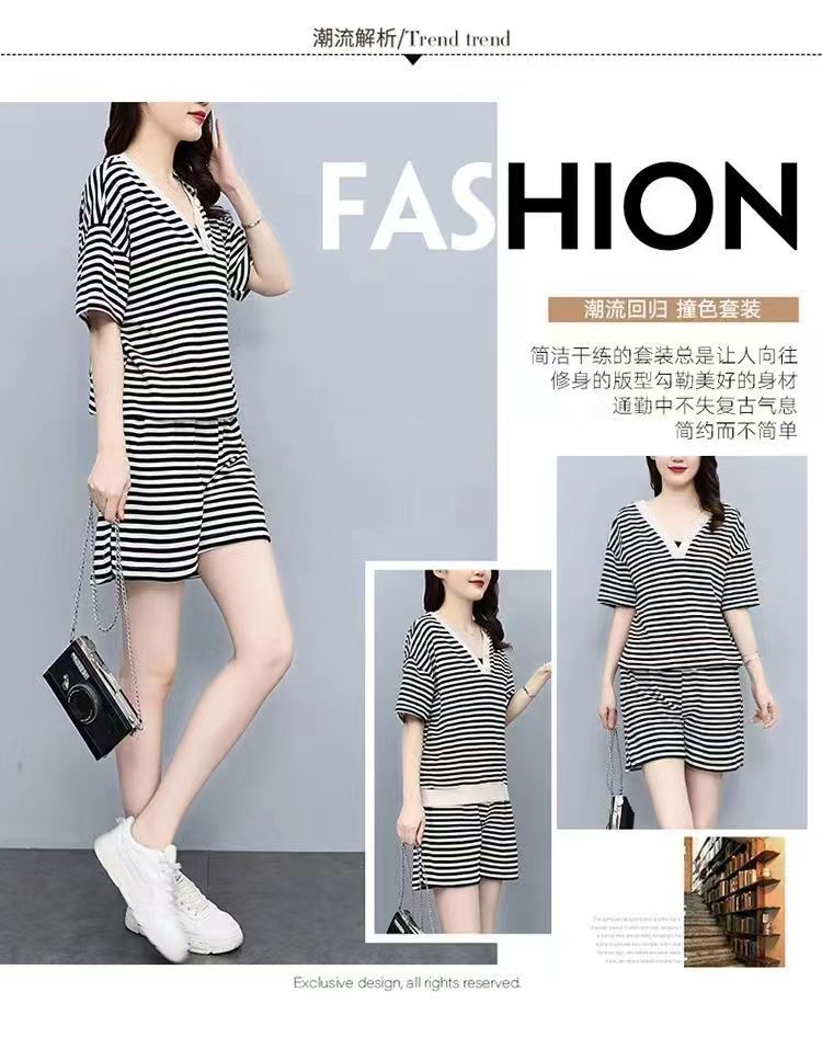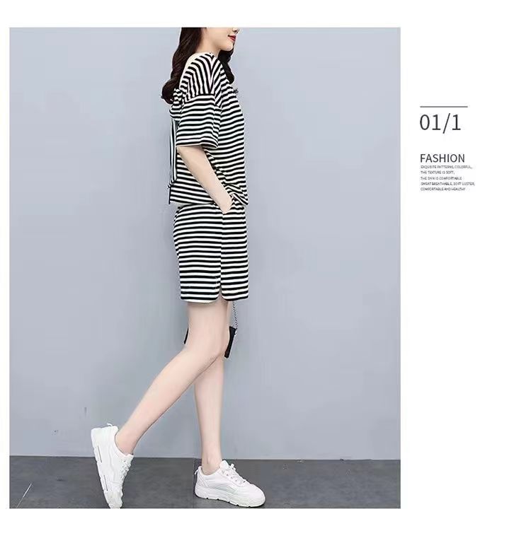 双面可穿 夏季新款韩版宽松条纹蝴蝶结短袖t恤裤子两件套大码女装