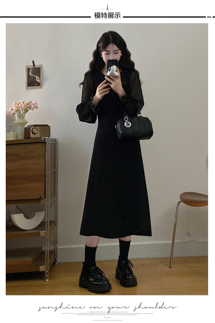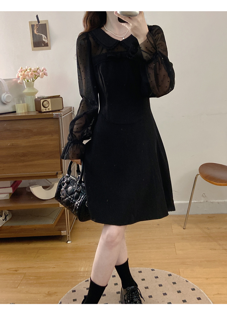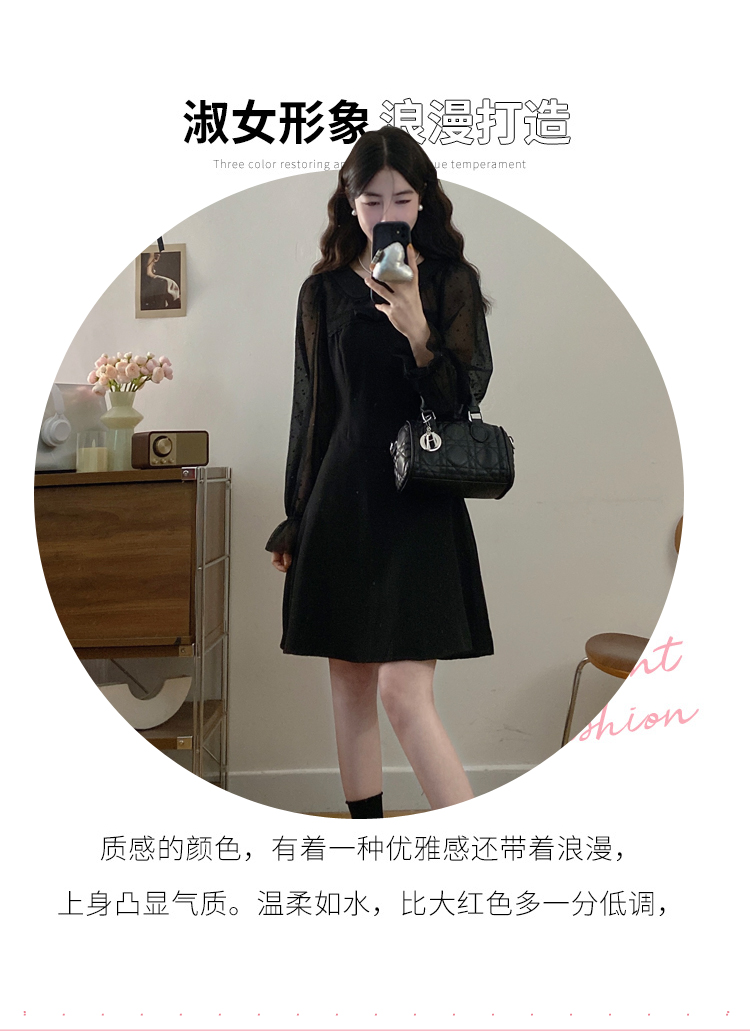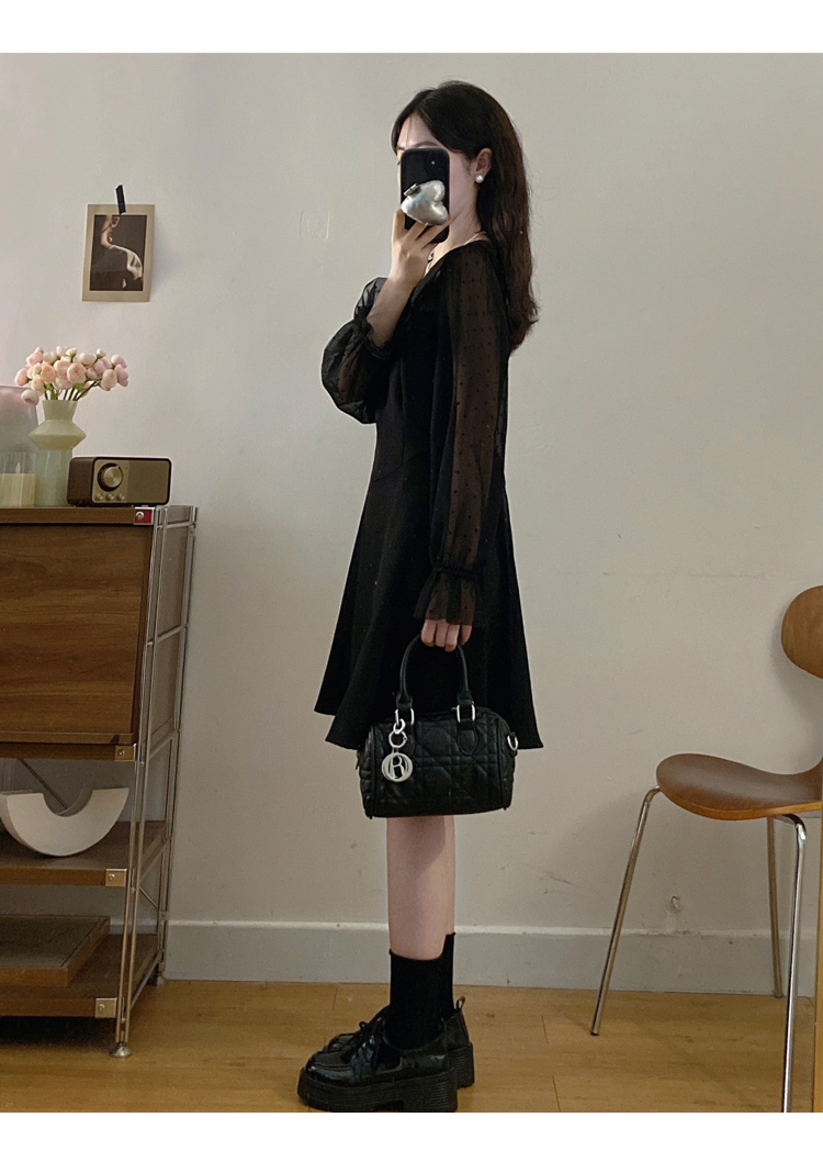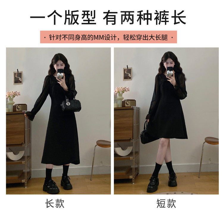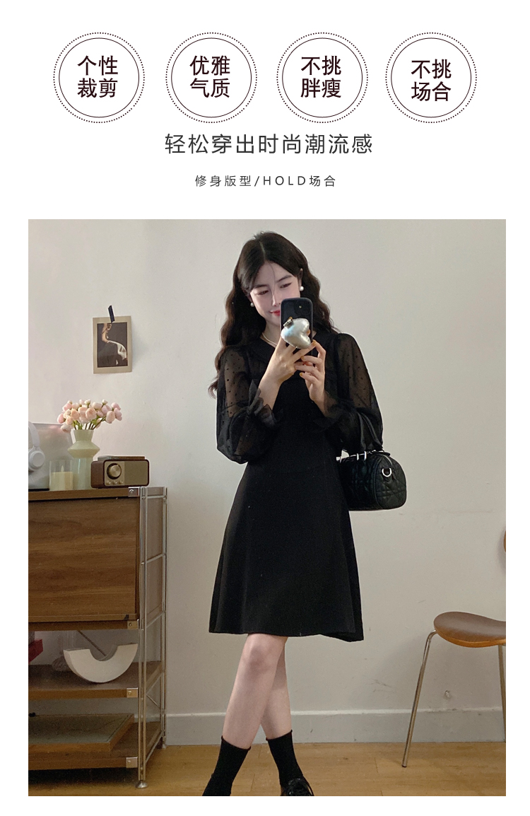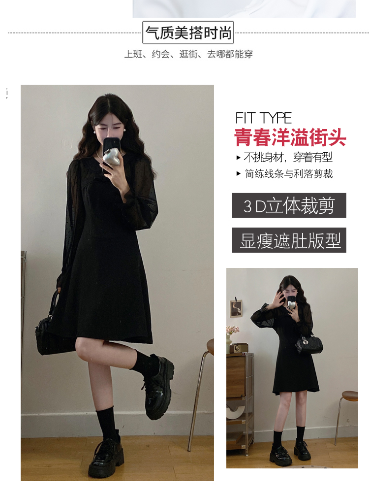 实拍大码法式千金感网纱拼接袖子小黑裙女春装新款赫本风连衣裙