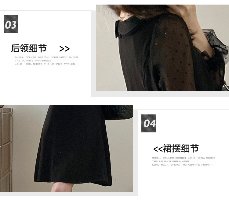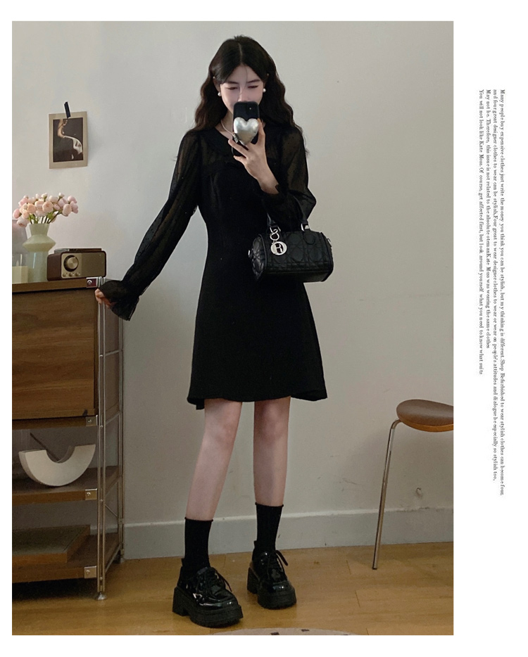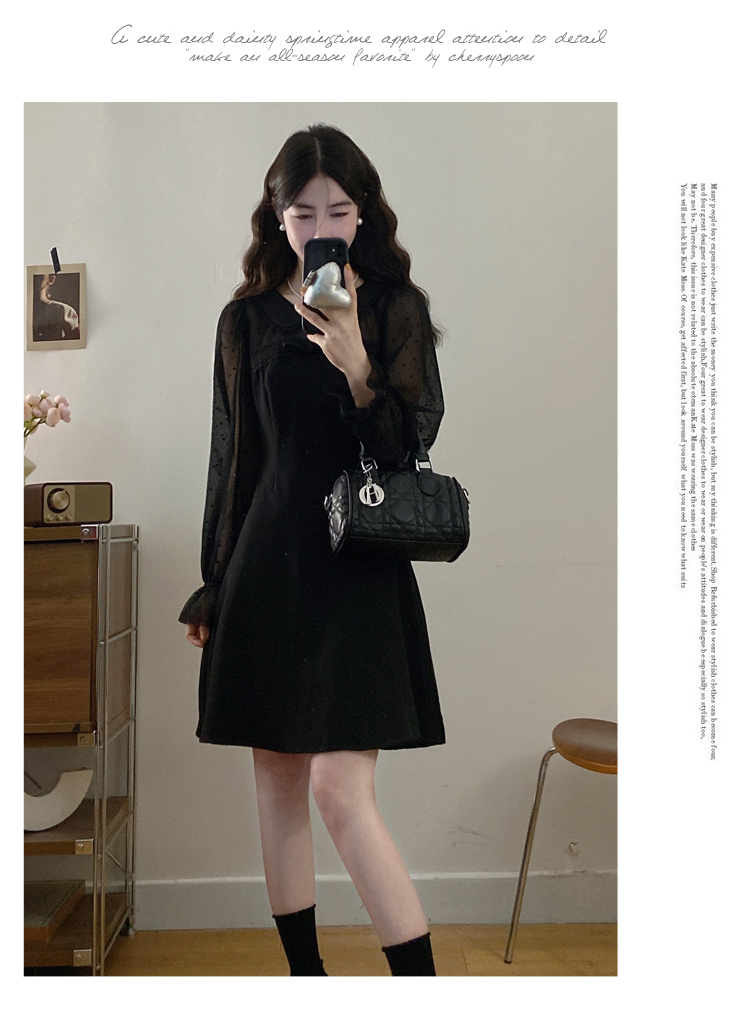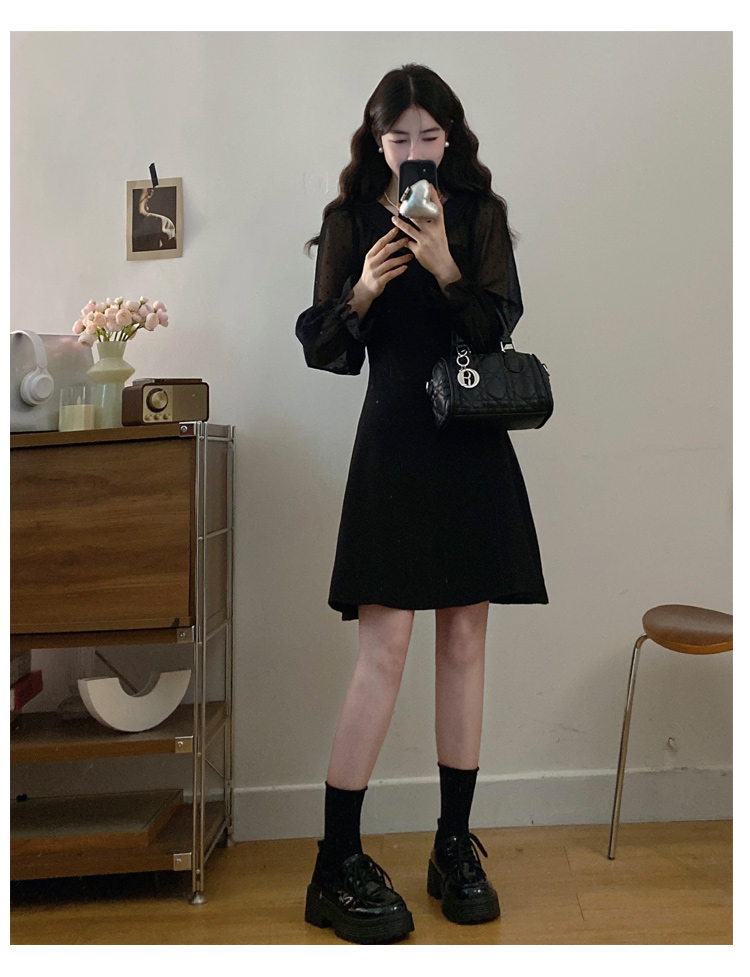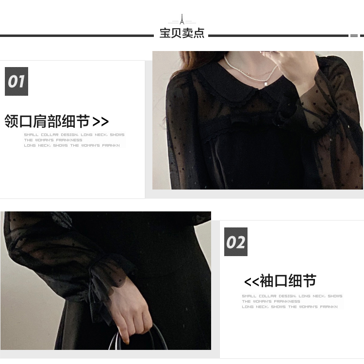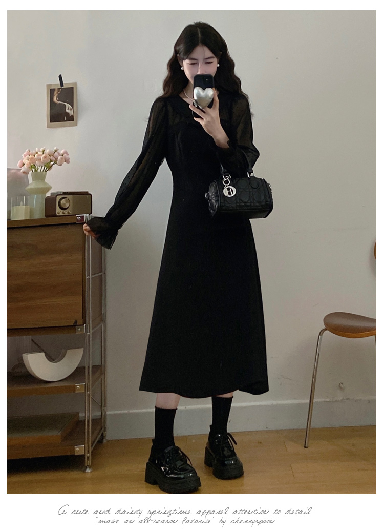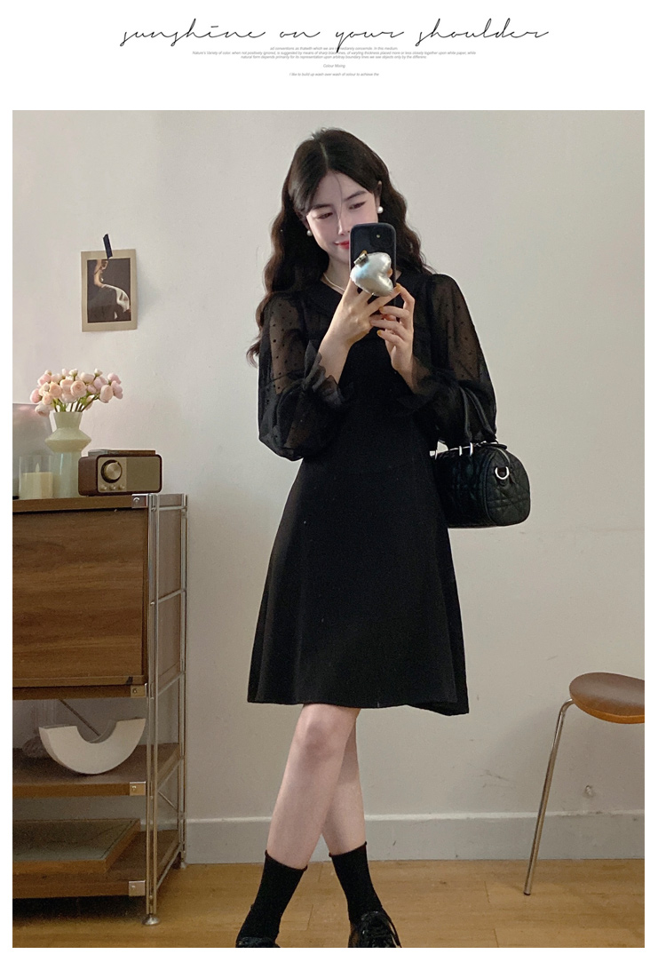实拍大码法式千金感网纱拼接袖子小黑裙女春装新款赫本风连衣裙