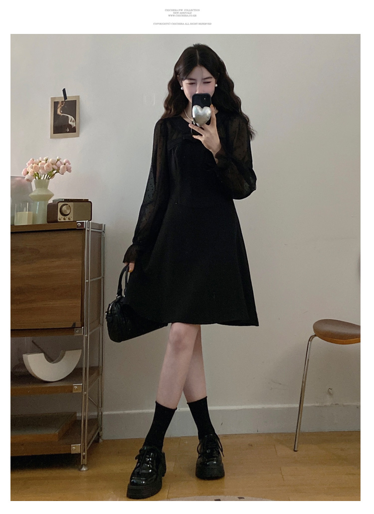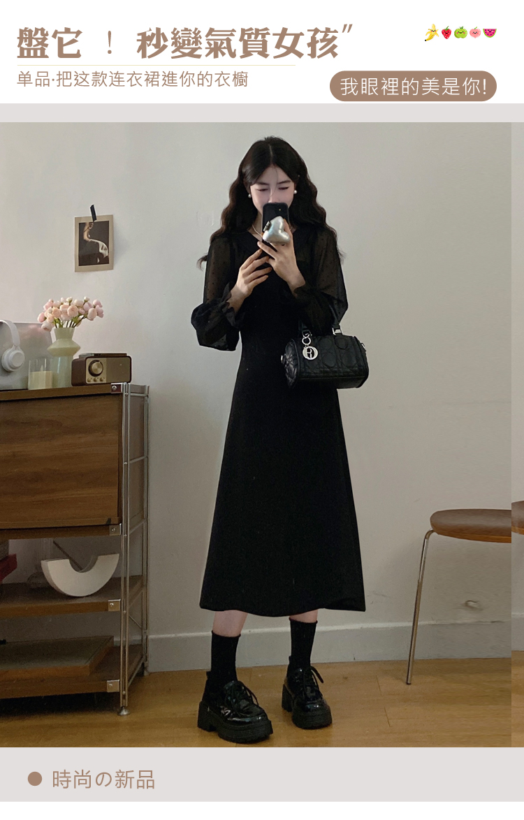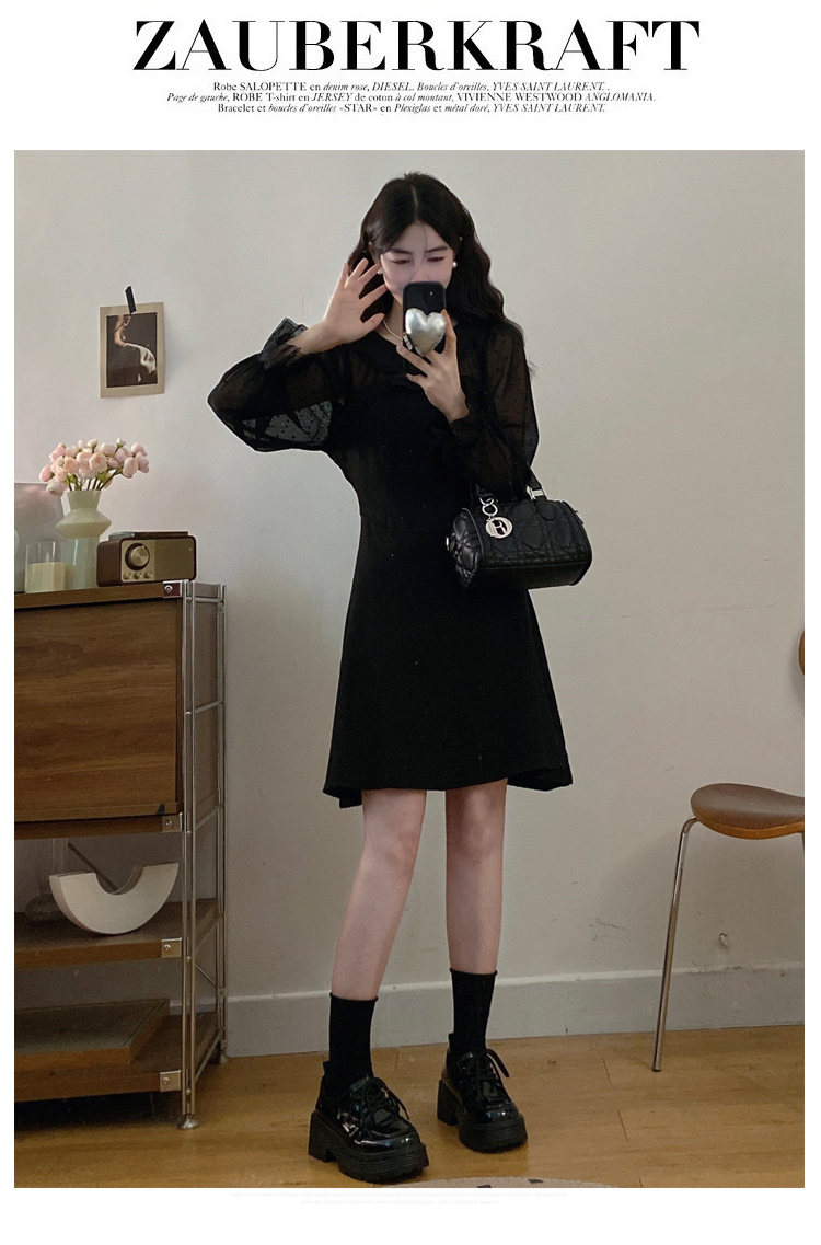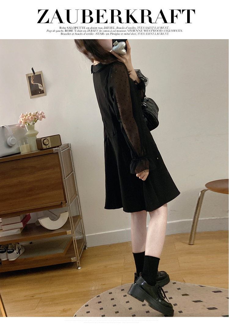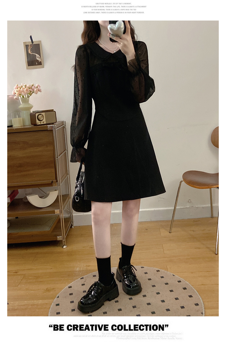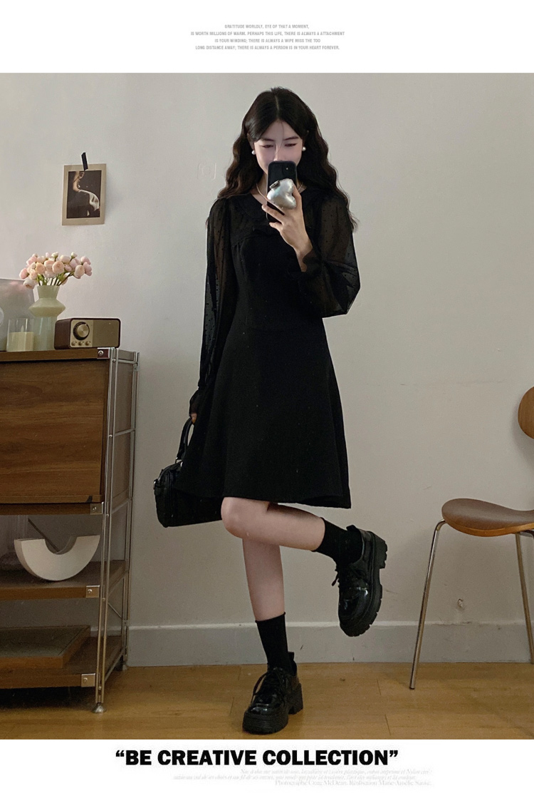 实拍大码法式千金感网纱拼接袖子小黑裙女春装新款赫本风连衣裙