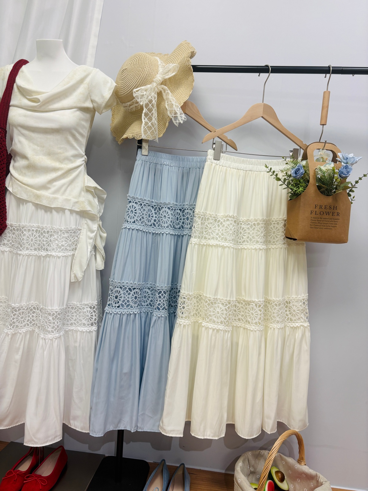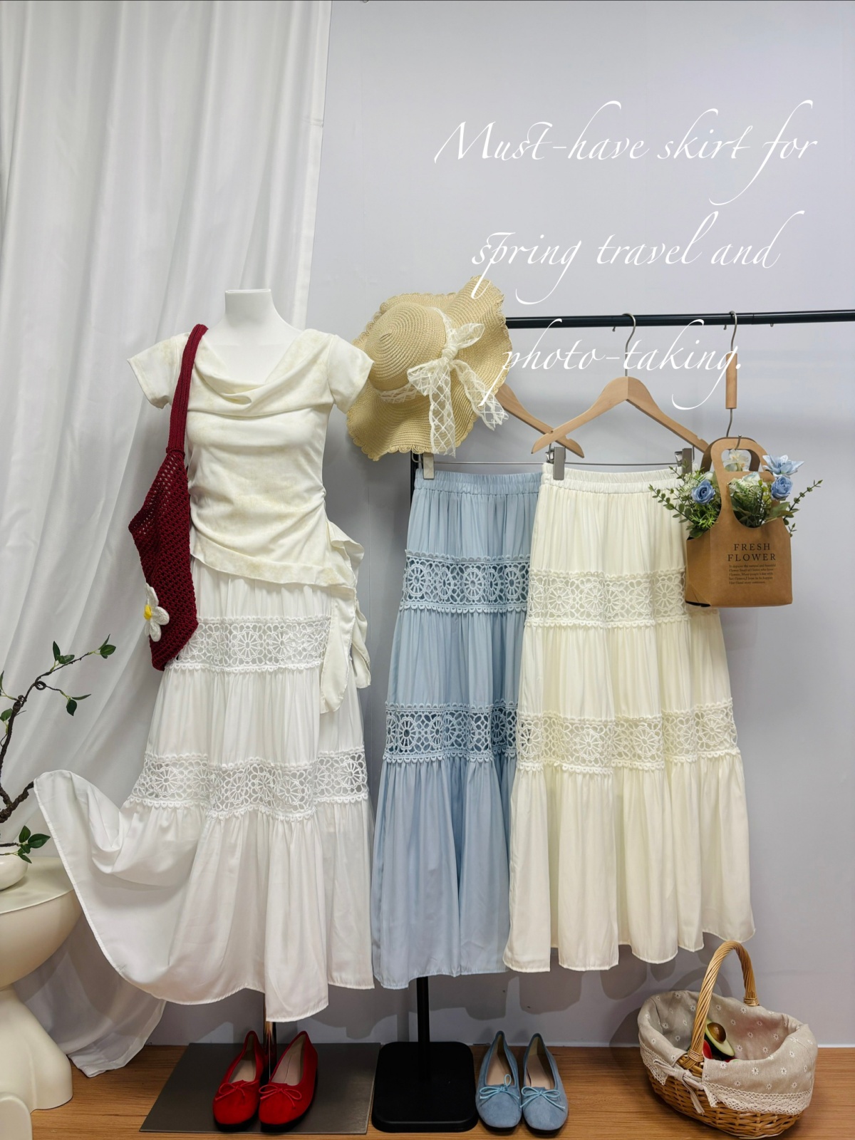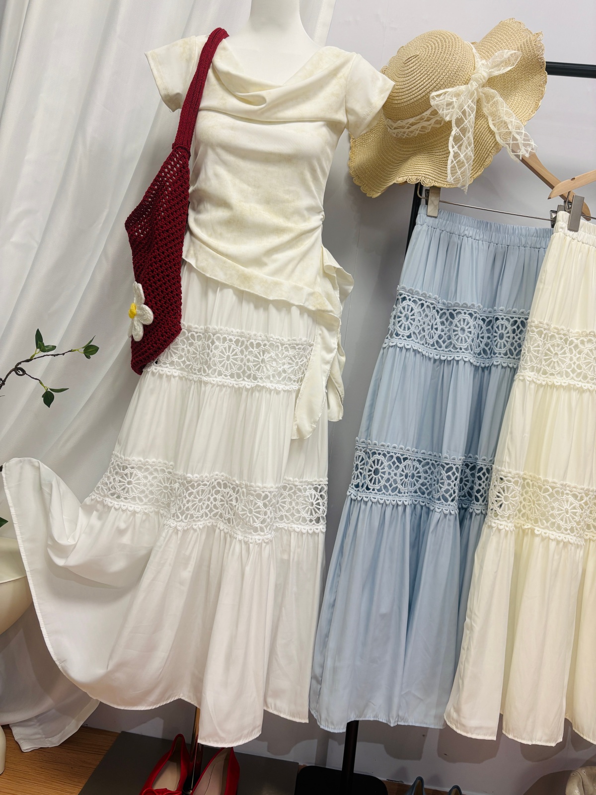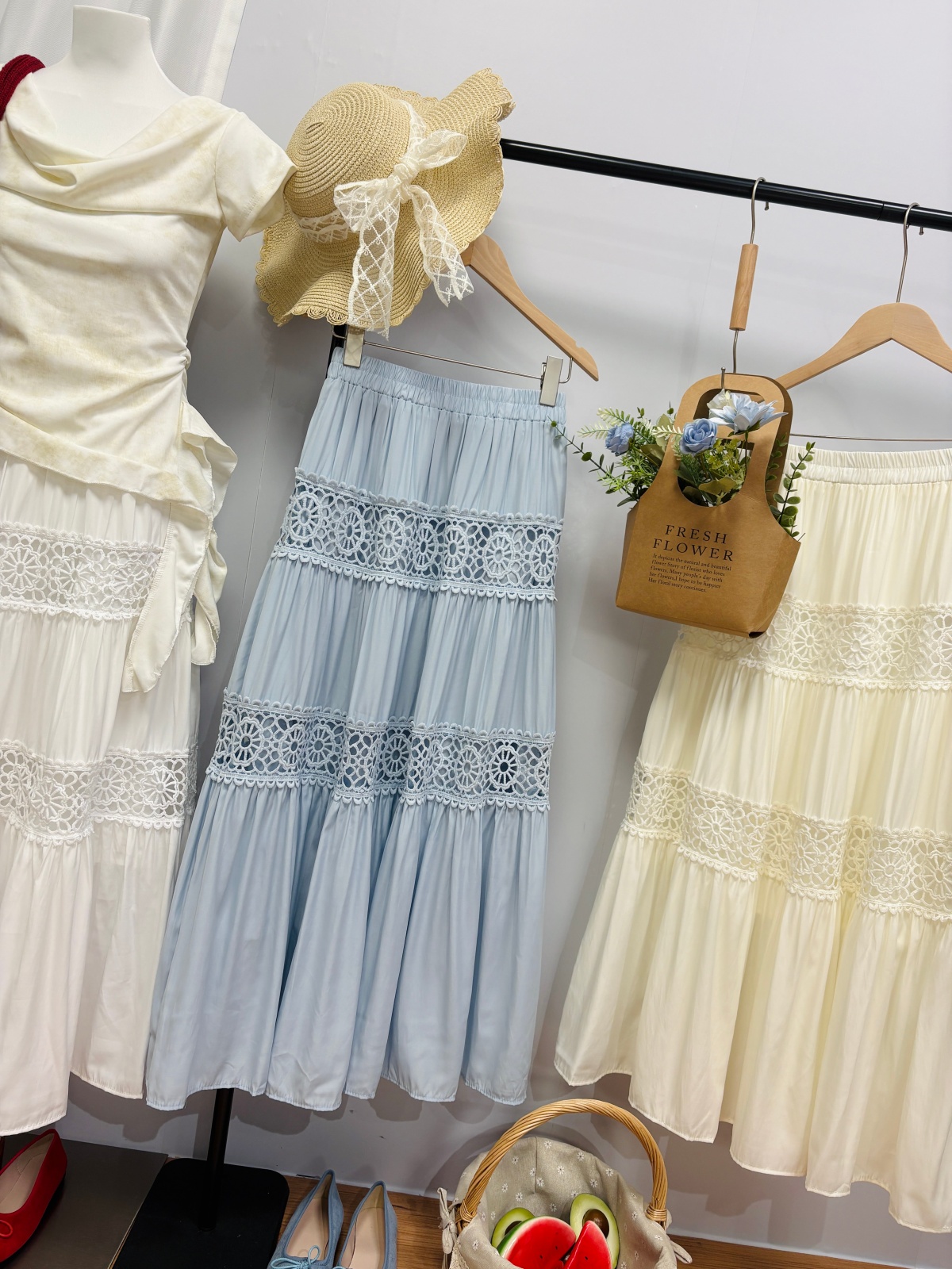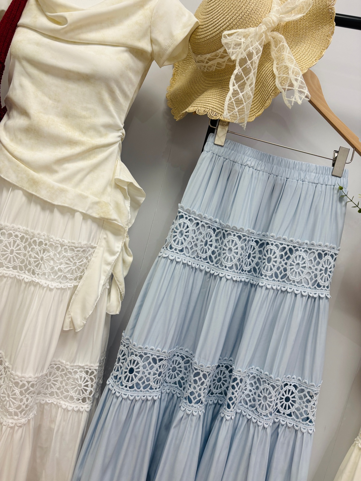 实拍 夏季2026新款镂空花边拼接半身裙韩系ins设计感长款蛋糕裙