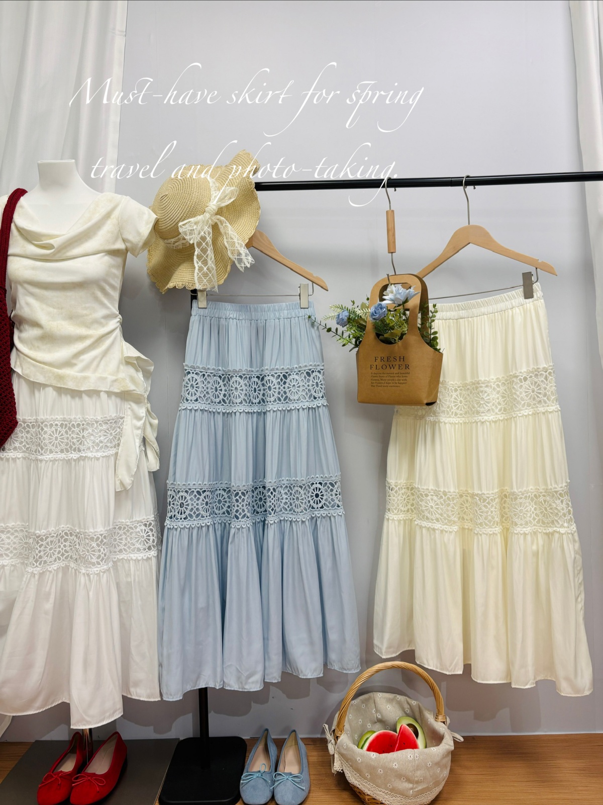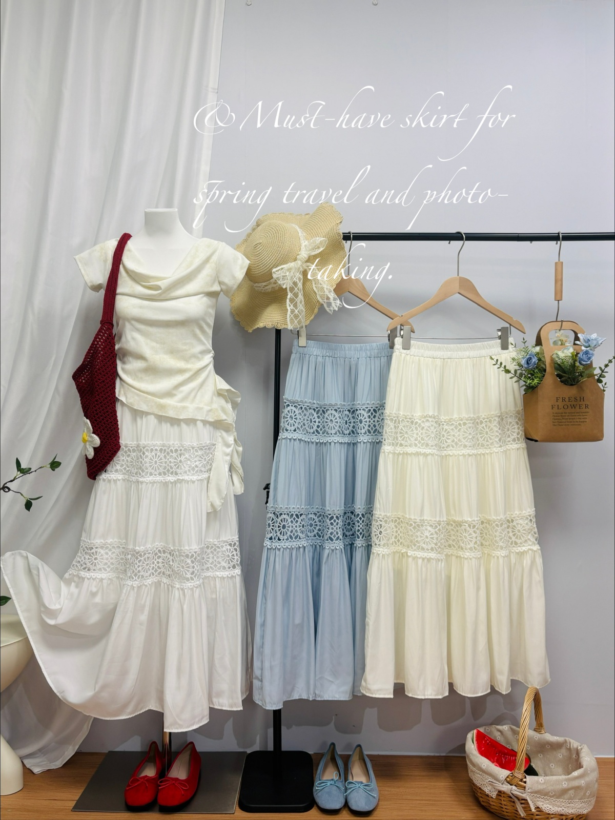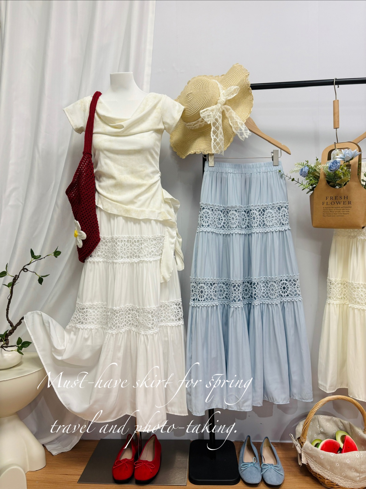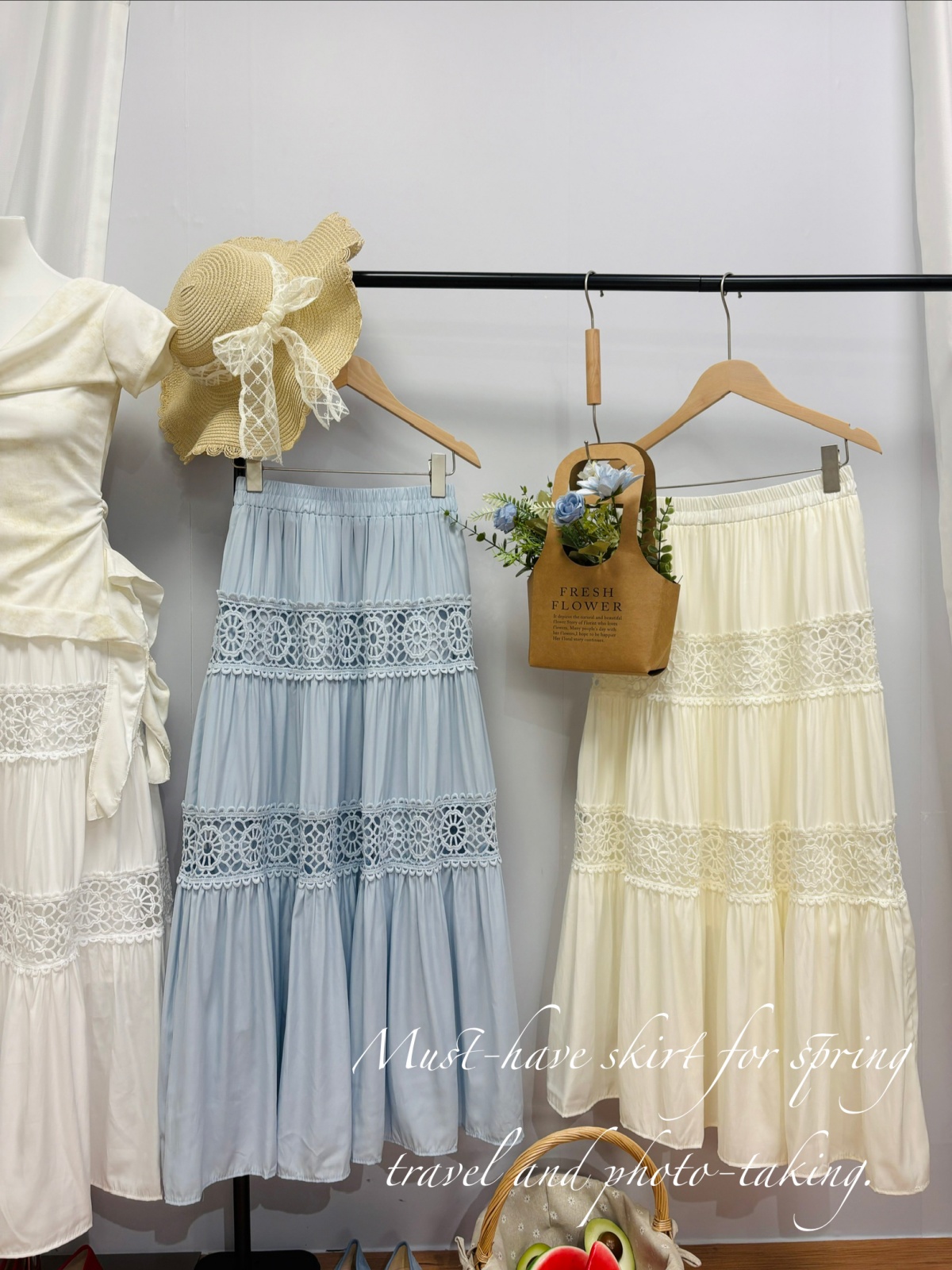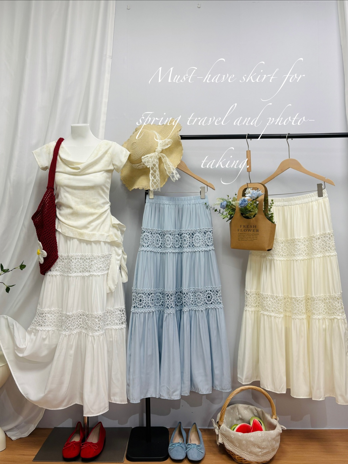 实拍 夏季2026新款镂空花边拼接半身裙韩系ins设计感长款蛋糕裙
