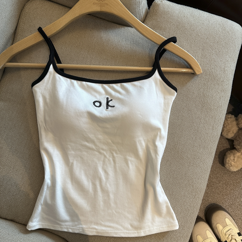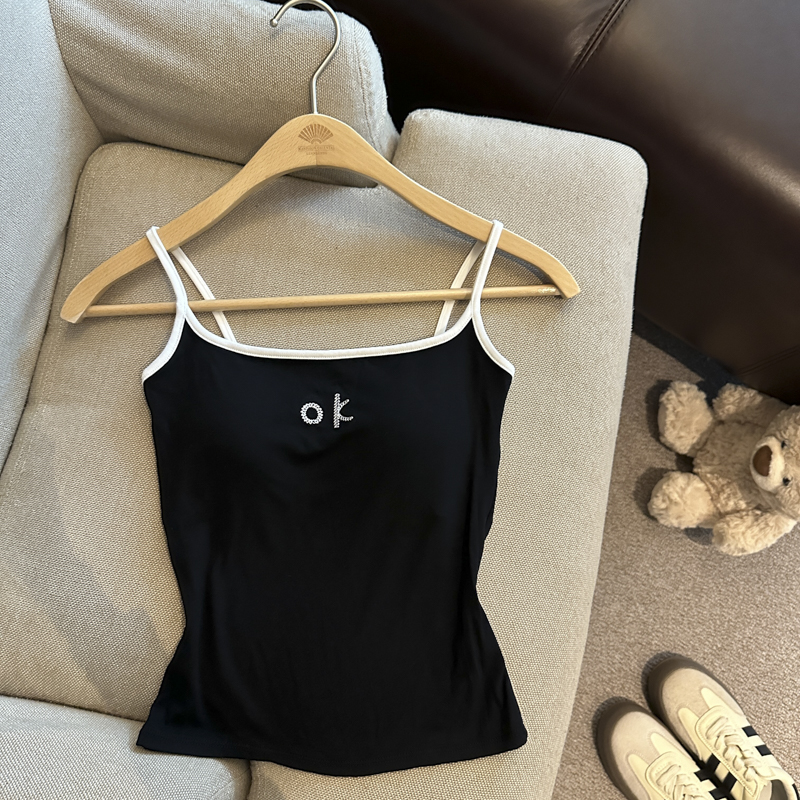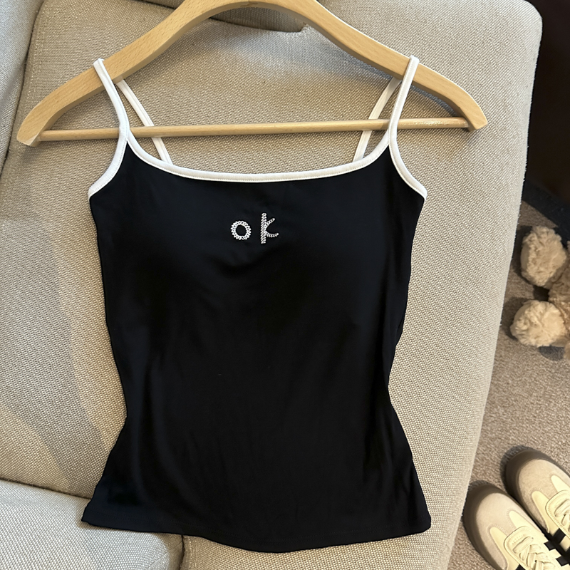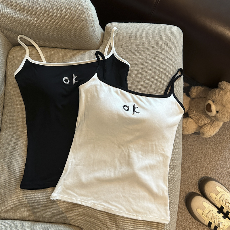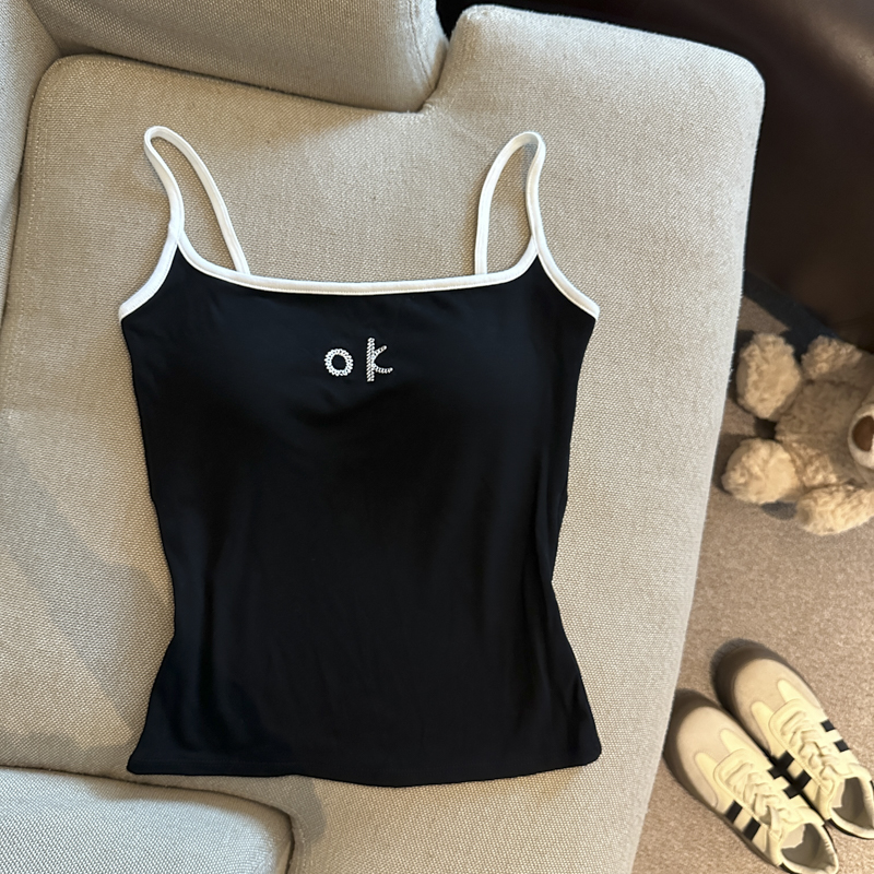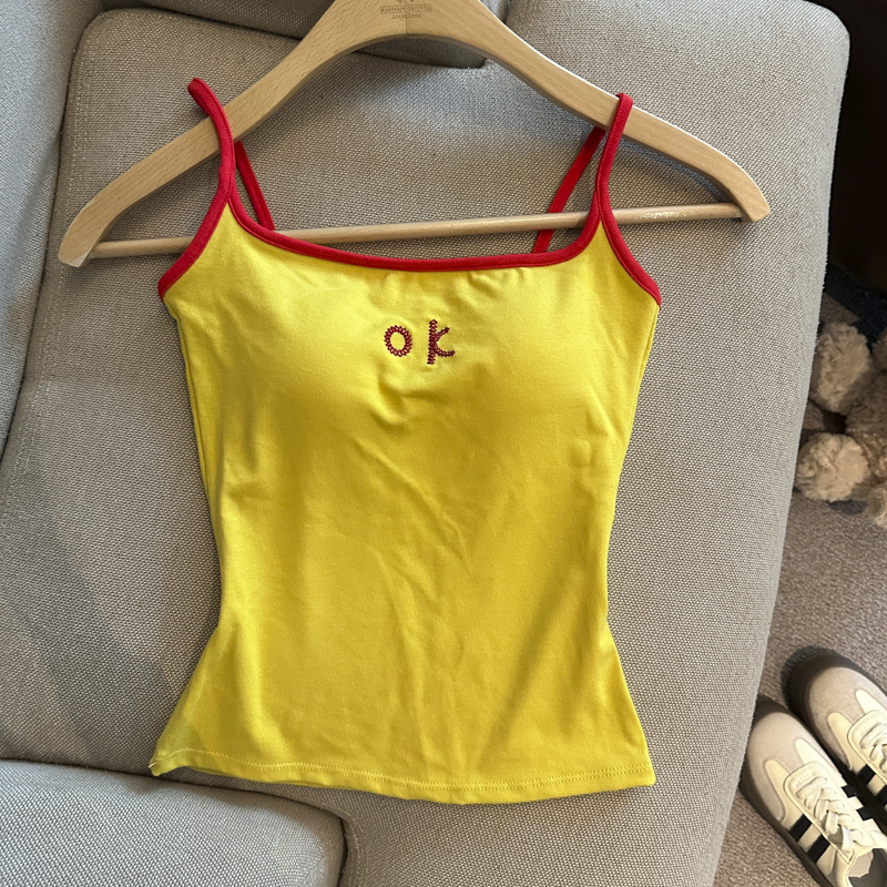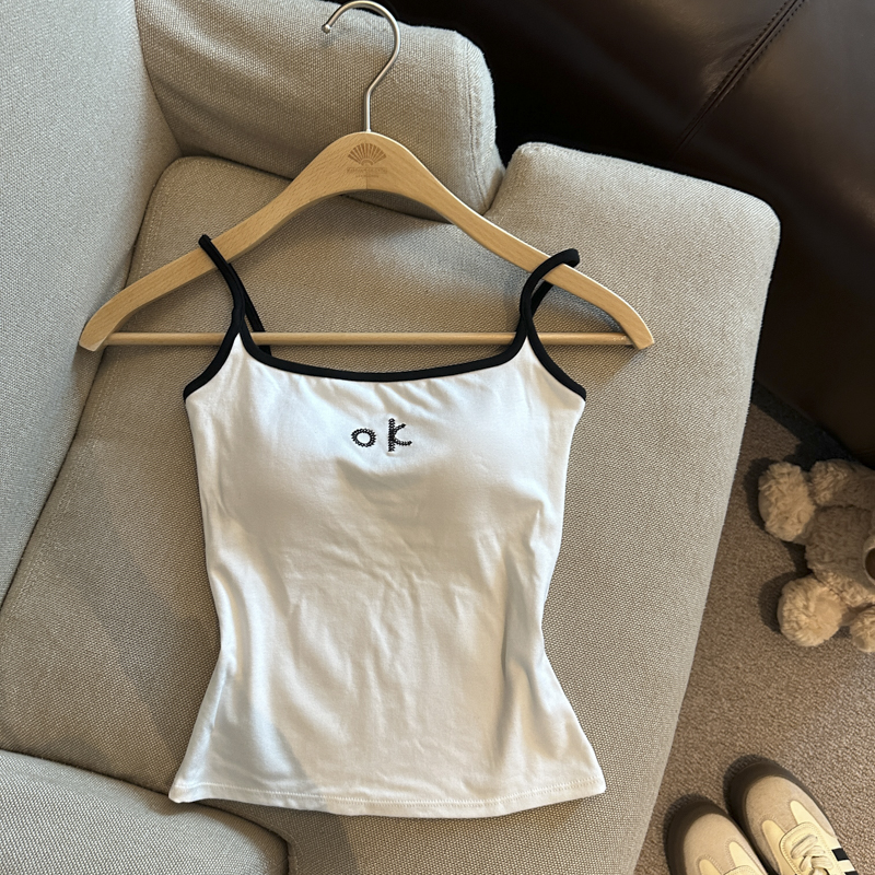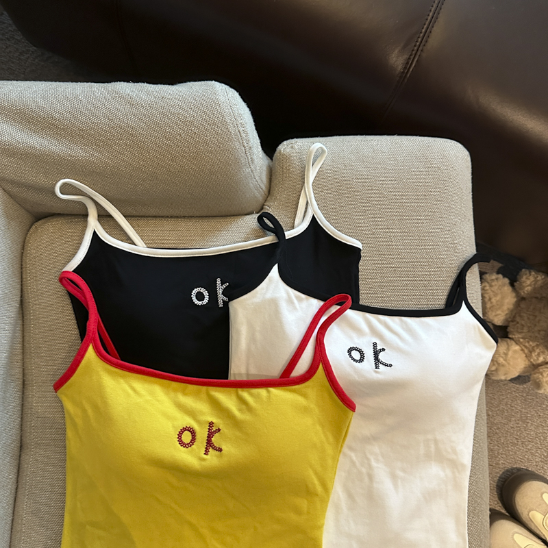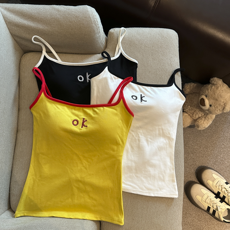 实拍 辣妹撞色拼接吊带背心女带胸垫字母绣花修身显瘦短款上衣