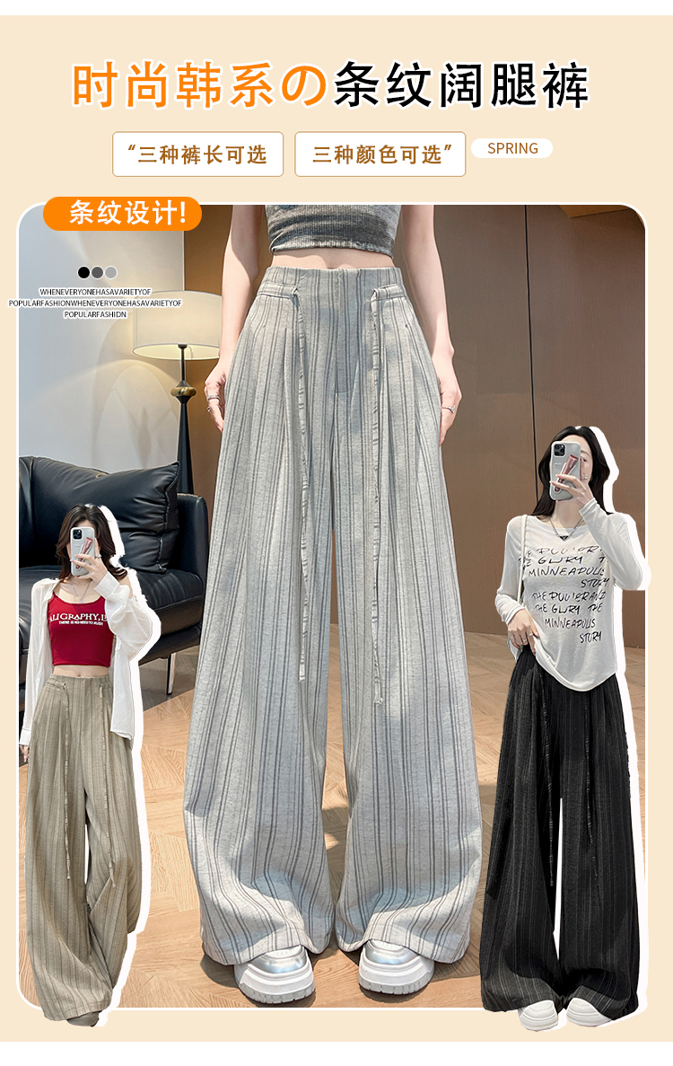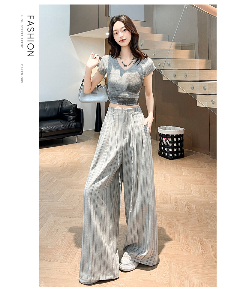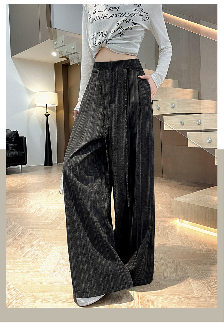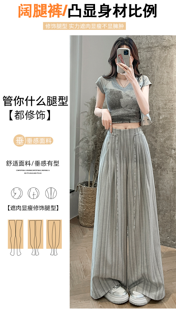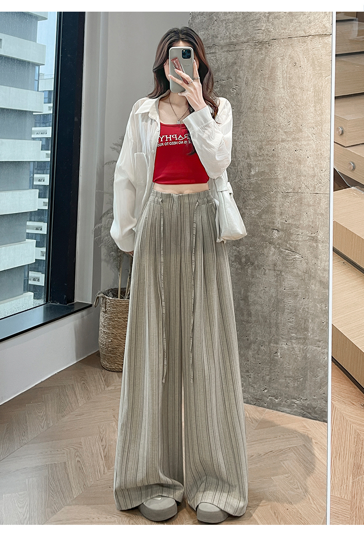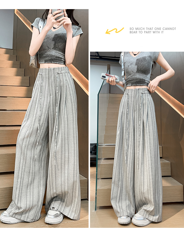 韩系复古条纹阔腿裤女2026夏季新款设计感绑带百搭老钱风西装裤子