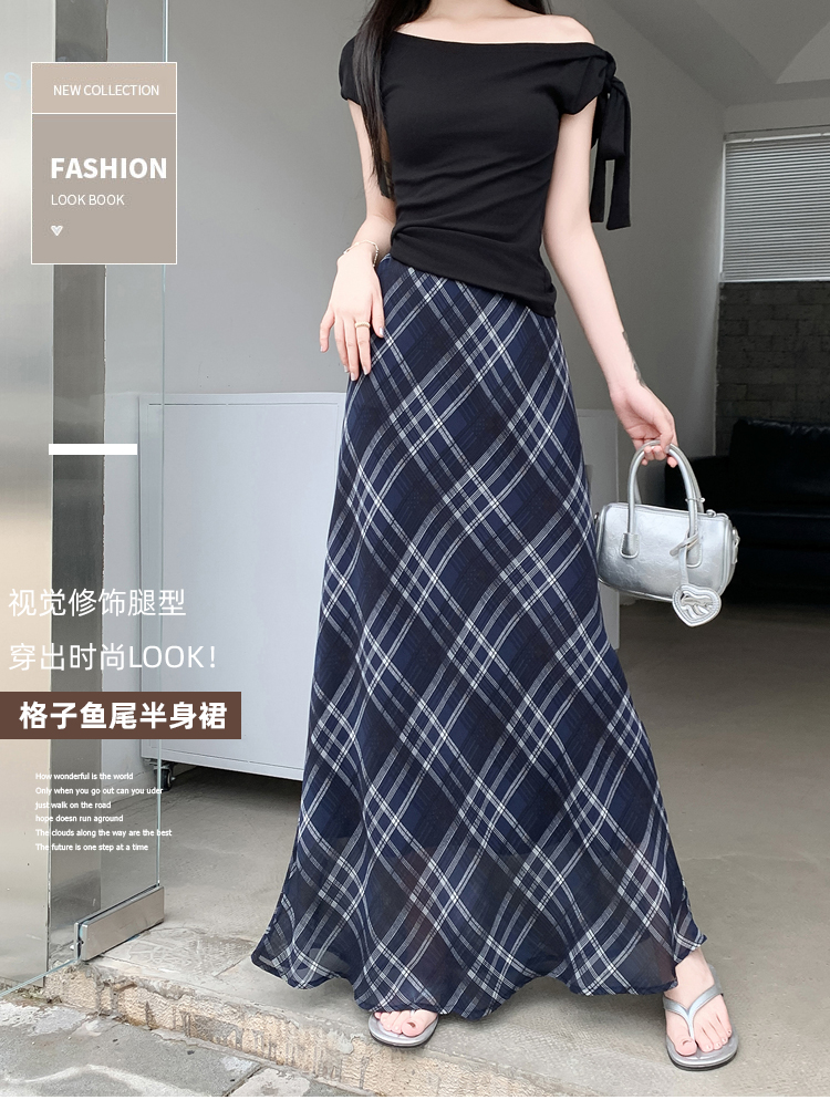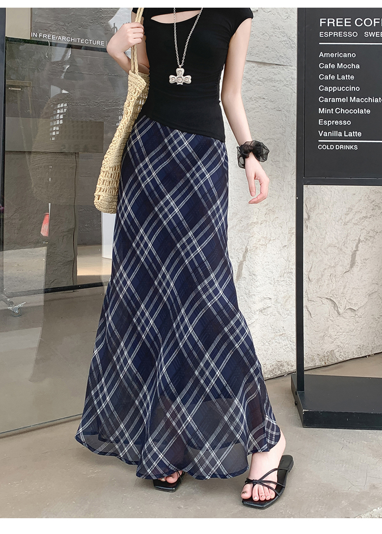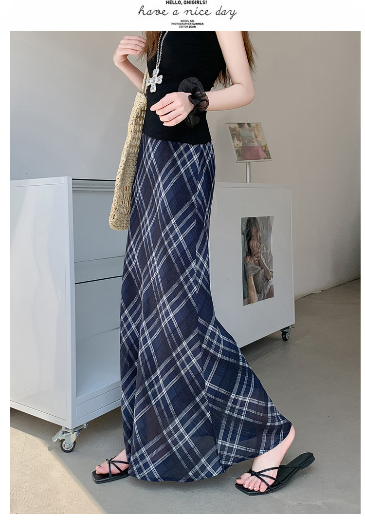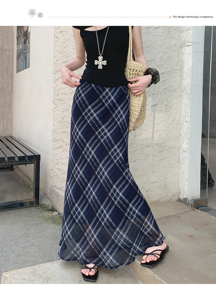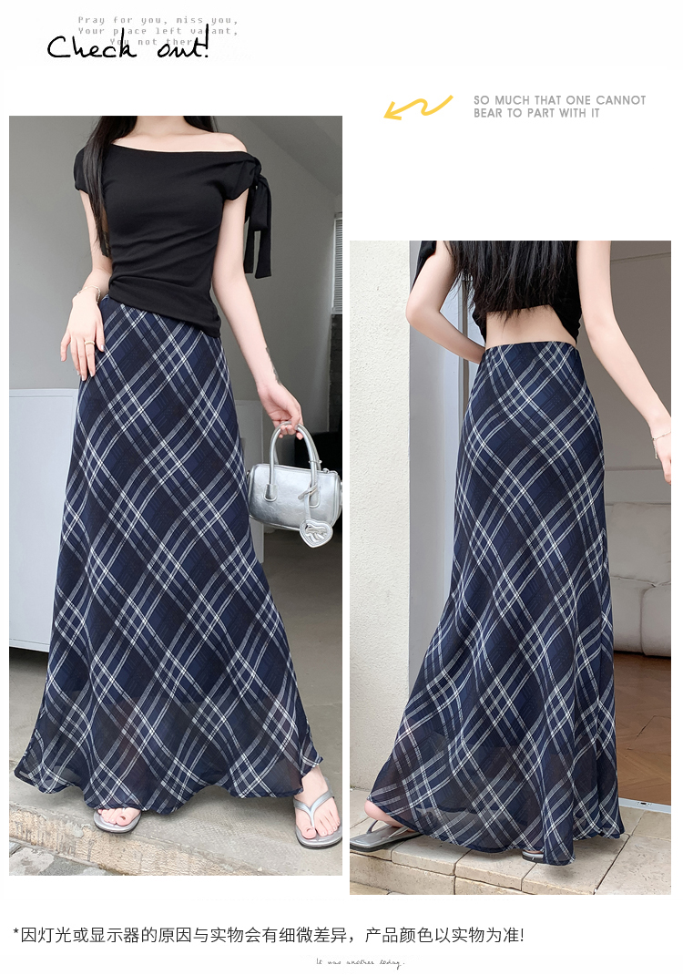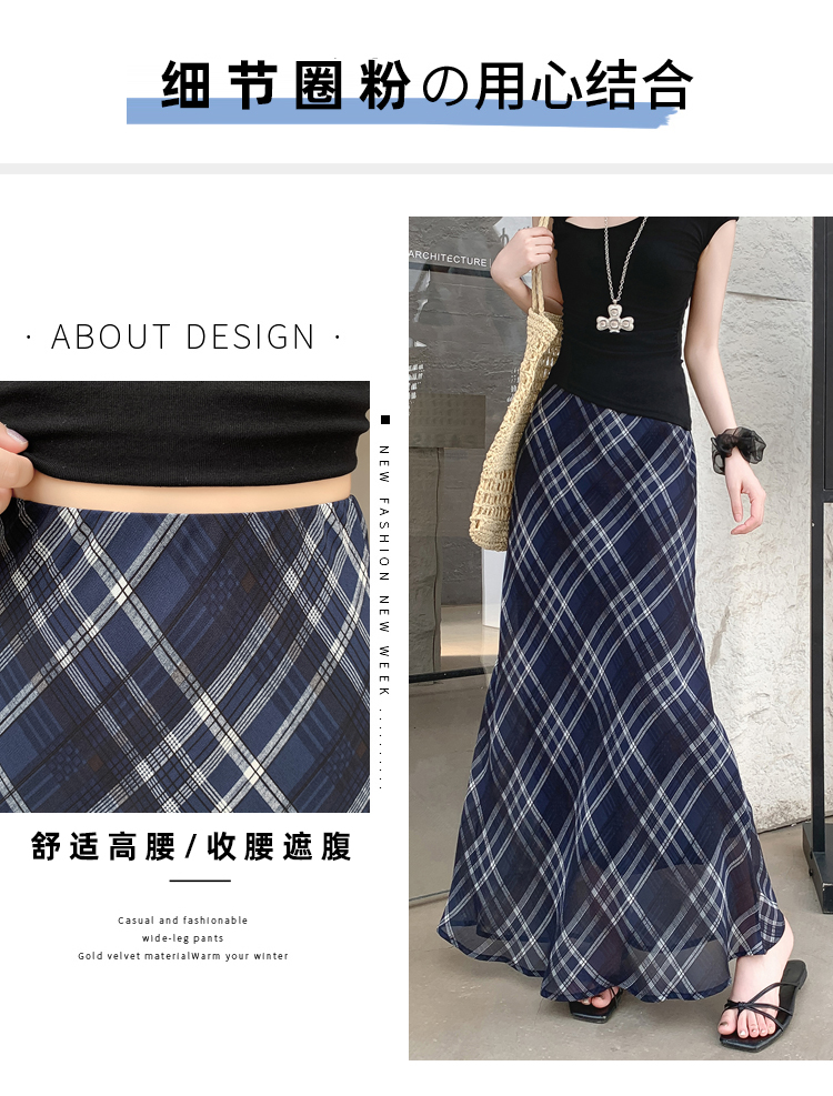实拍复古气息春夏飘逸薄纱格子松紧高腰显瘦格纹半身裙鱼尾裙