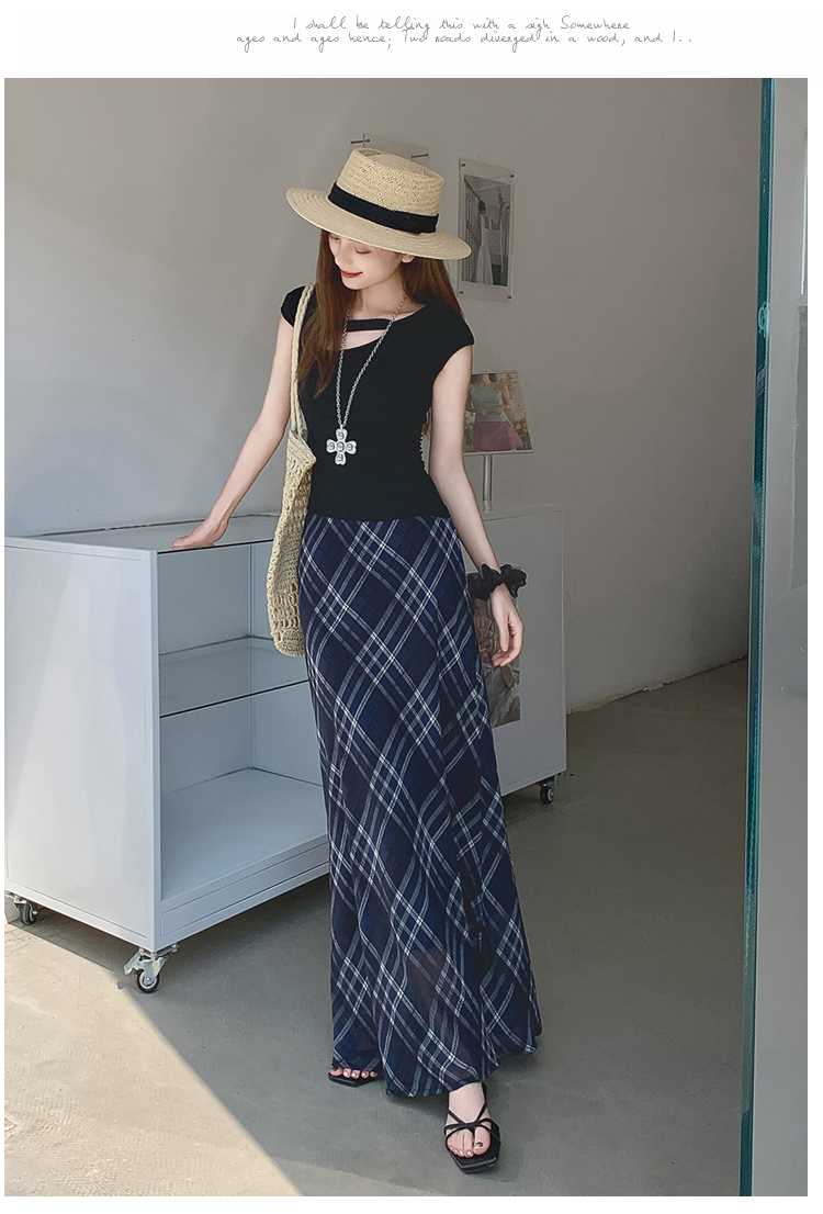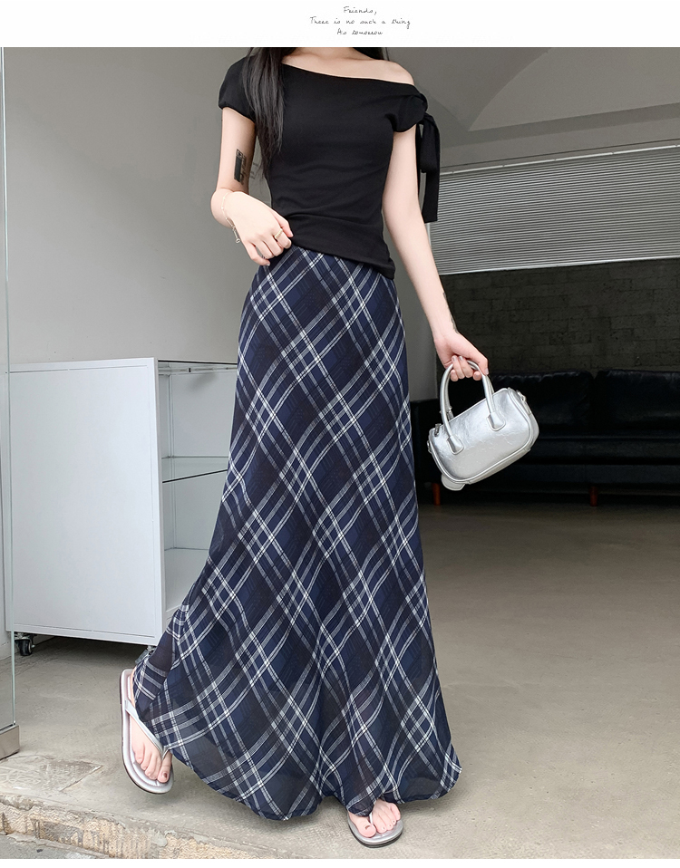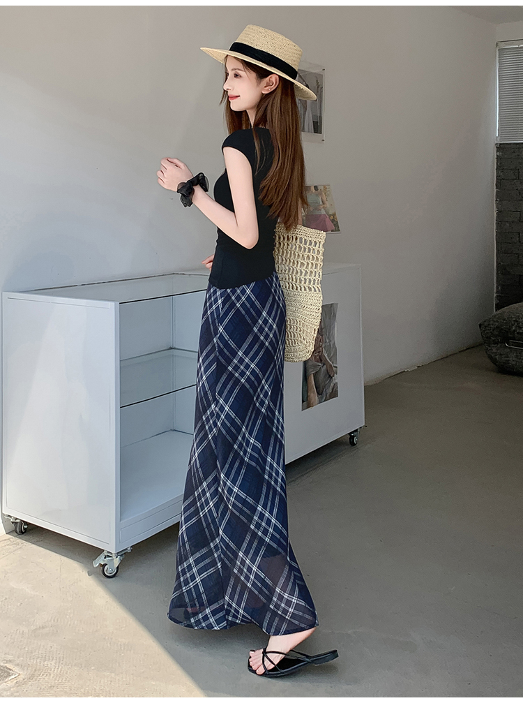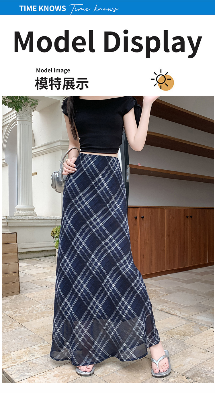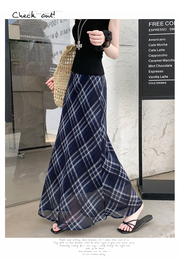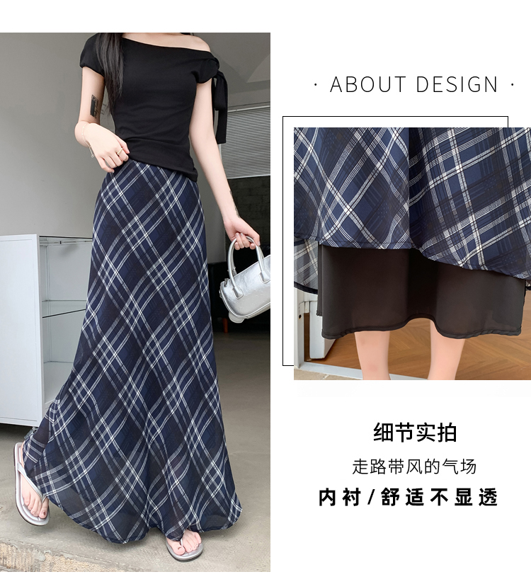 实拍复古气息春夏飘逸薄纱格子松紧高腰显瘦格纹半身裙鱼尾裙
