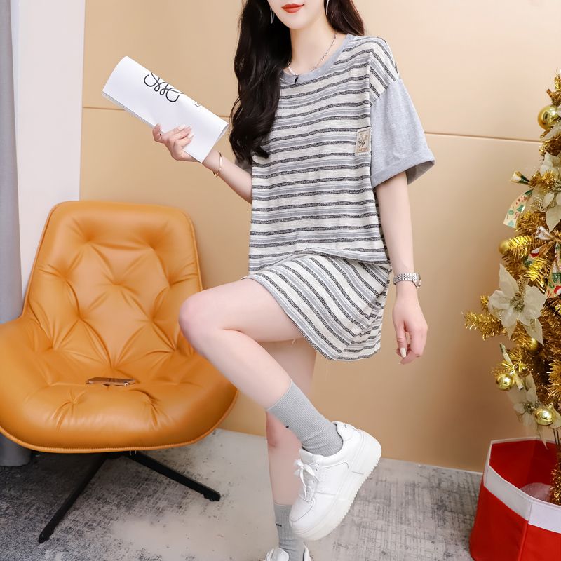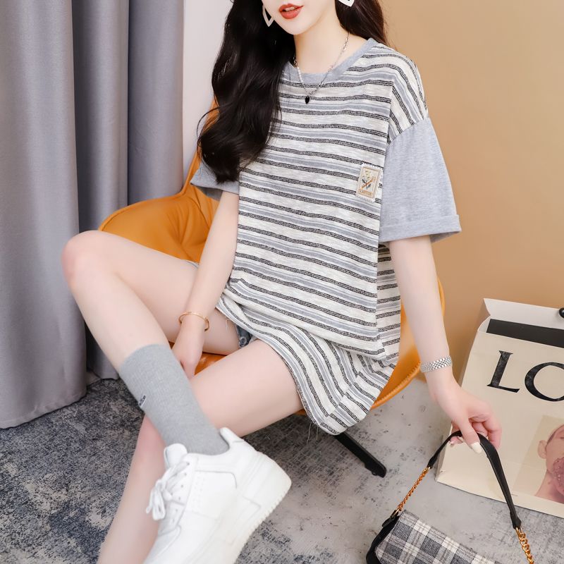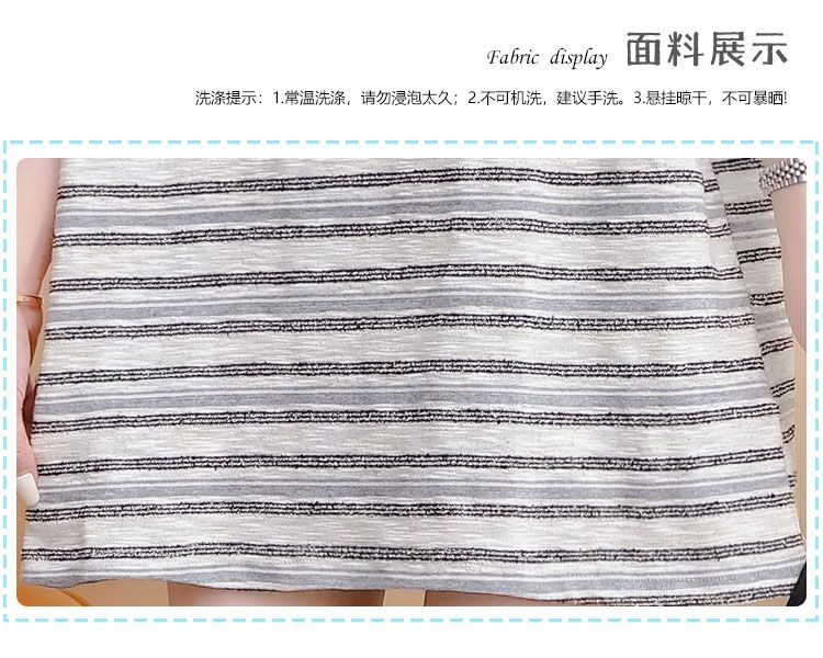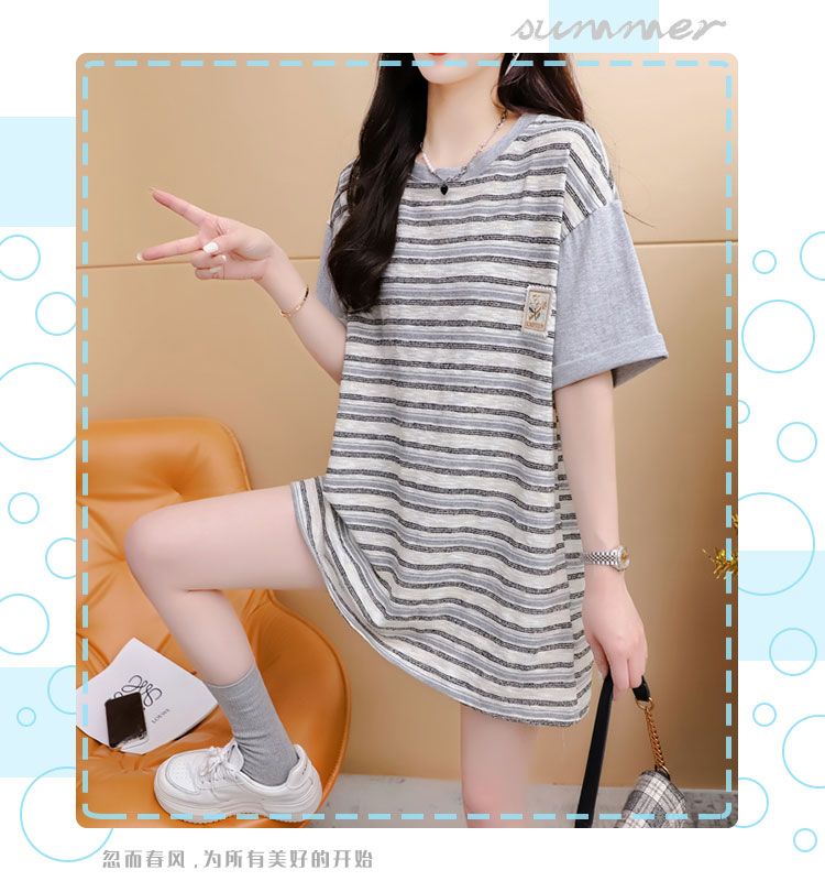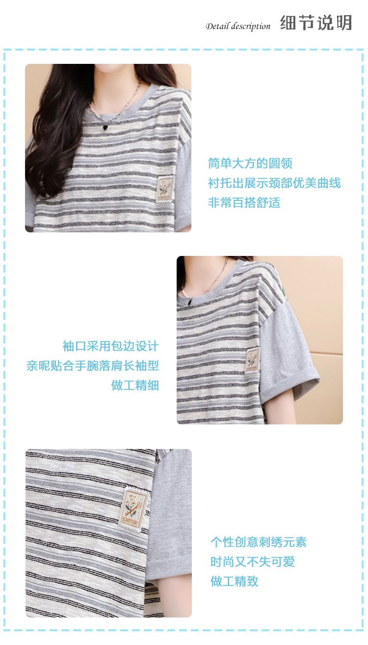实拍2026夏季原版质量280克大码条纹撞色拼接短袖T恤女