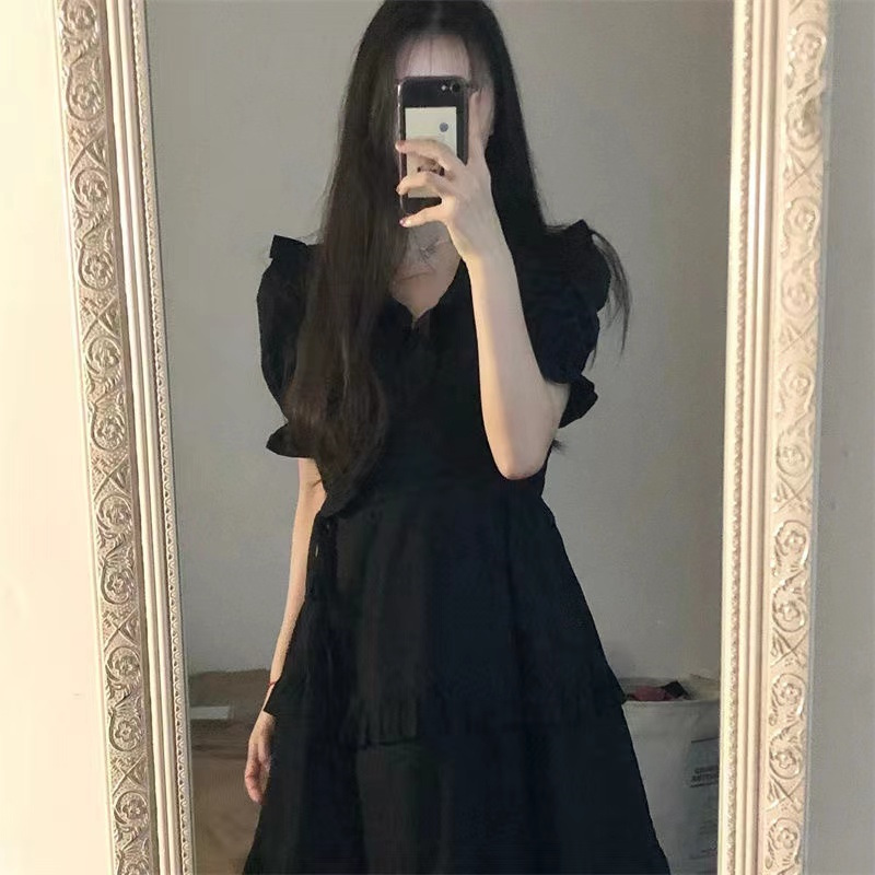 设计荷叶边法式黑色连衣裙女夏大码高级设计感收腰气质黑裙