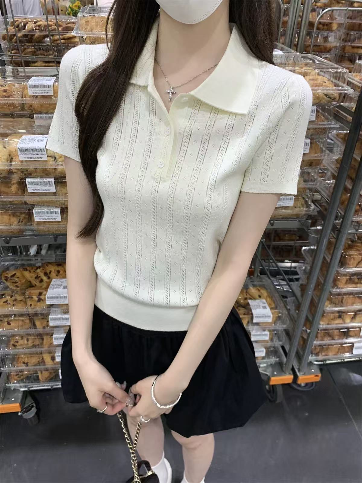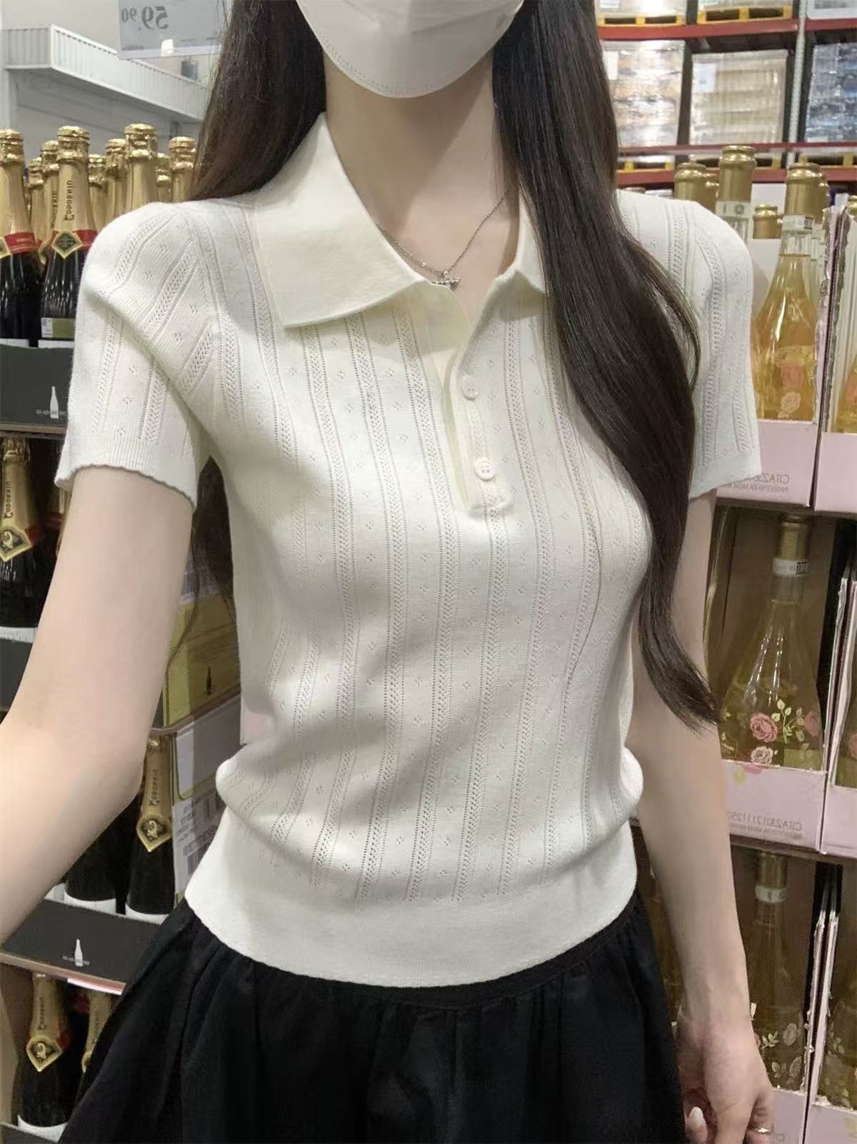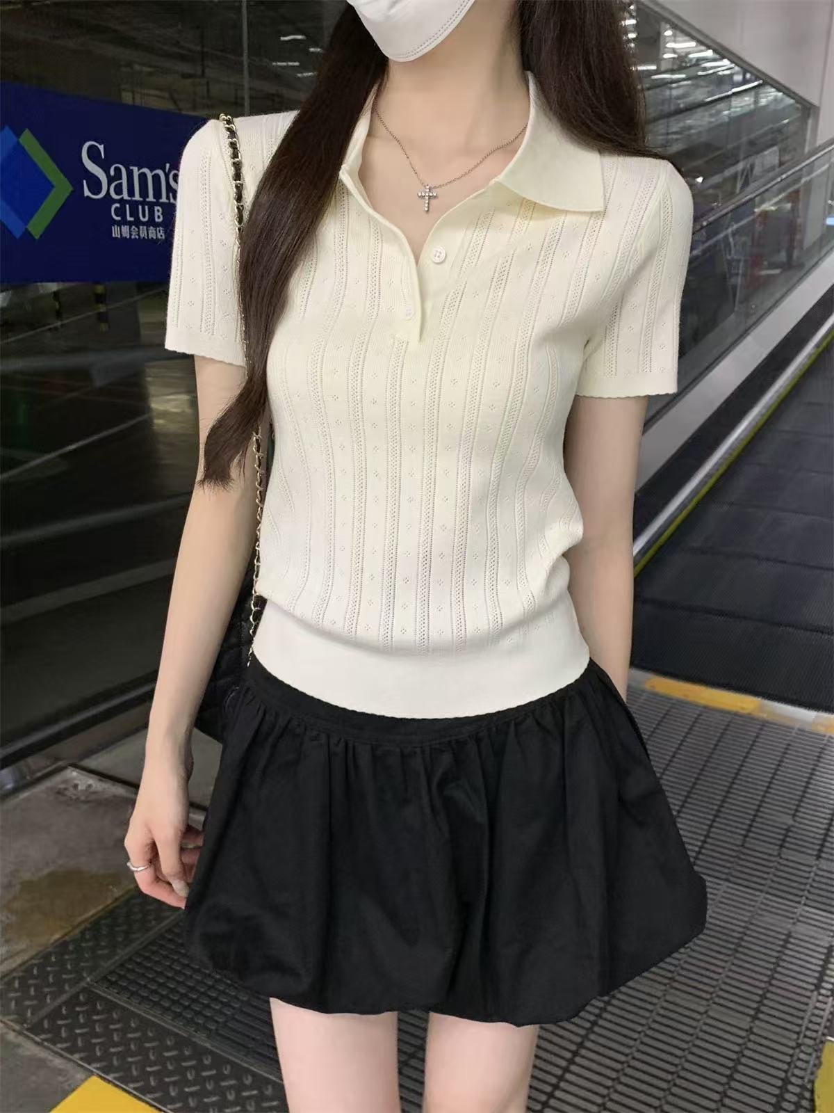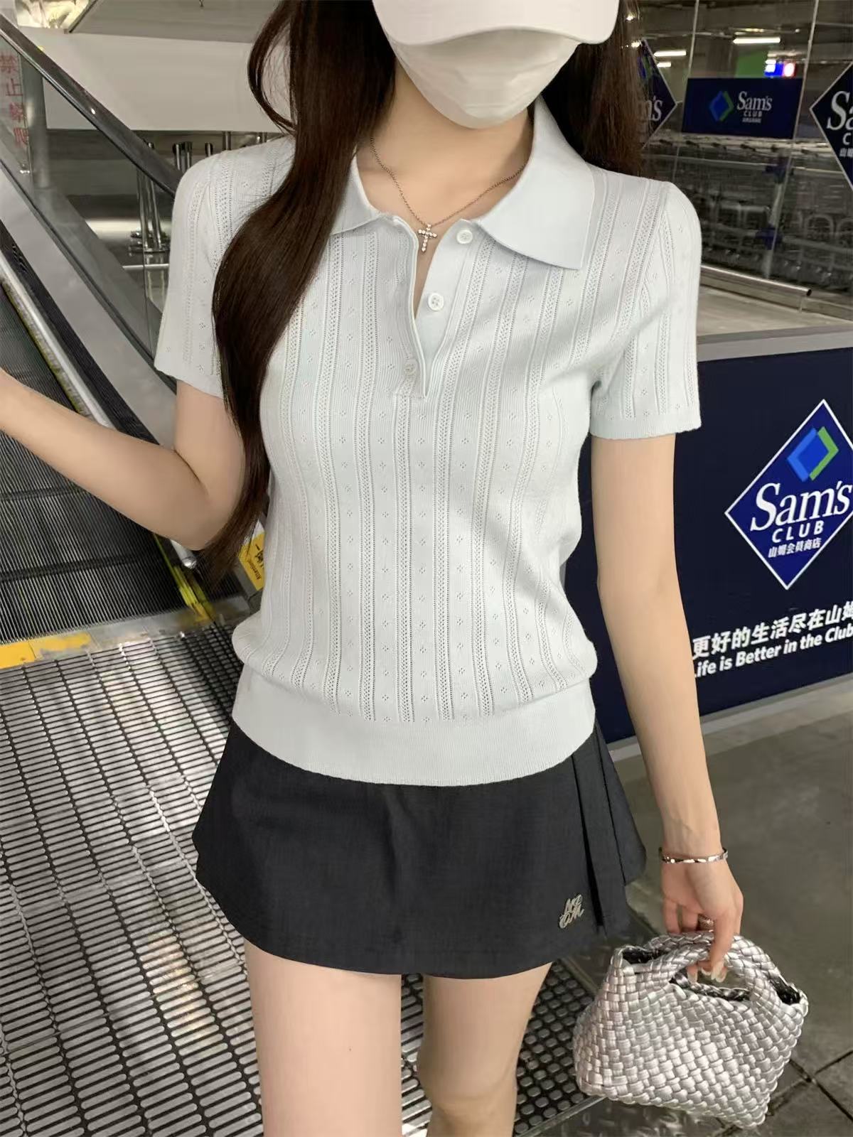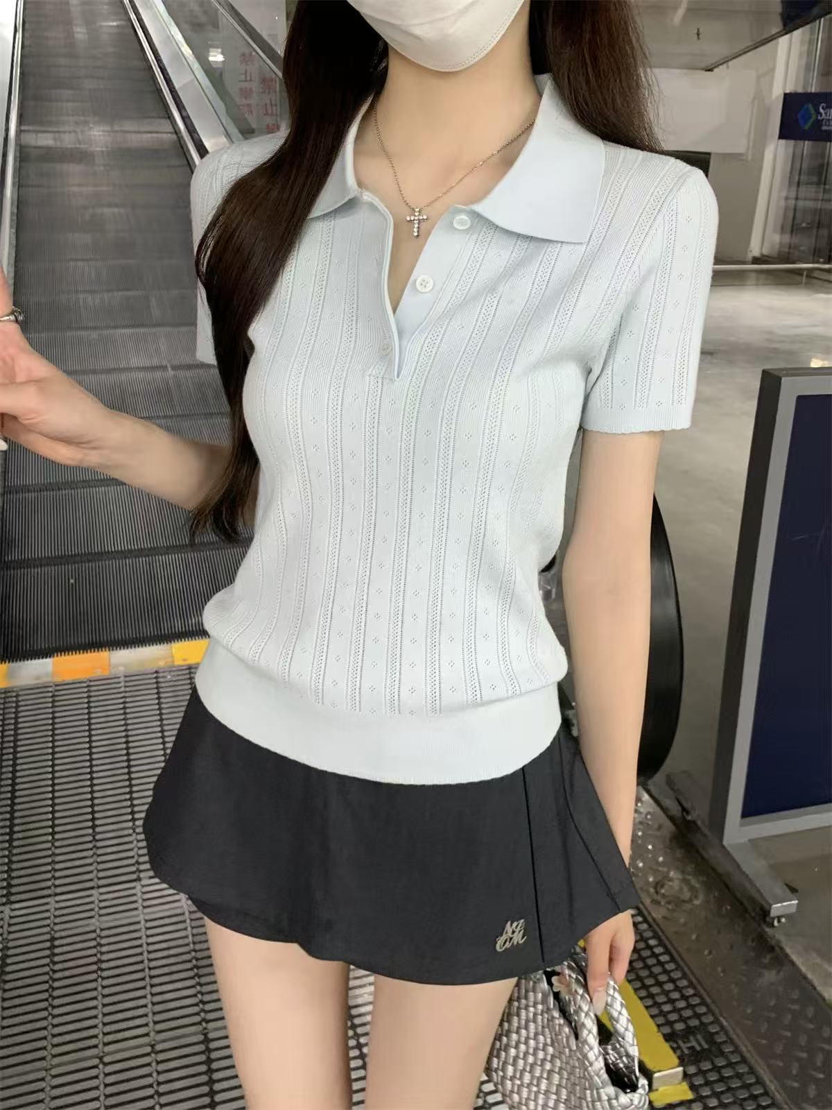 夏天巨好看的凉感polo领冰丝针织短袖t恤女韩系chic别致小衫上衣