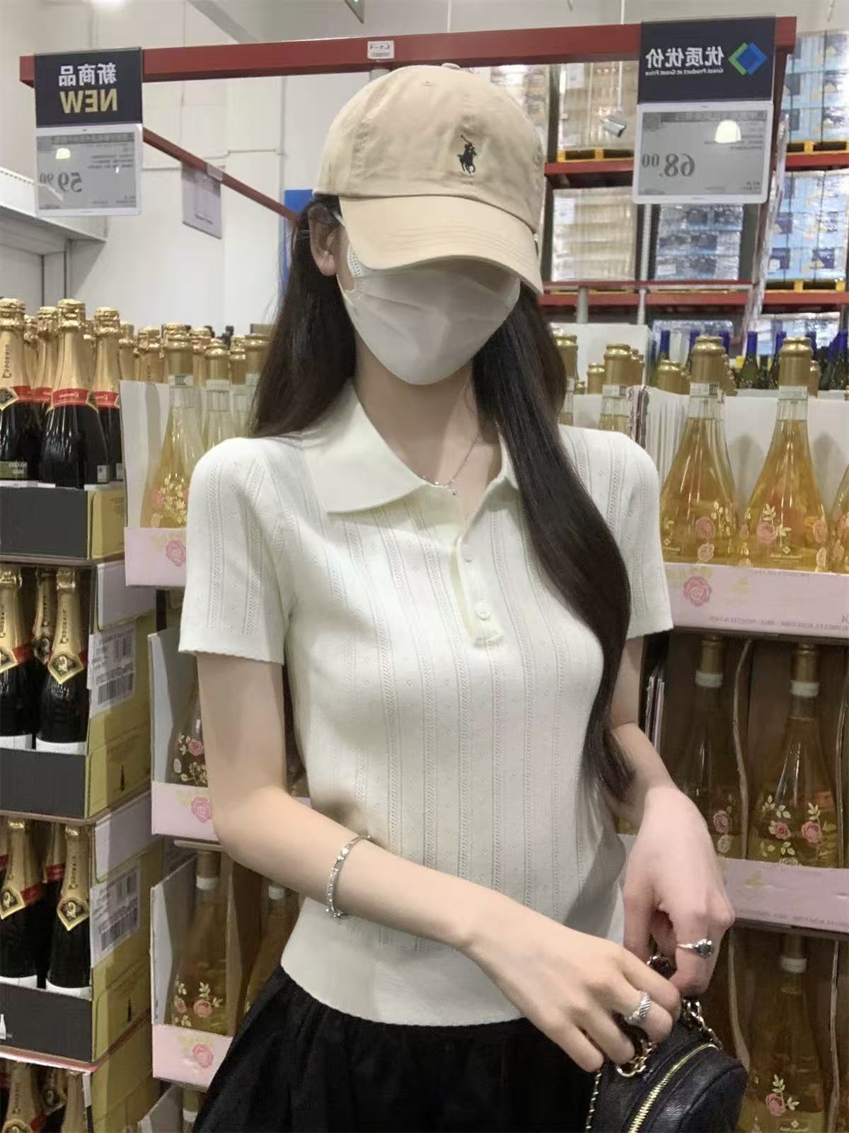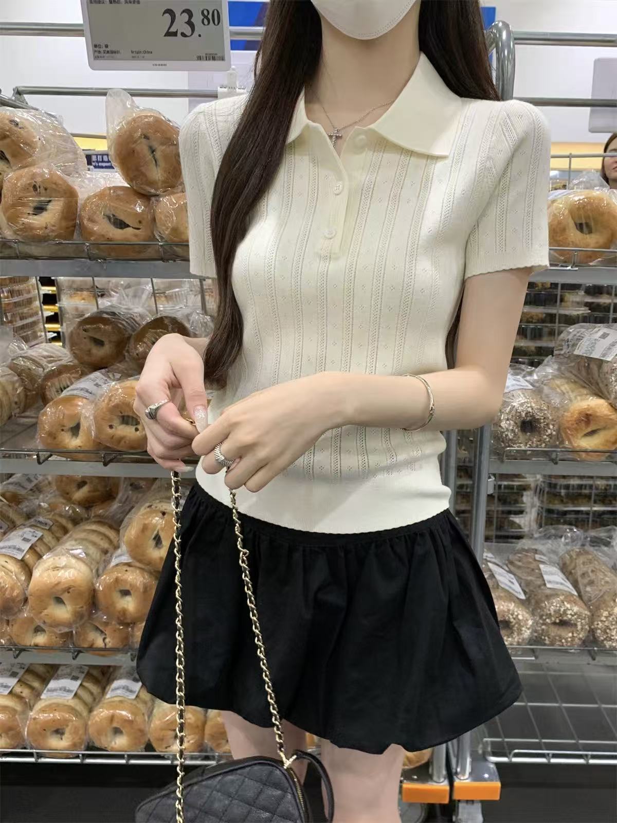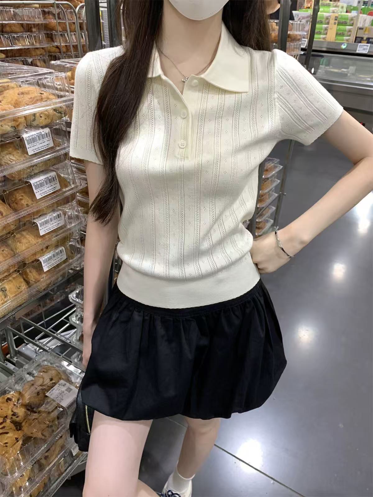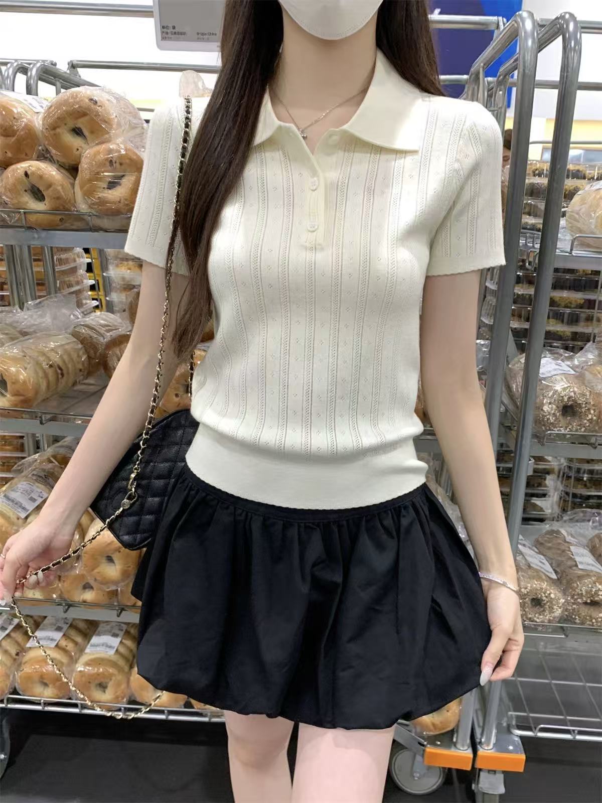 夏天巨好看的凉感polo领冰丝针织短袖t恤女韩系chic别致小衫上衣