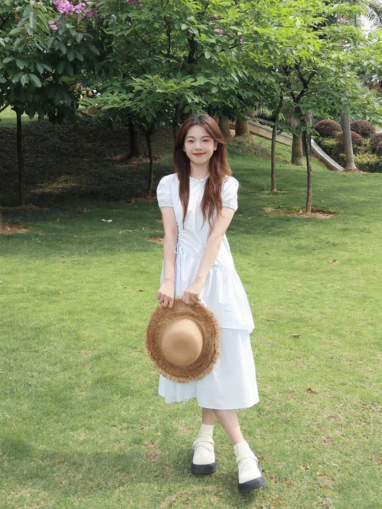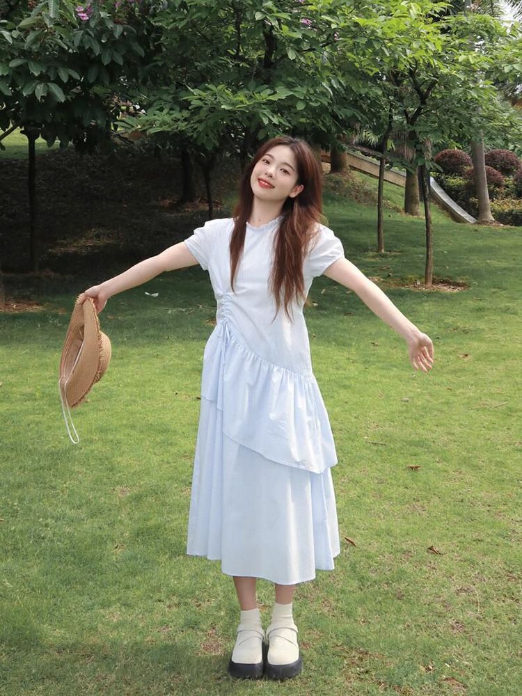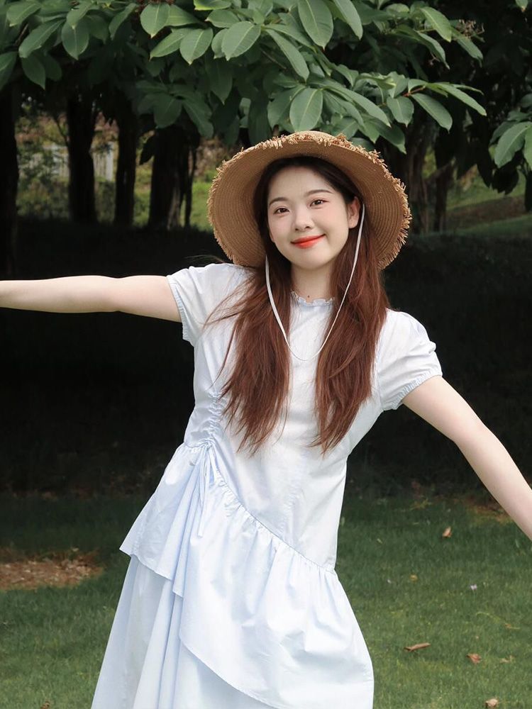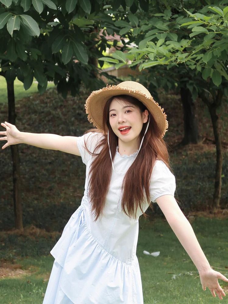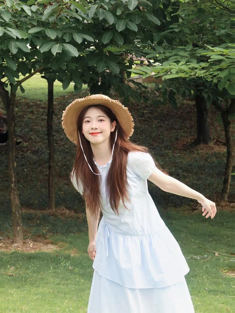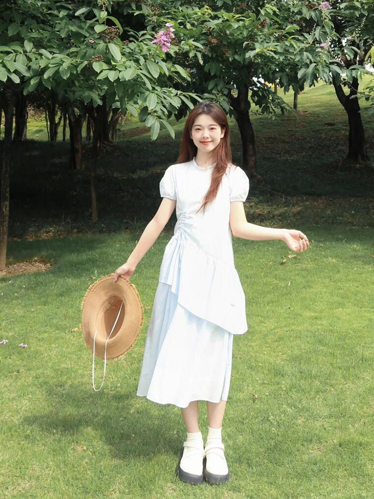 夏季法式奶甜温柔风蓝色抽绳收腰连衣裙小个子显瘦别致洋气长裙子