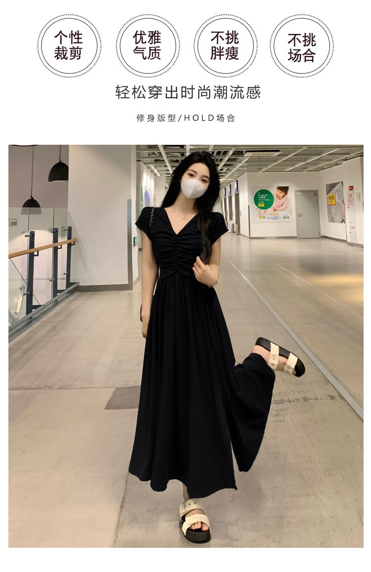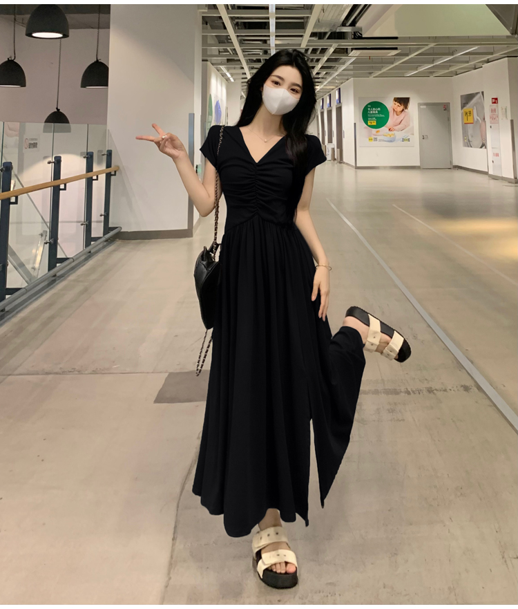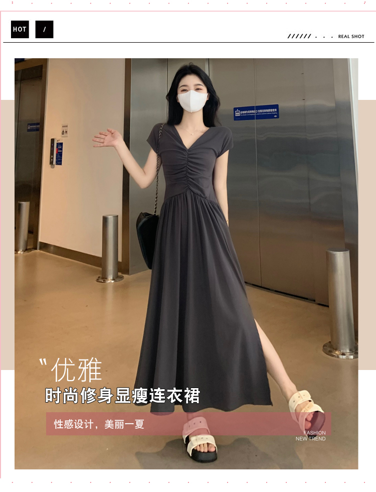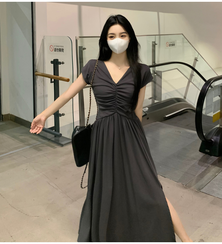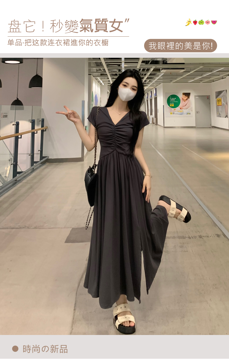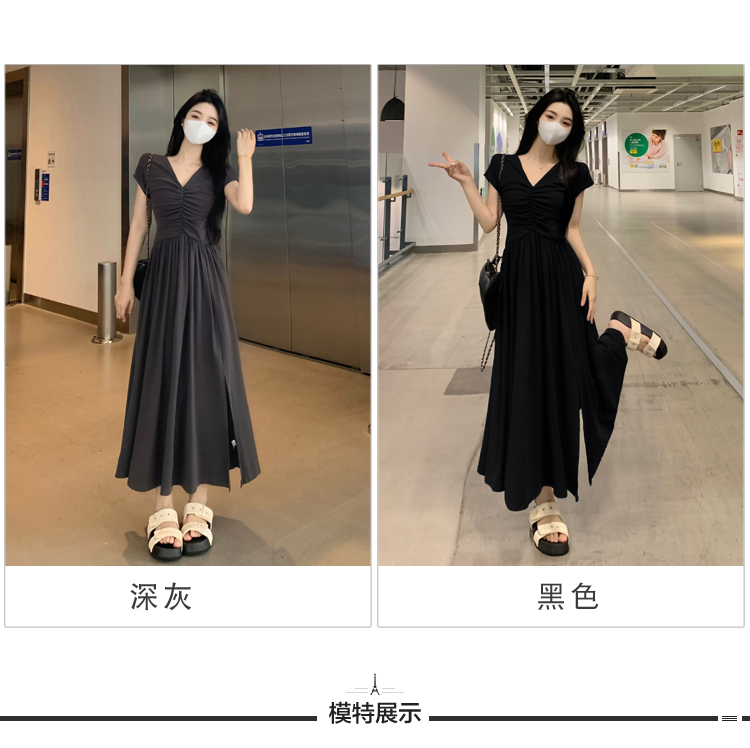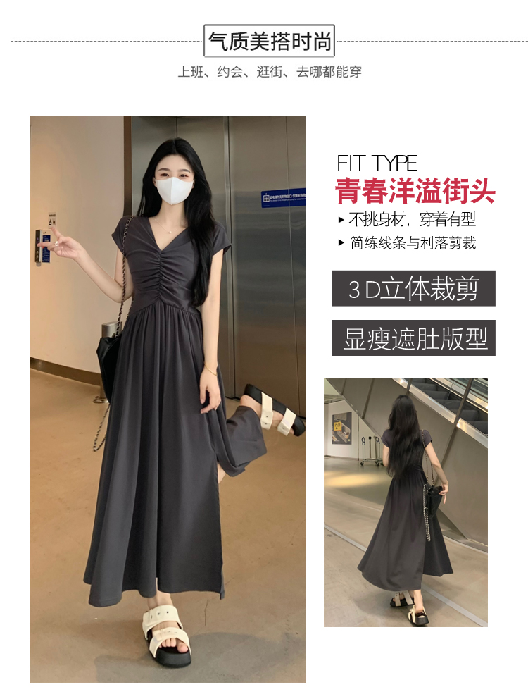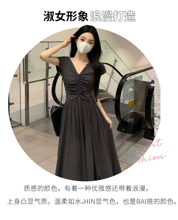 实拍~大码女装法式复古V领收腰连衣裙茶歇气质高级感度假开叉裙子