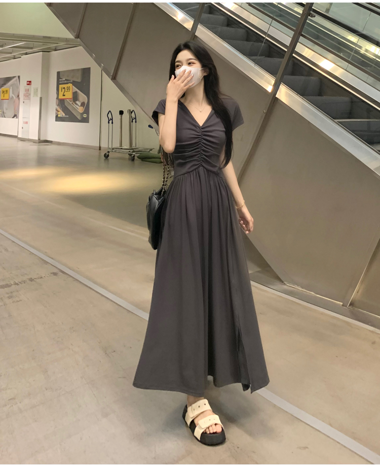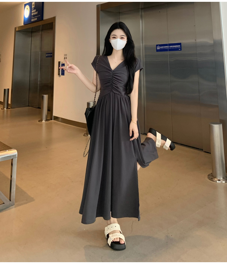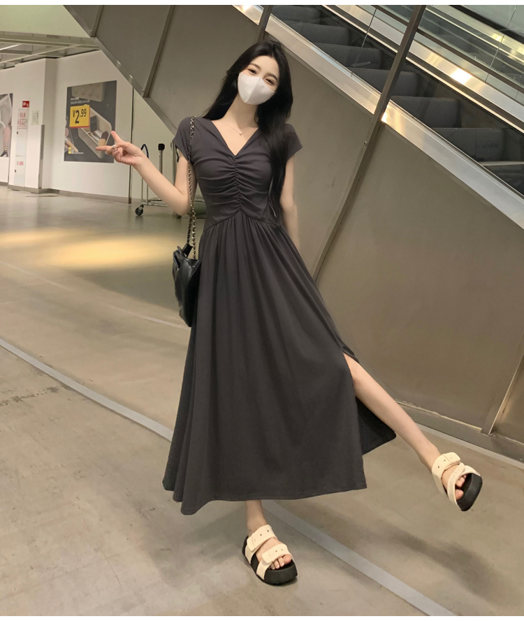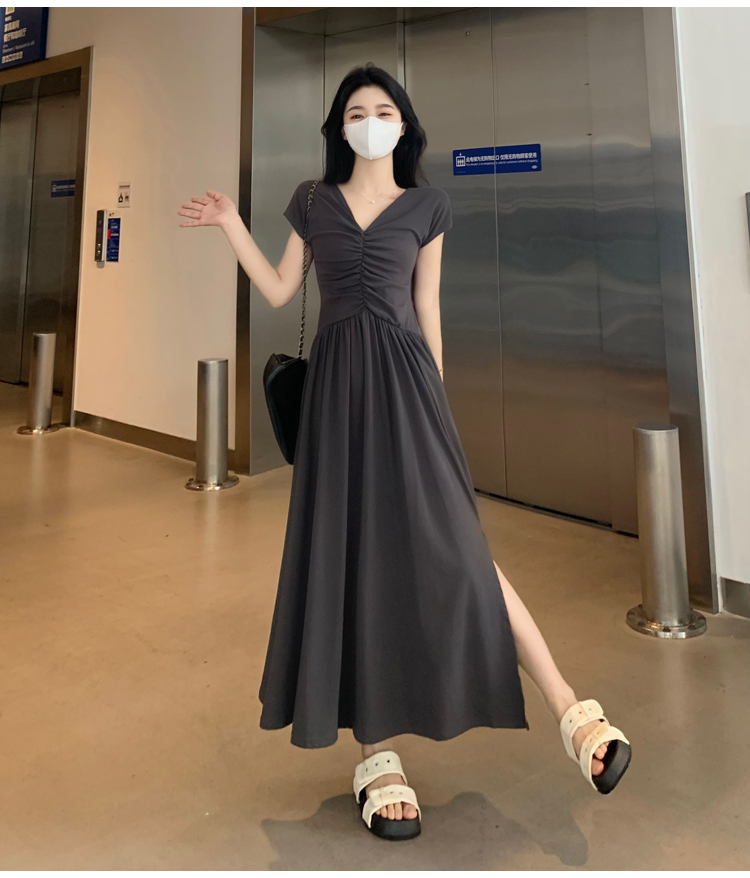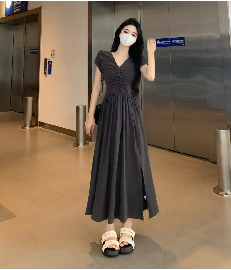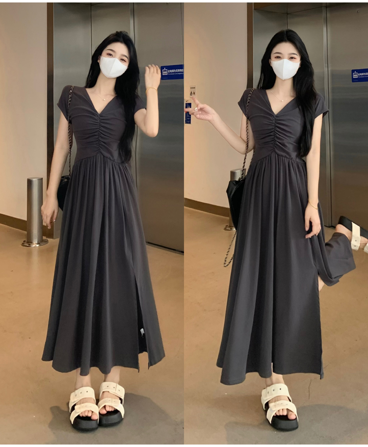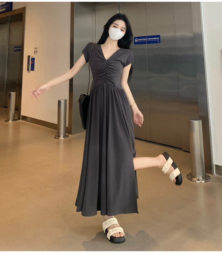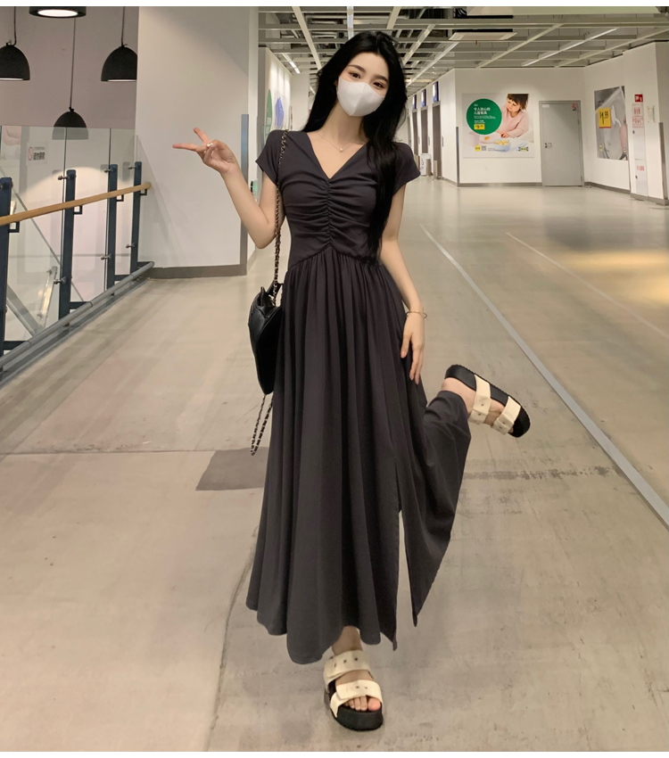 实拍~大码女装法式复古V领收腰连衣裙茶歇气质高级感度假开叉裙子