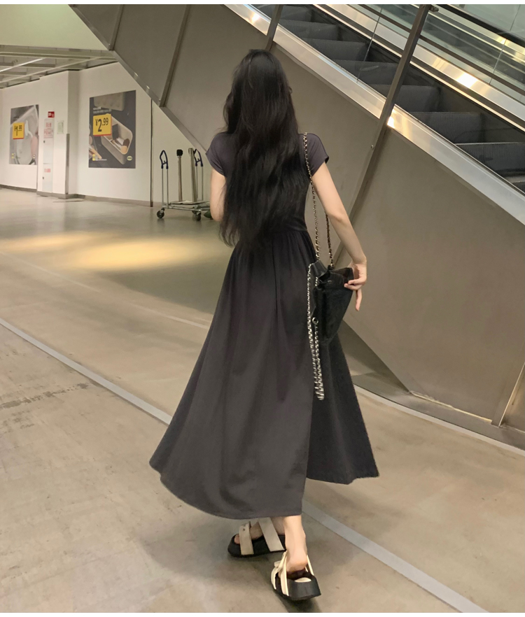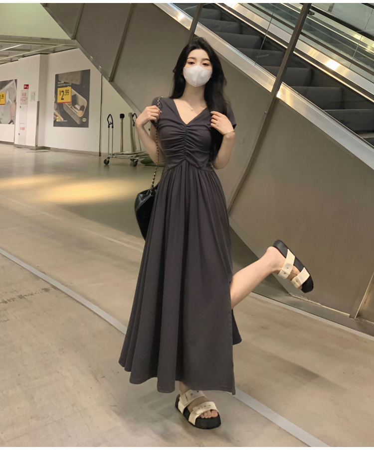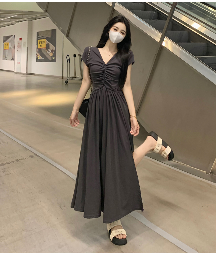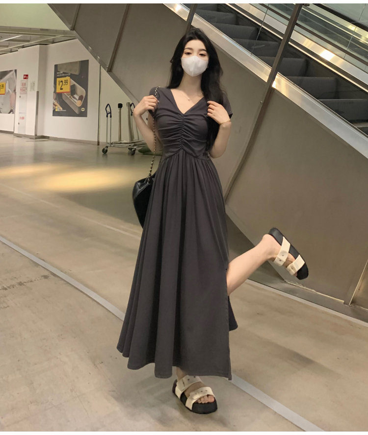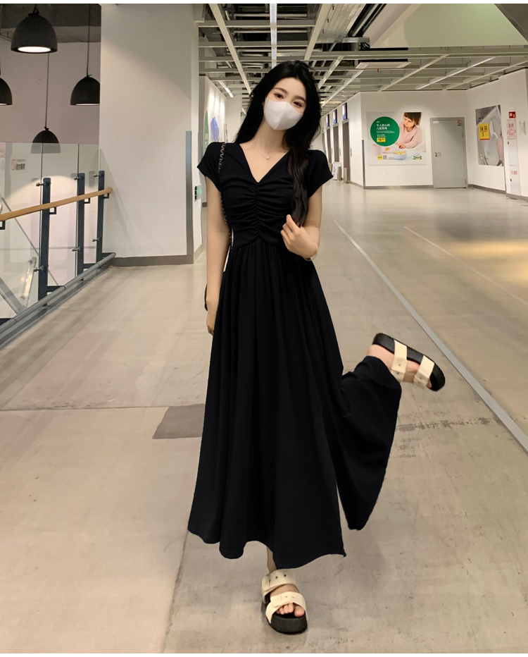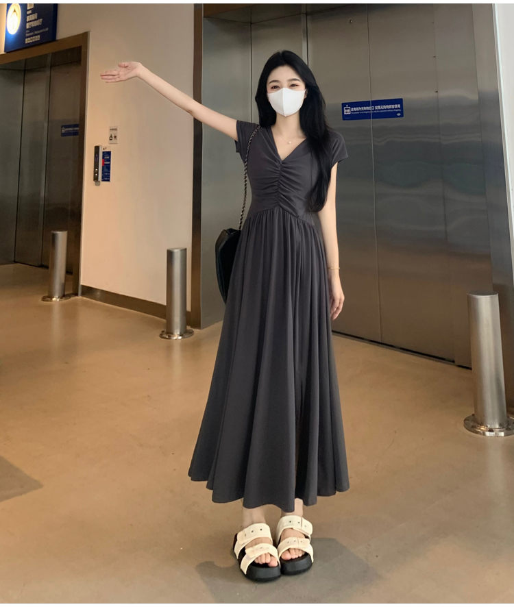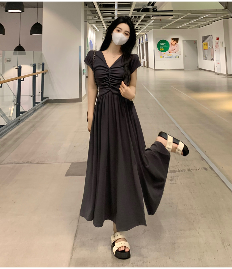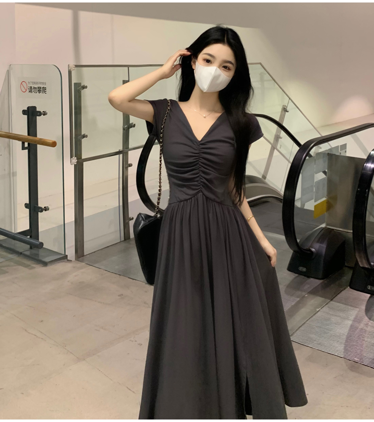 实拍~大码女装法式复古V领收腰连衣裙茶歇气质高级感度假开叉裙子
