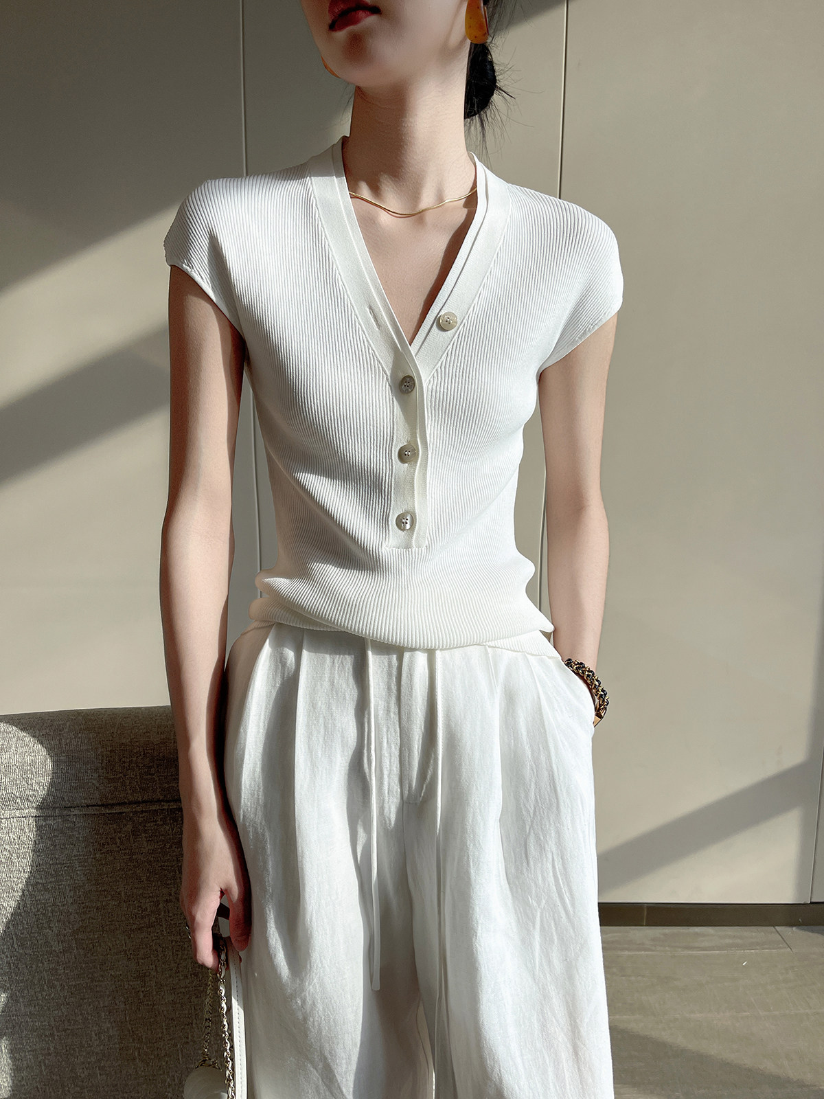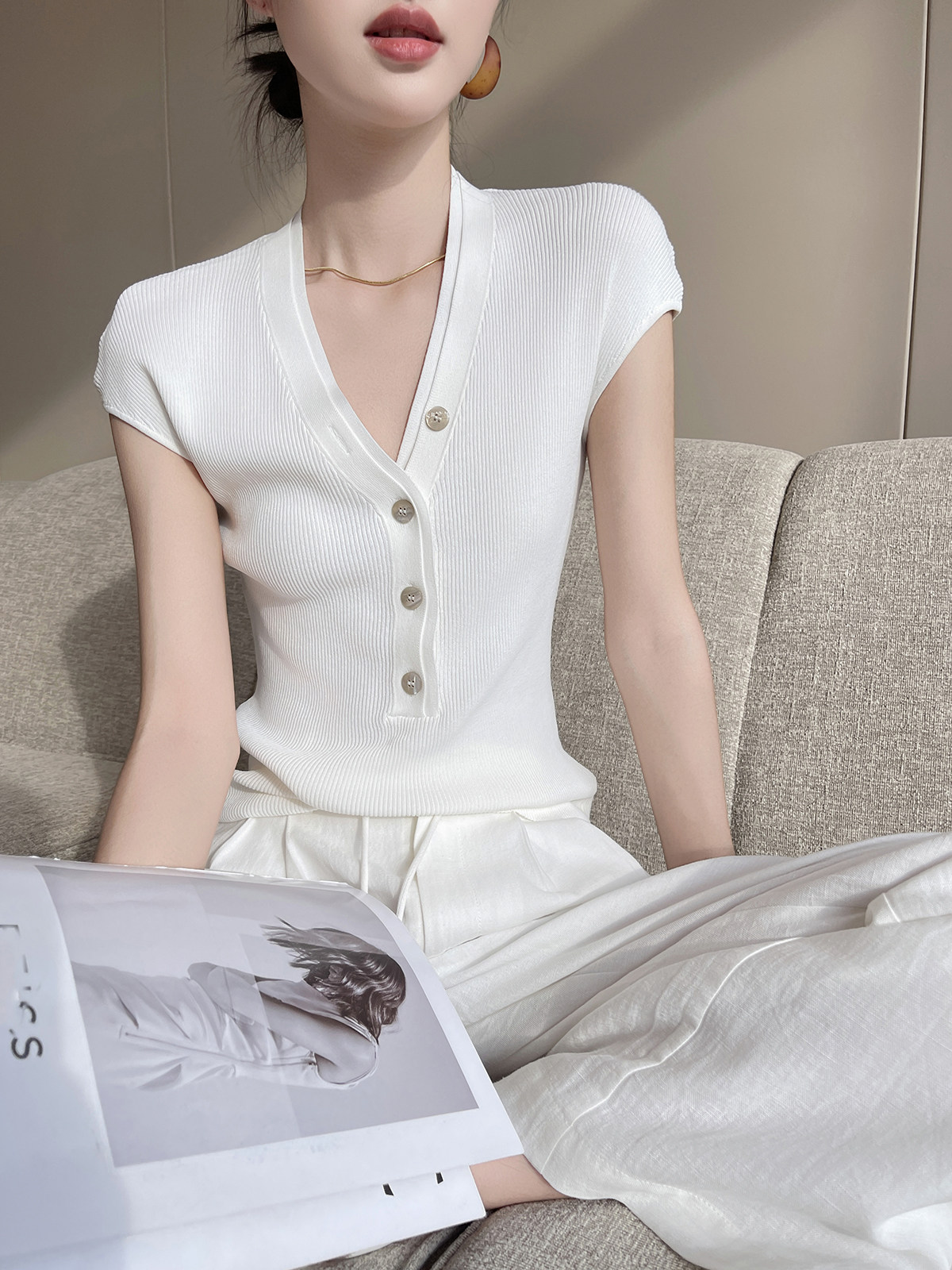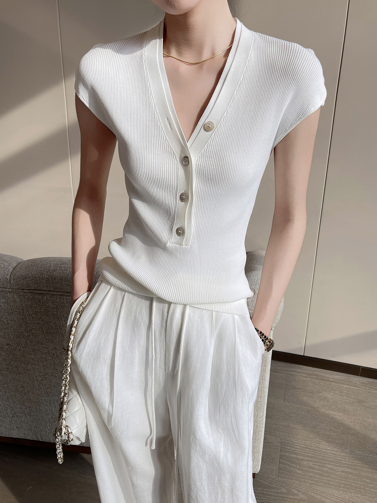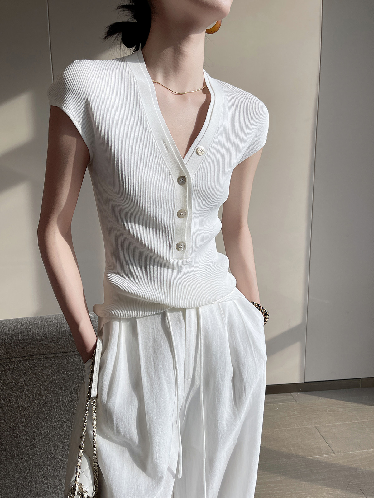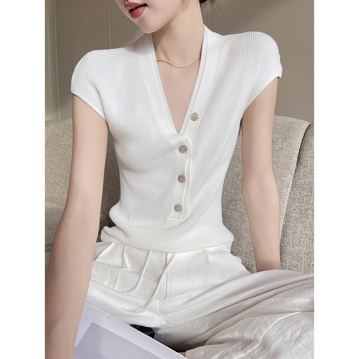 PINKEEN白色双层V领短袖T恤女夏季2026新款修身时尚简约气质上衣