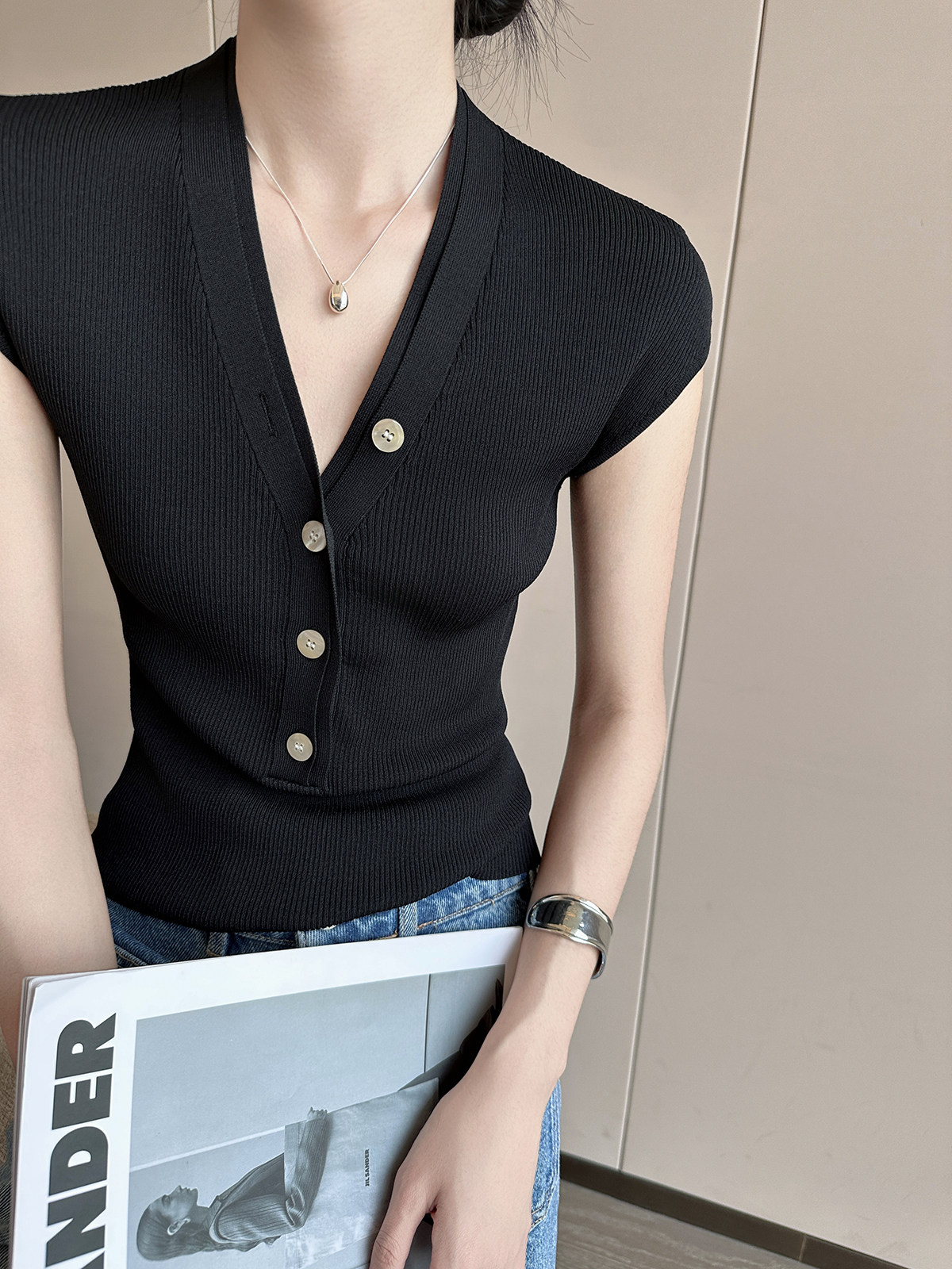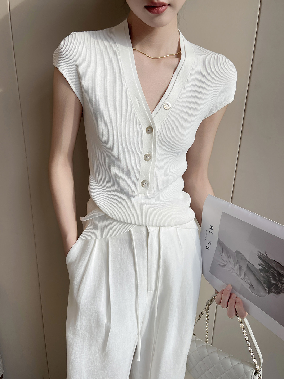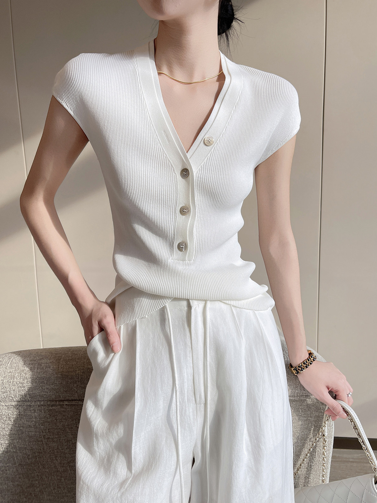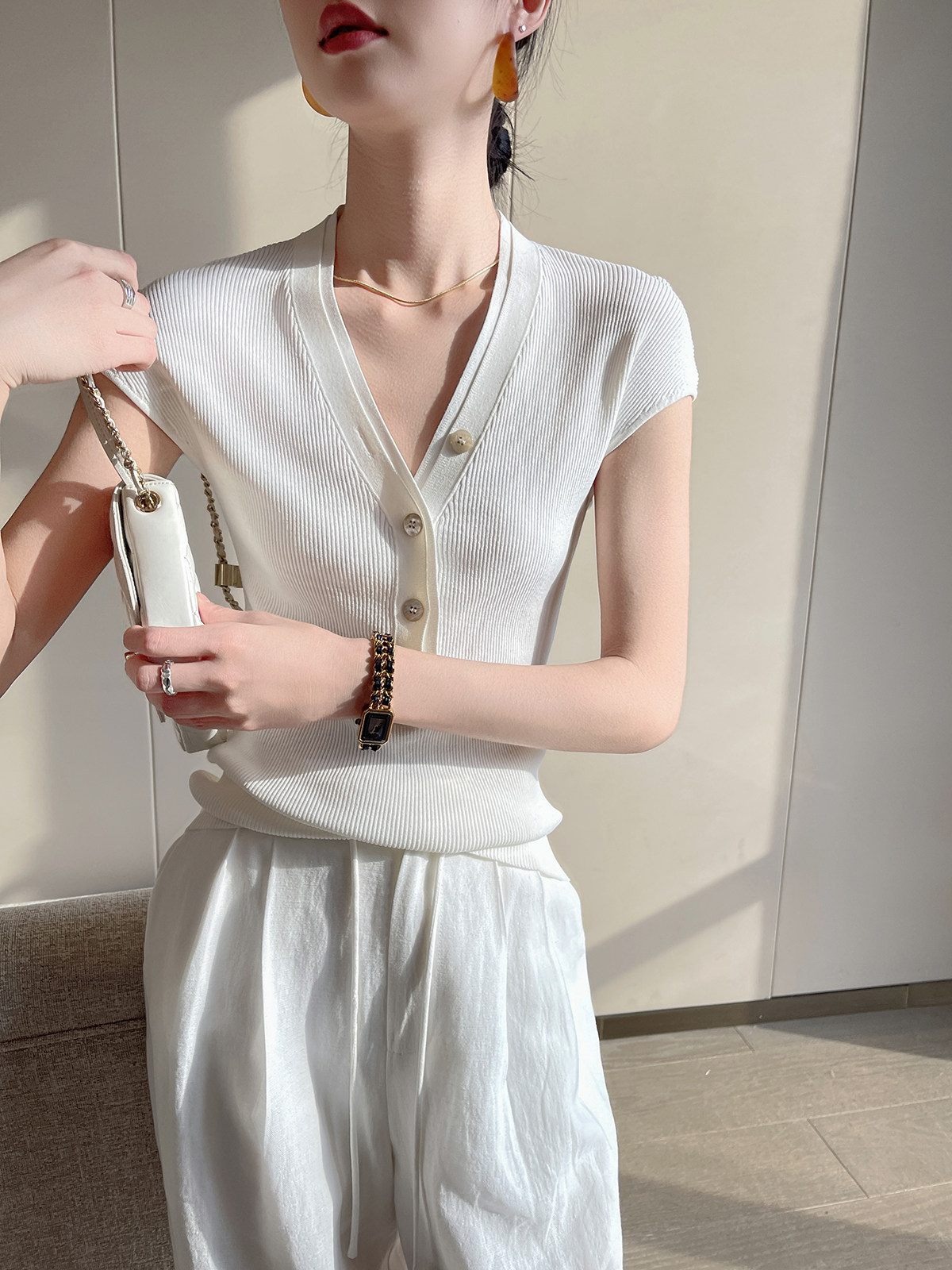 PINKEEN白色双层V领短袖T恤女夏季2026新款修身时尚简约气质上衣
