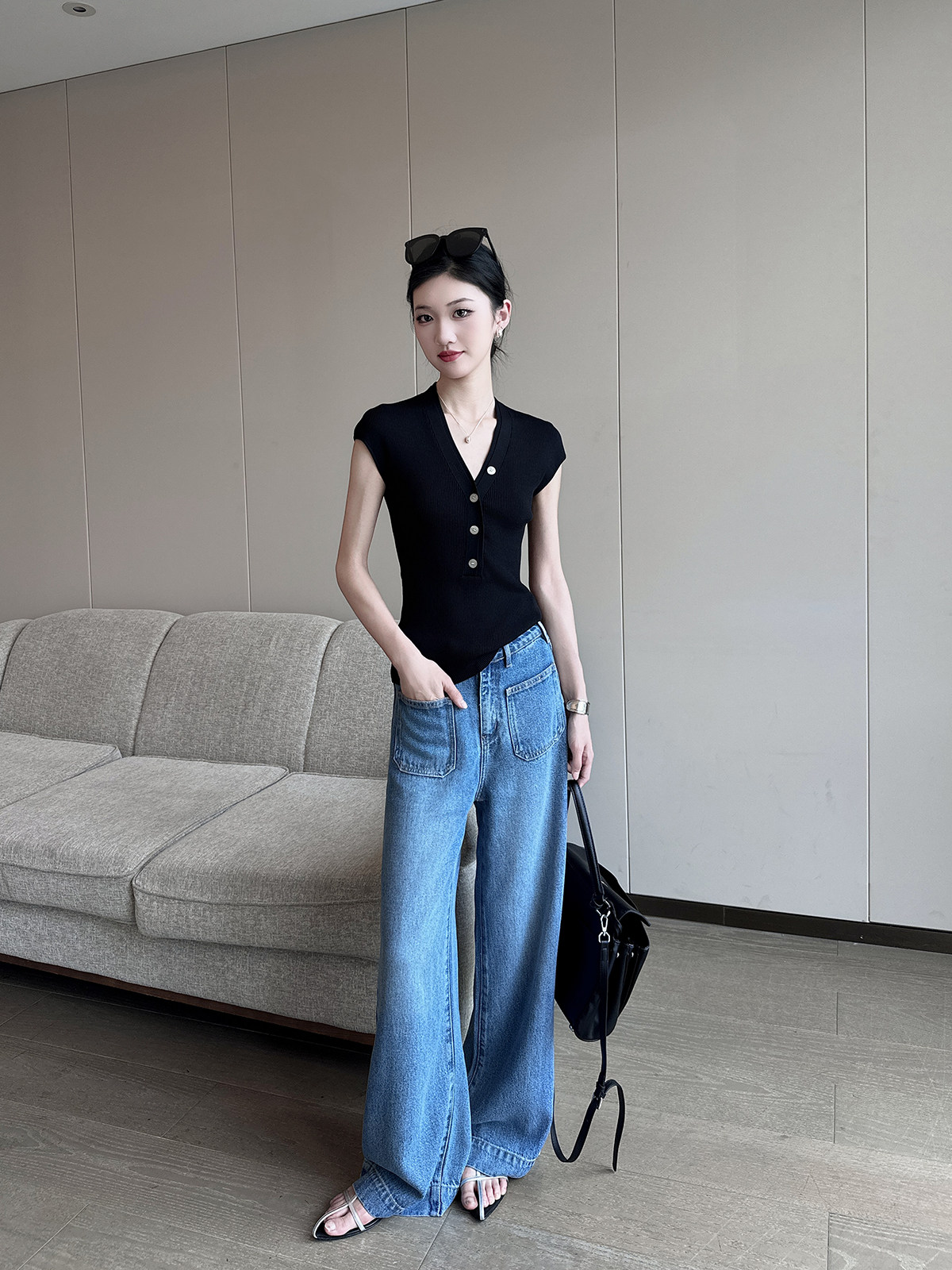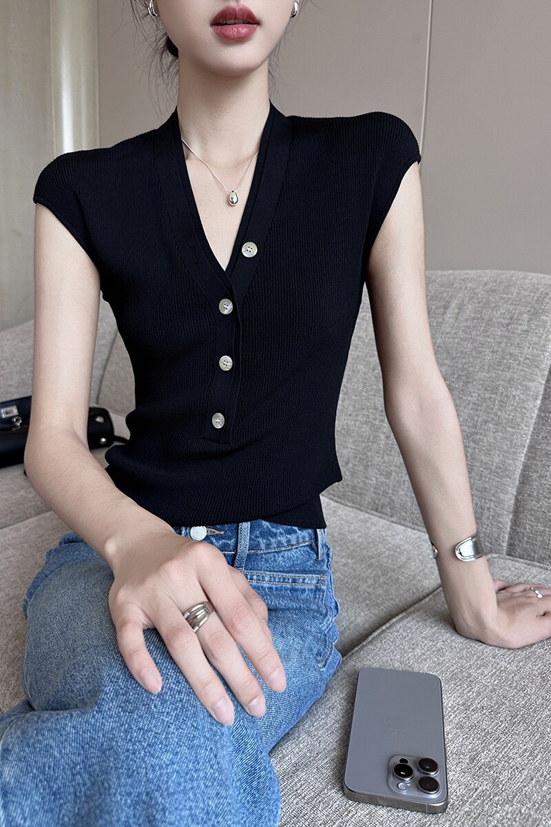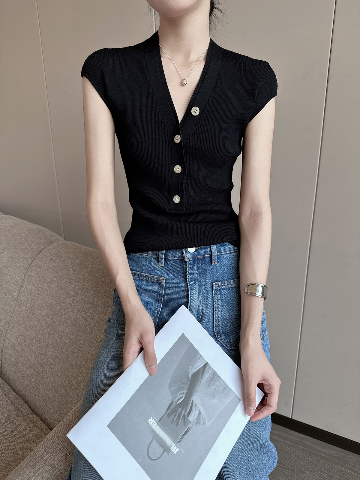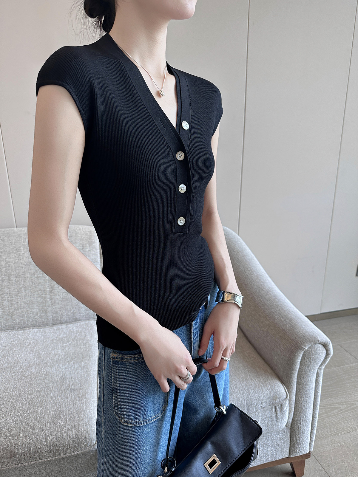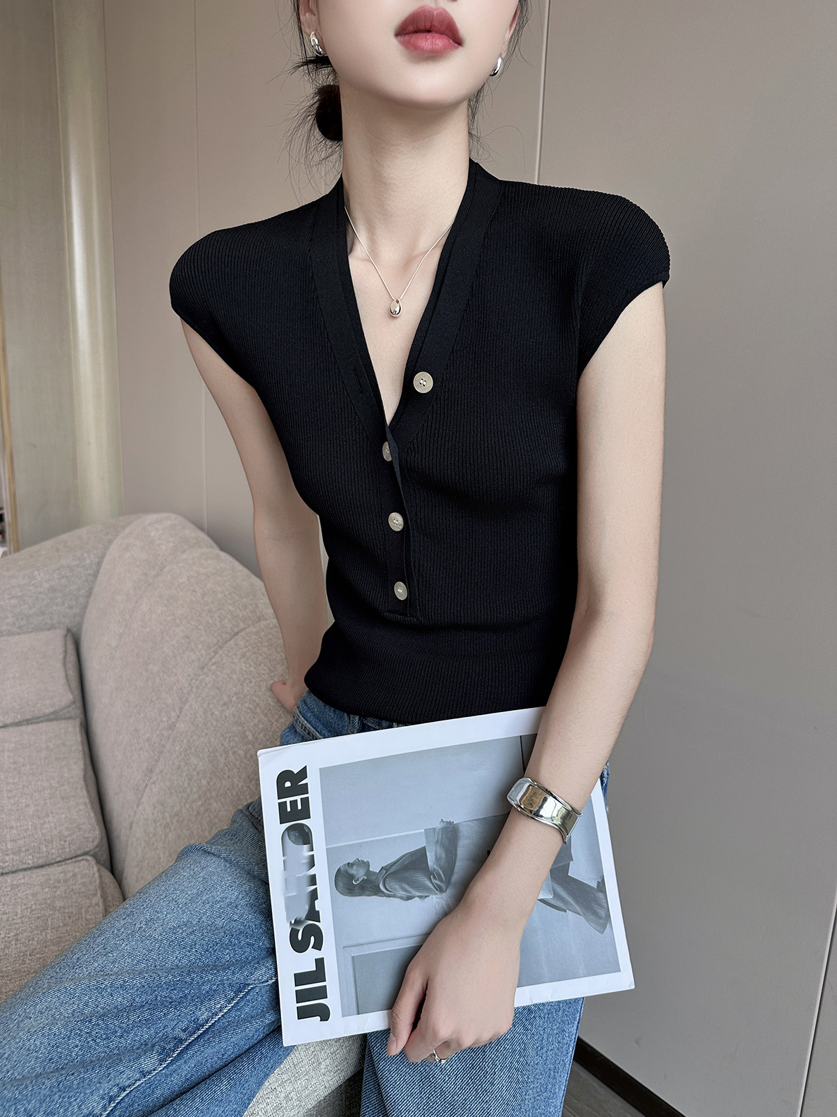 PINKEEN白色双层V领短袖T恤女夏季2026新款修身时尚简约气质上衣