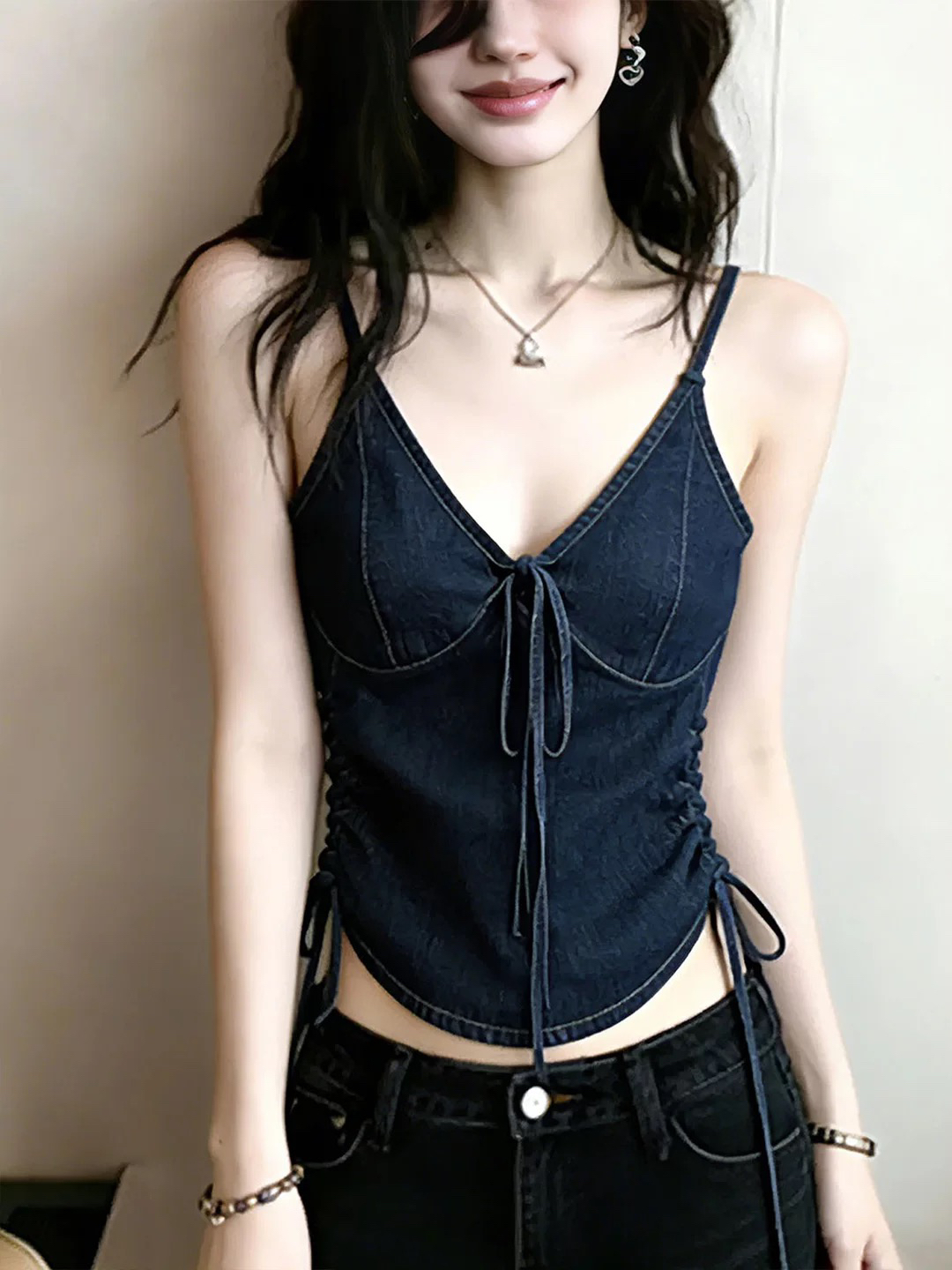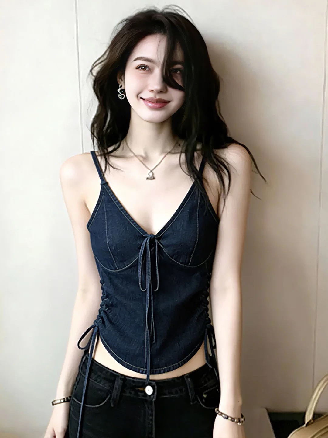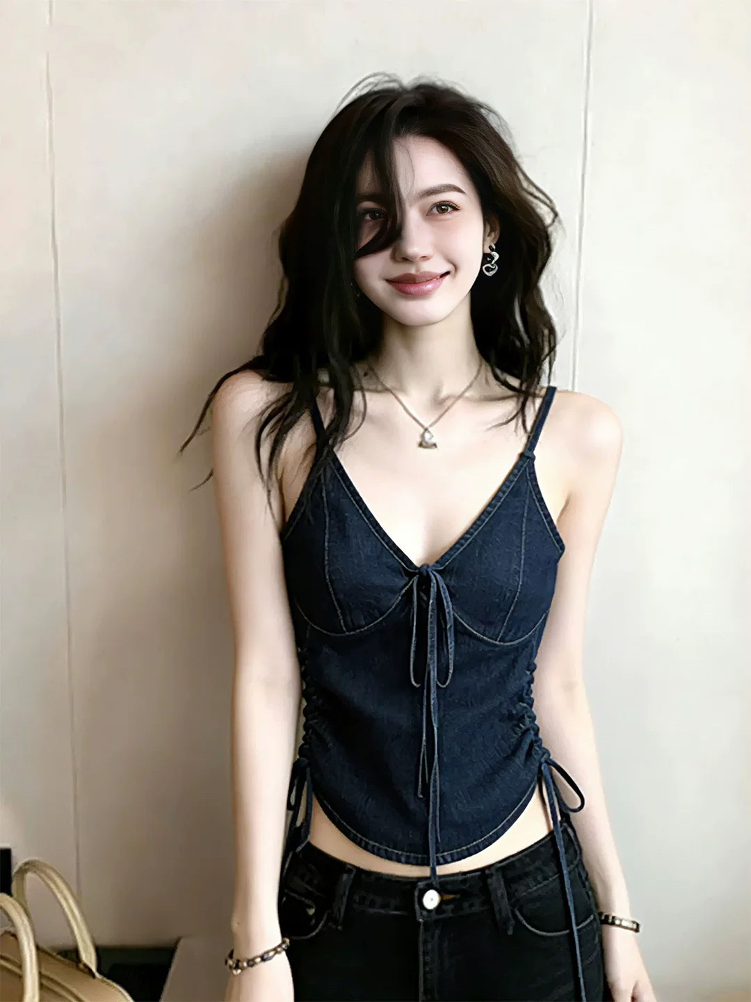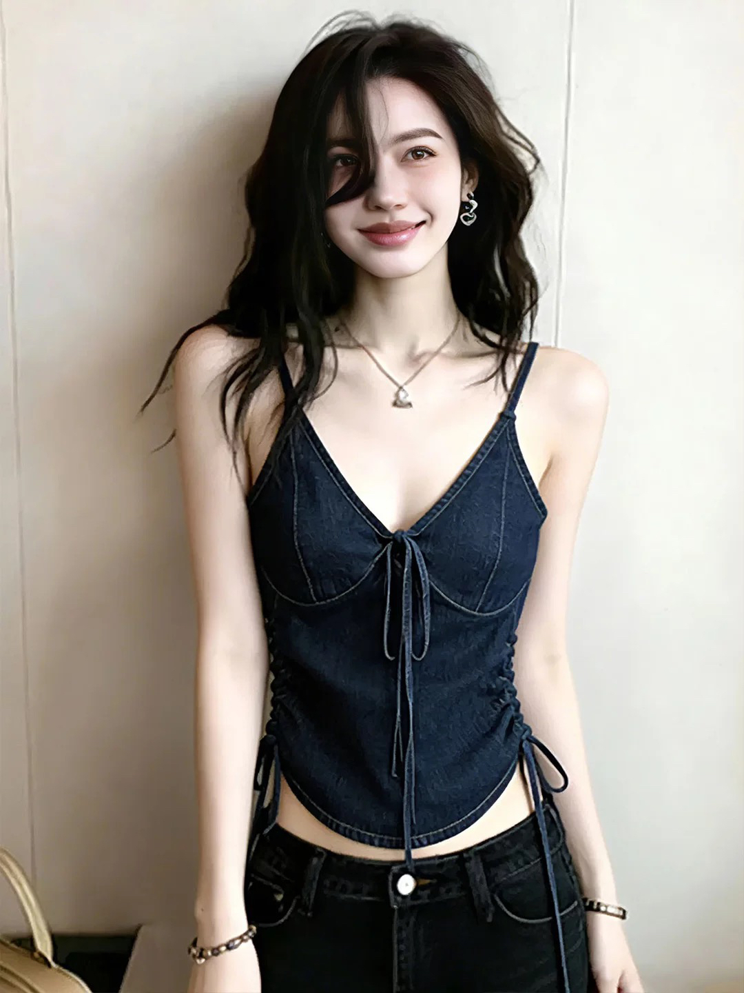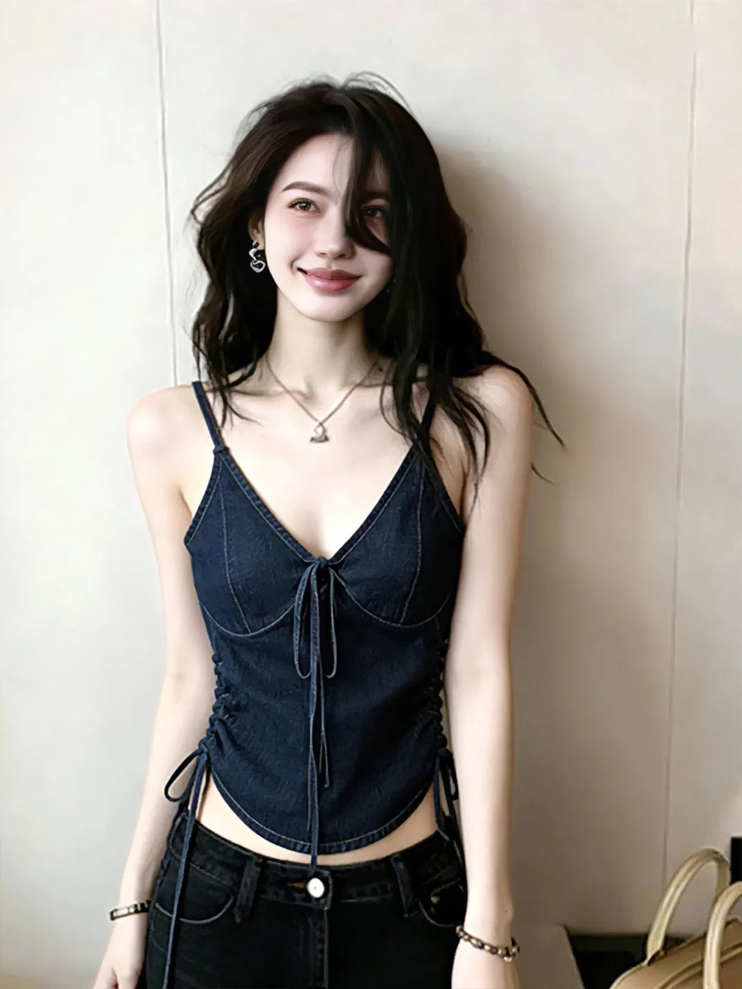 蓝色牛仔吊带上衣女2026春季气质高级感时髦洋气巨好看系带背心